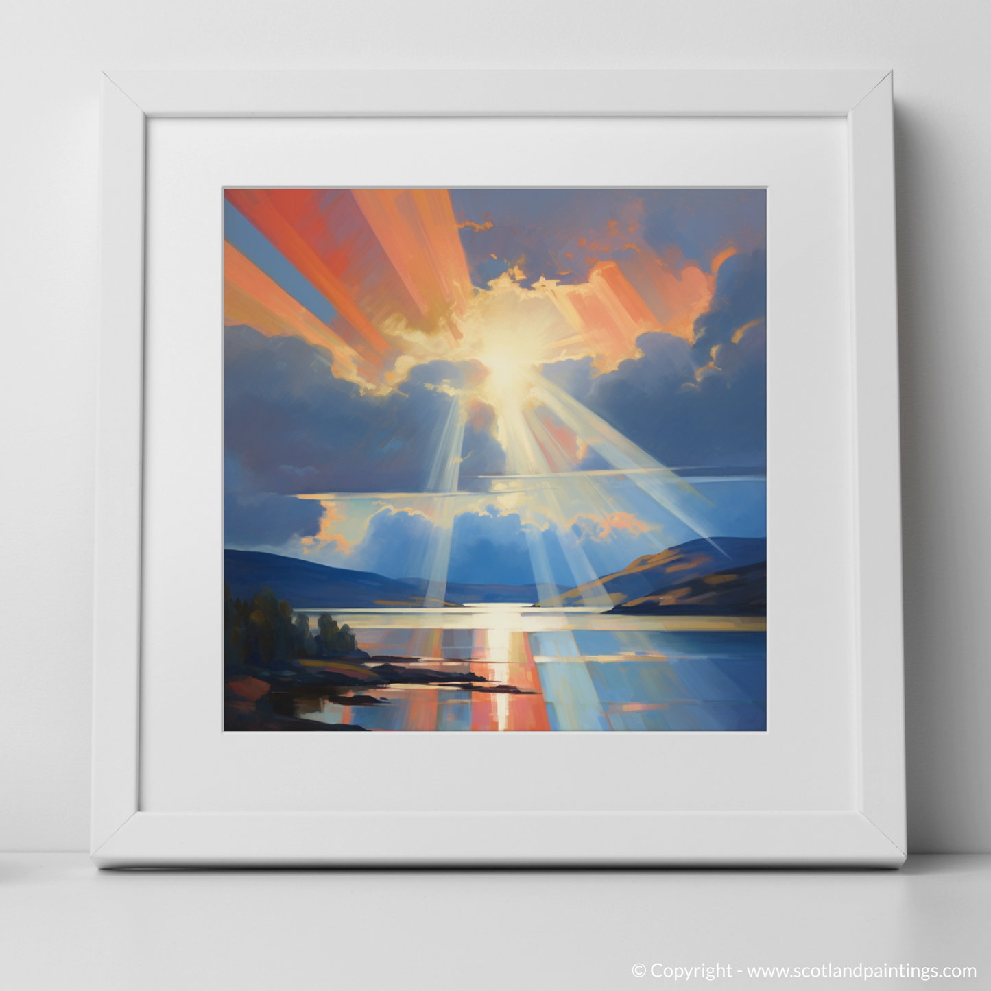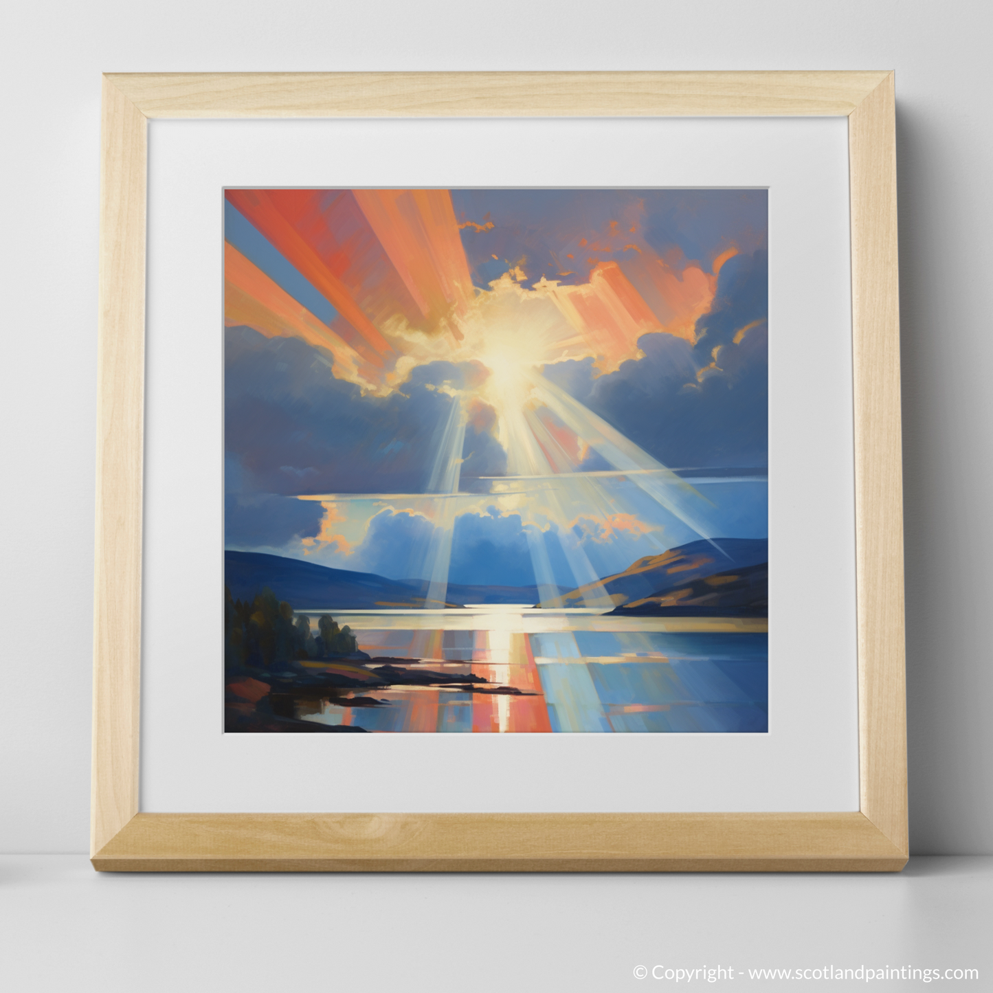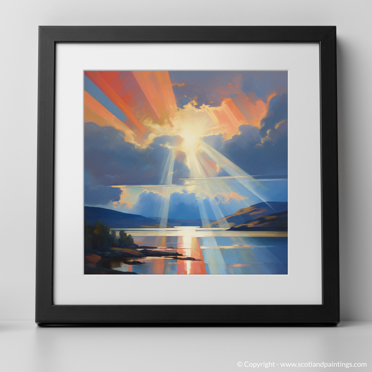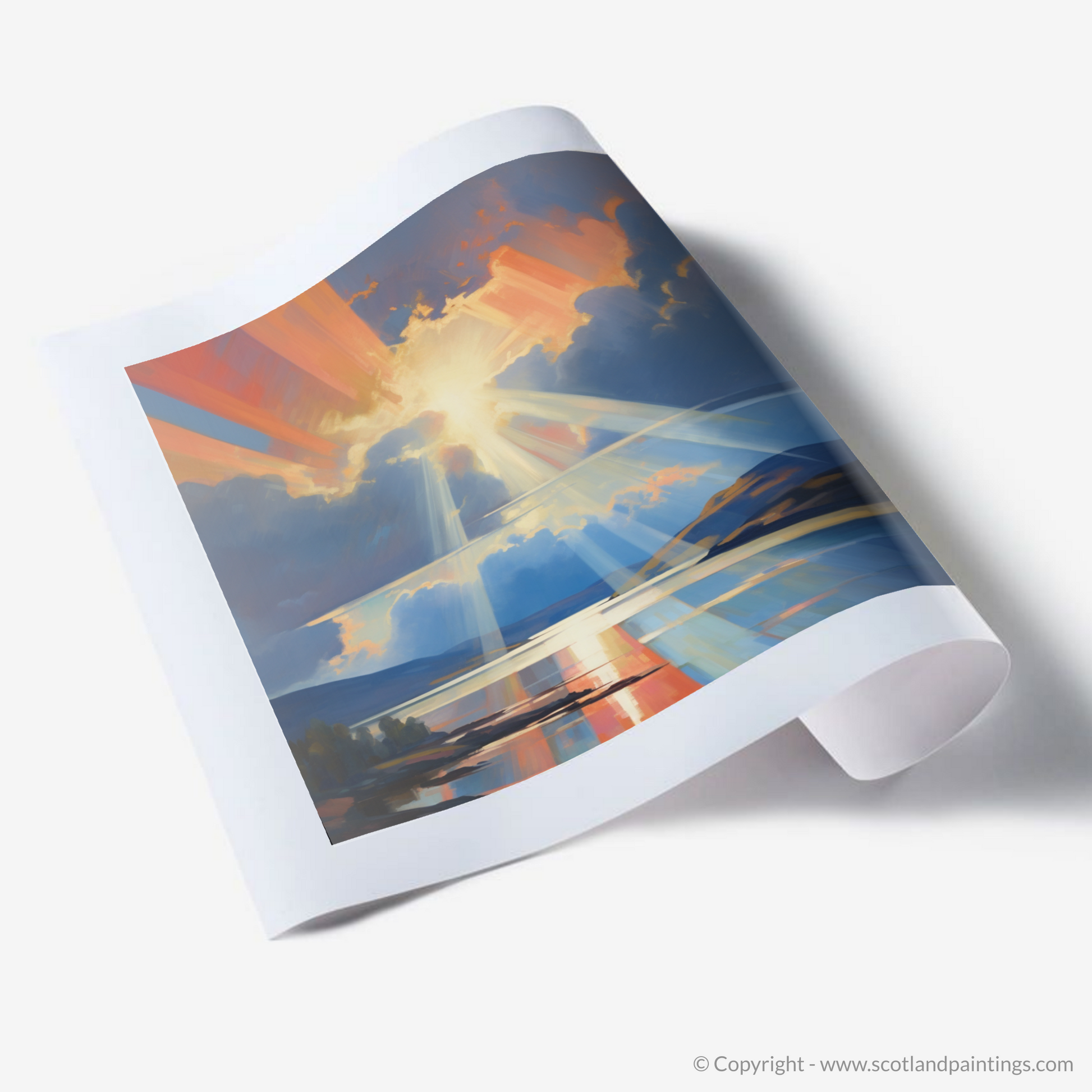 Captured in this evocative print is the majestic essence of Loch Lomond, bathed in the ethereal glow of crepuscular rays. The scene unfolds under a dramatic expanse of sky where the sun, partially hidden behind dense cumulus clouds, casts a radiant display of light beams that pierce the heavens and reflect upon the tranquil waters below.
