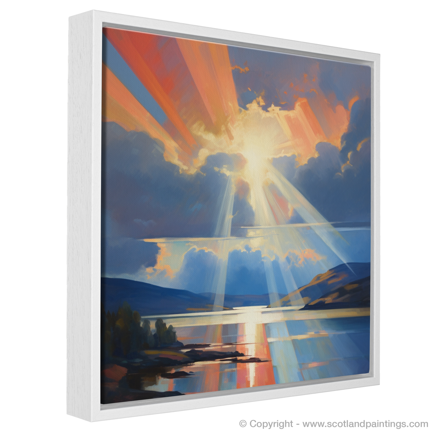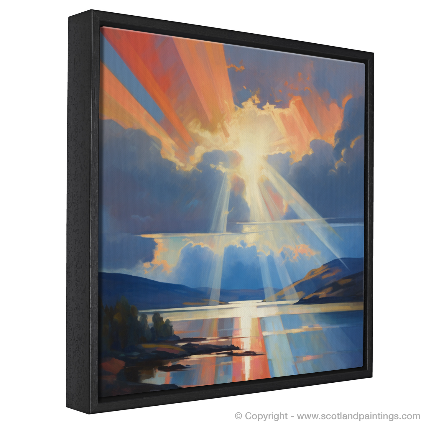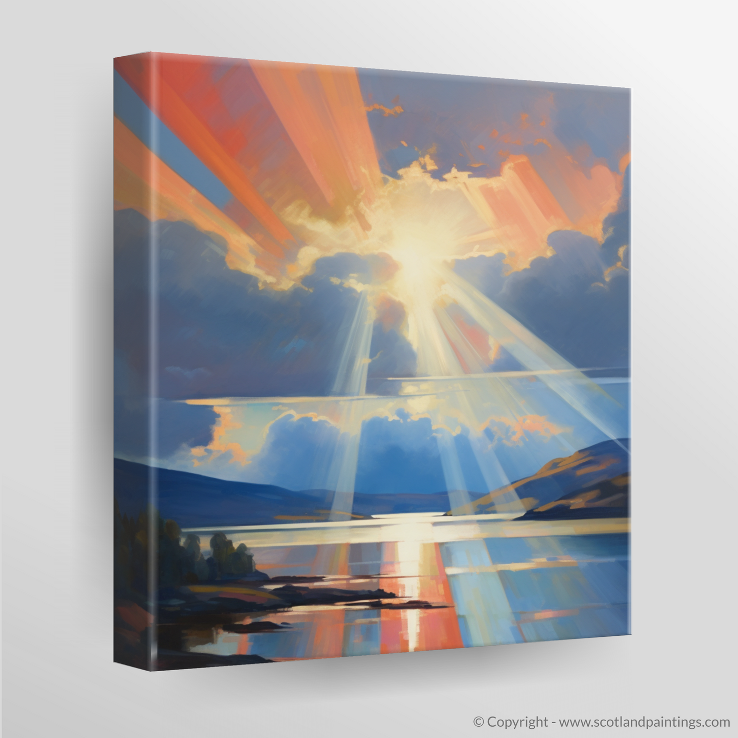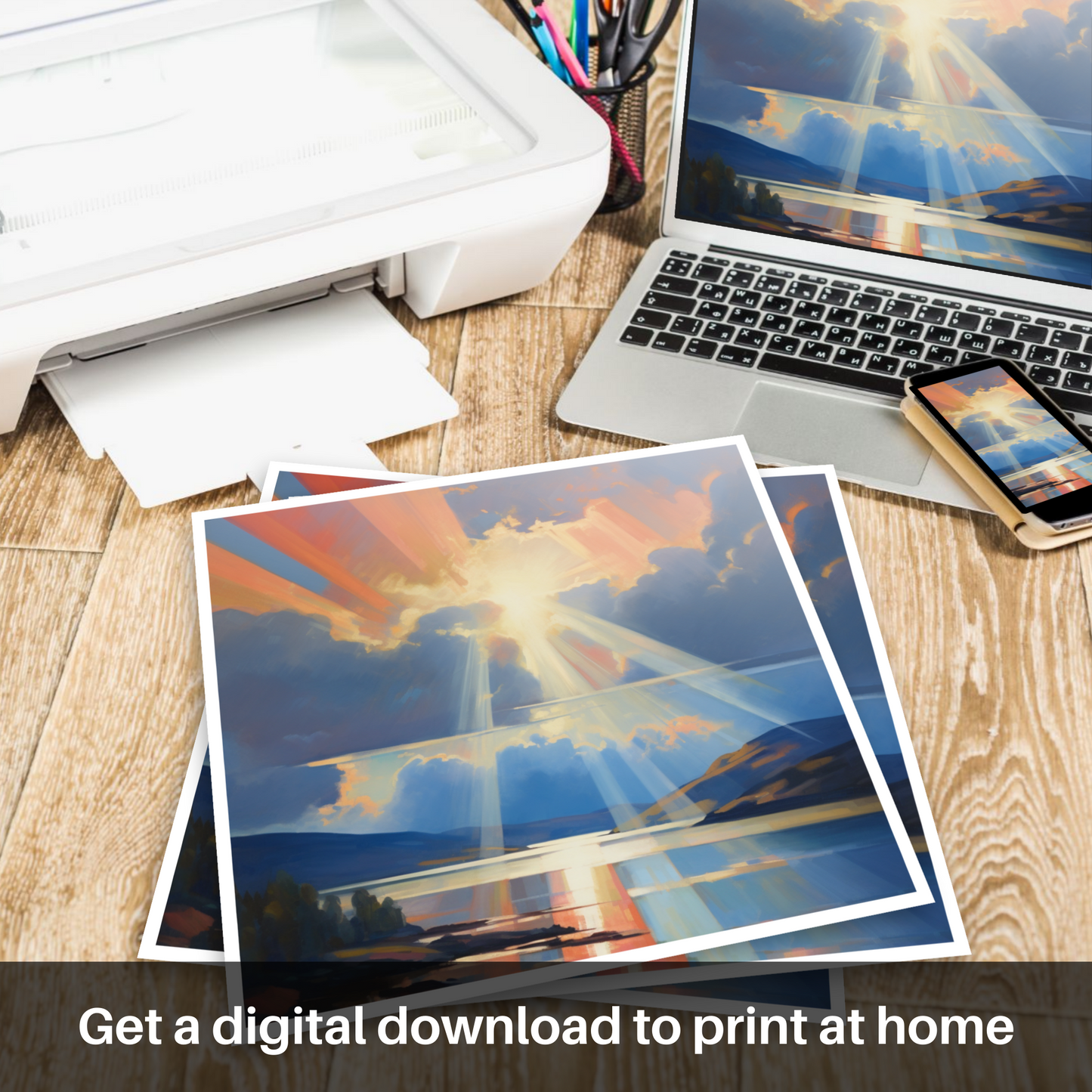 Captured in this evocative print is the majestic essence of Loch Lomond, bathed in the ethereal glow of crepuscular rays. The scene unfolds under a dramatic expanse of sky where the sun, partially hidden behind dense cumulus clouds, casts a radiant display of light beams that pierce the heavens and reflect upon the tranquil waters below.