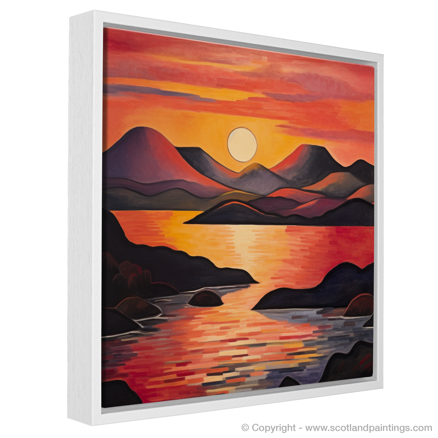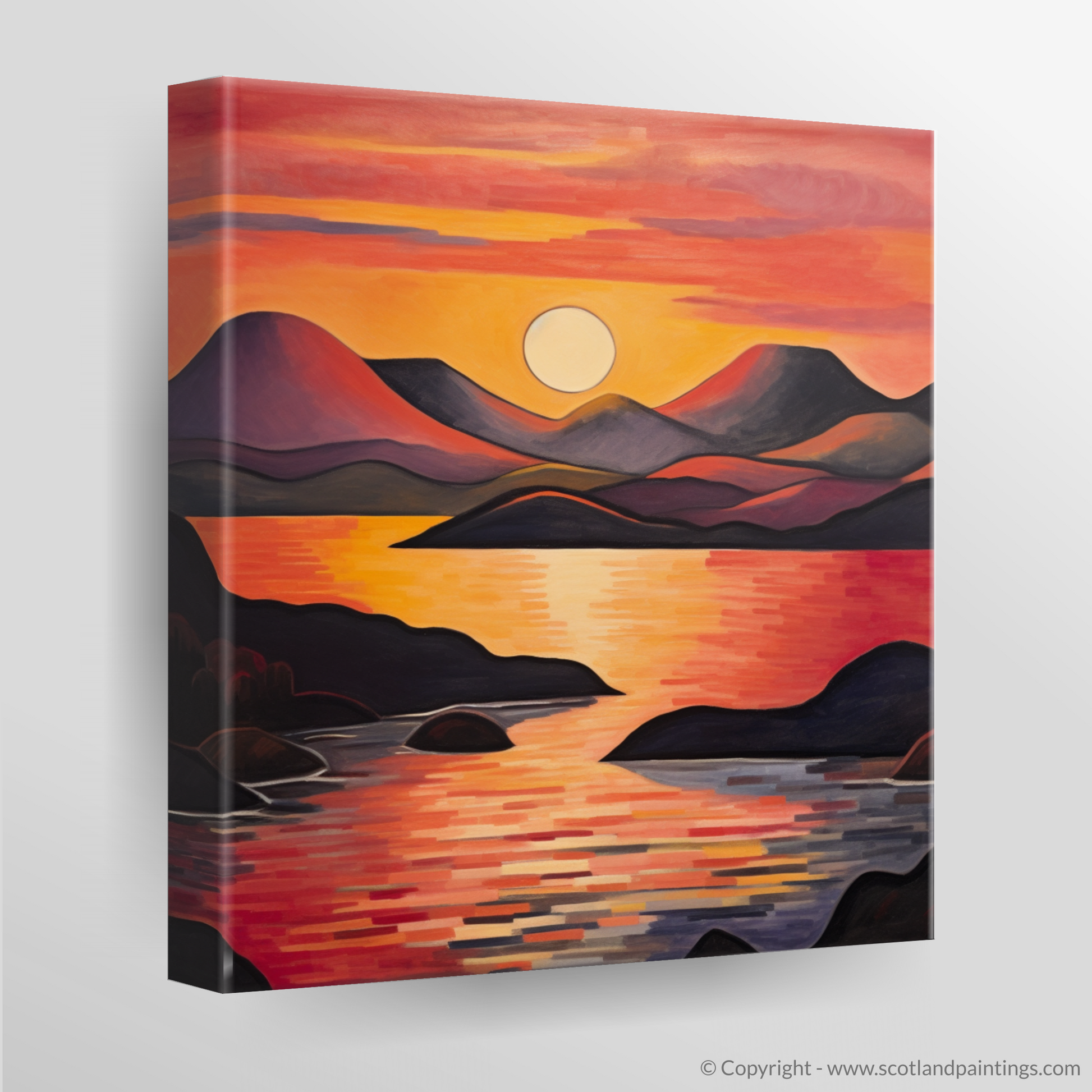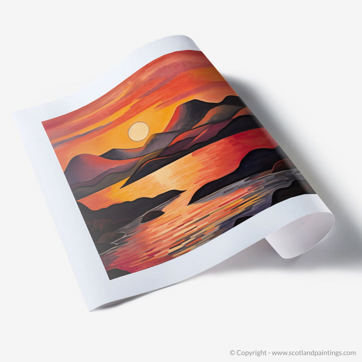 Captivate your senses with this evocative abstract interpretation of a sunset over Loch Lomond. The scene is a vibrant tapestry of warm hues, where fiery oranges, deep reds, and soothing purples blend seamlessly across the canvas, depicting the sky's reflection on the serene waters below. A radiant orb of soft white light sits low in the sky, suggesting the sun's descent behind the silhouette of rolling hills.