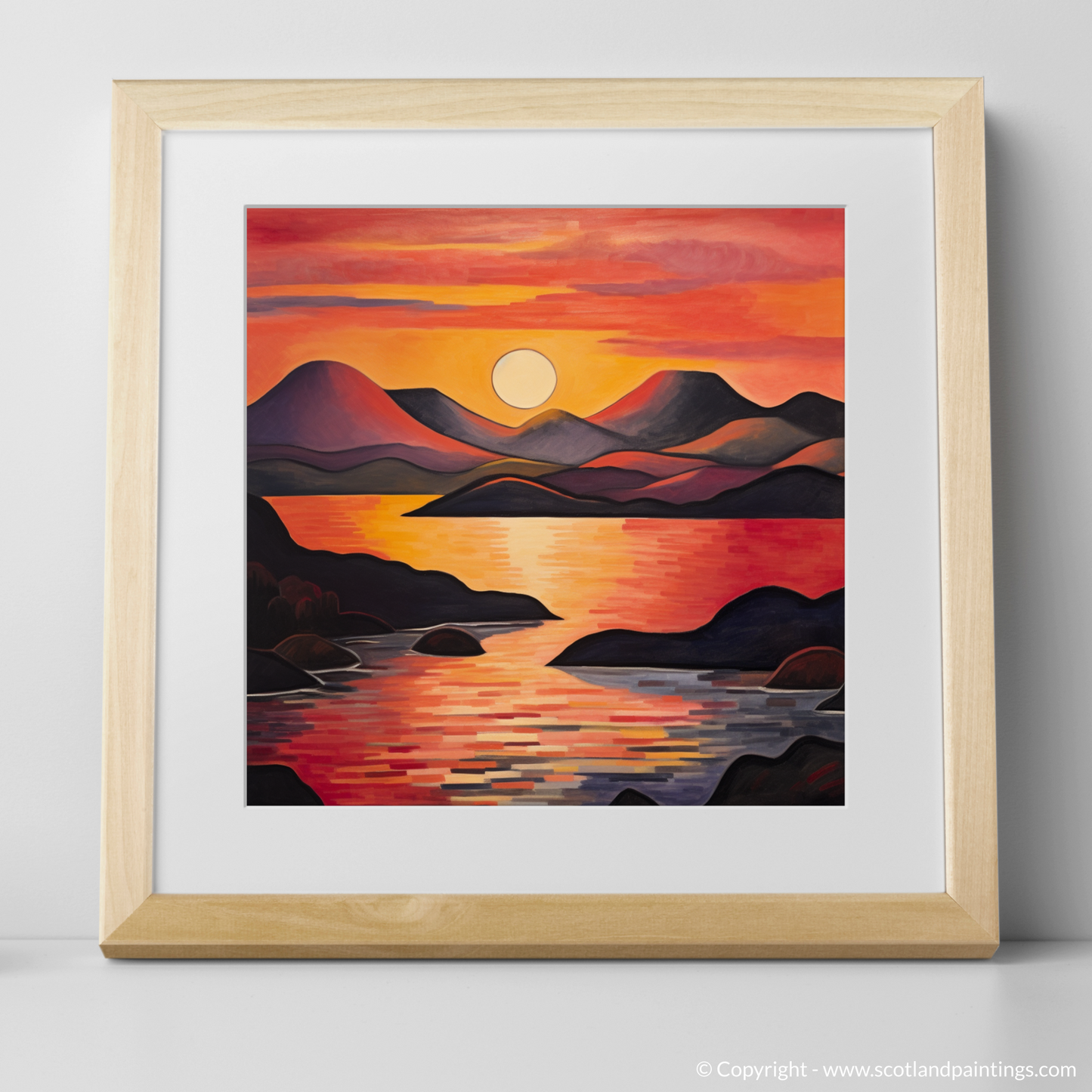 The landscape is simplified, emphasizing flowing lines and organic shapes that capture the essence of Loch Lomond's natural beauty without delving into realistic detail. Darker tones outline the undulating forms of the hills, while the water is a mosaic of reflected light, broken into abstract, pixel-like strokes that dance with the tranquility and dynamism of the setting sun's reflection.