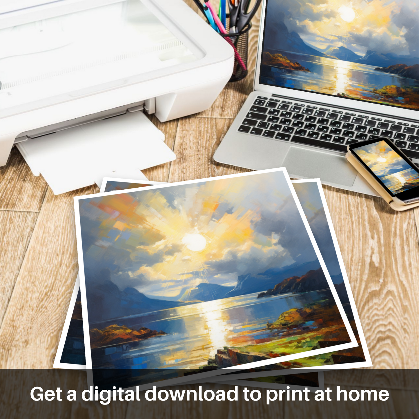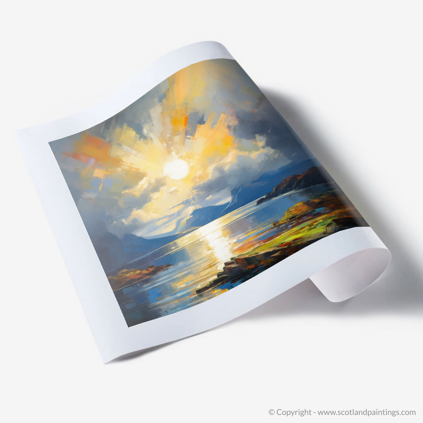 This print offers more than a mere depiction of a Scottish loch; it is an invitation to experience a moment of sublime natural beauty, rendered with passionate abstraction that beckons one to pause and reflect. It is a piece that would not only grace any space with its visual splendour but also stir the soul with its majestic portrayal of light’s triumph over the fleeting shadows.