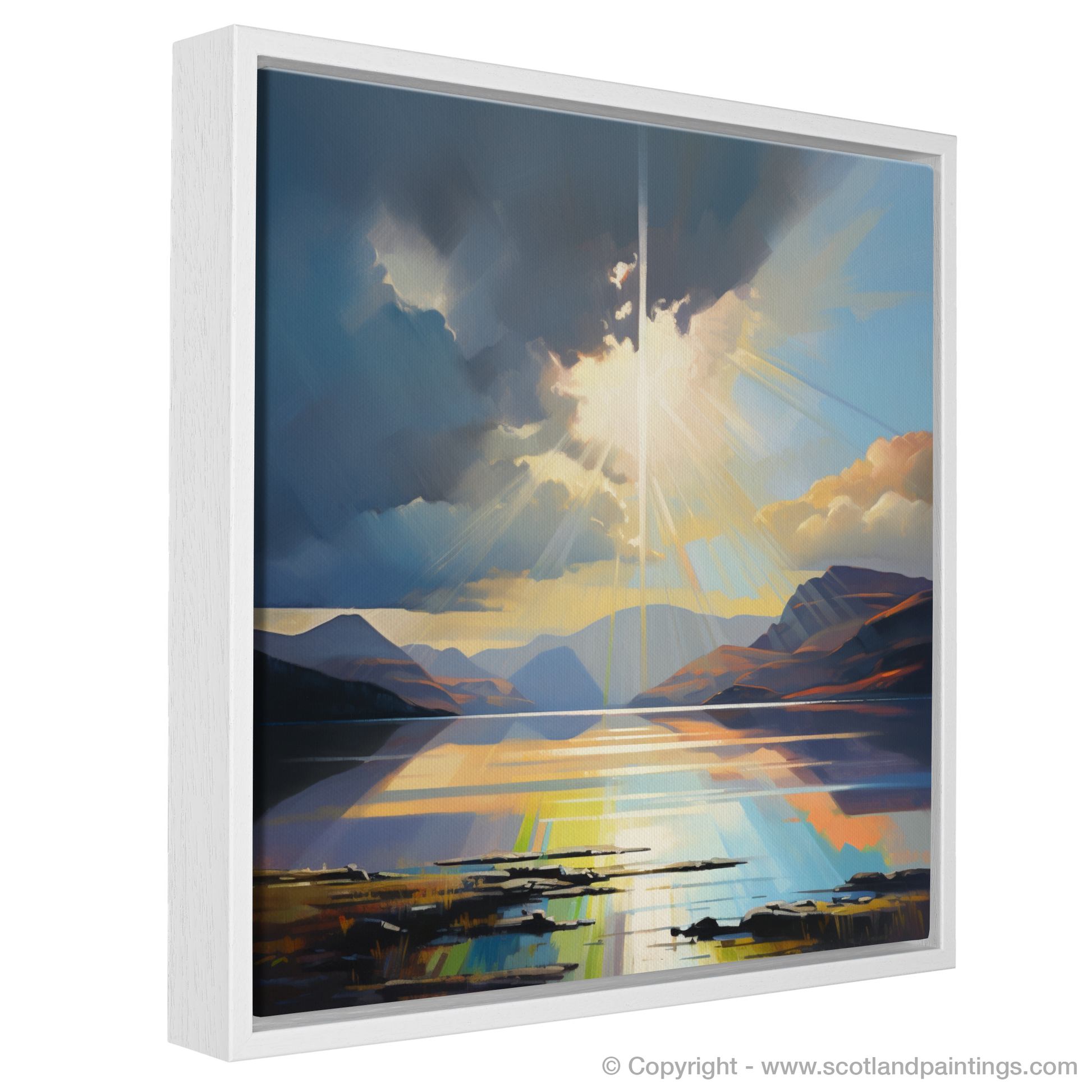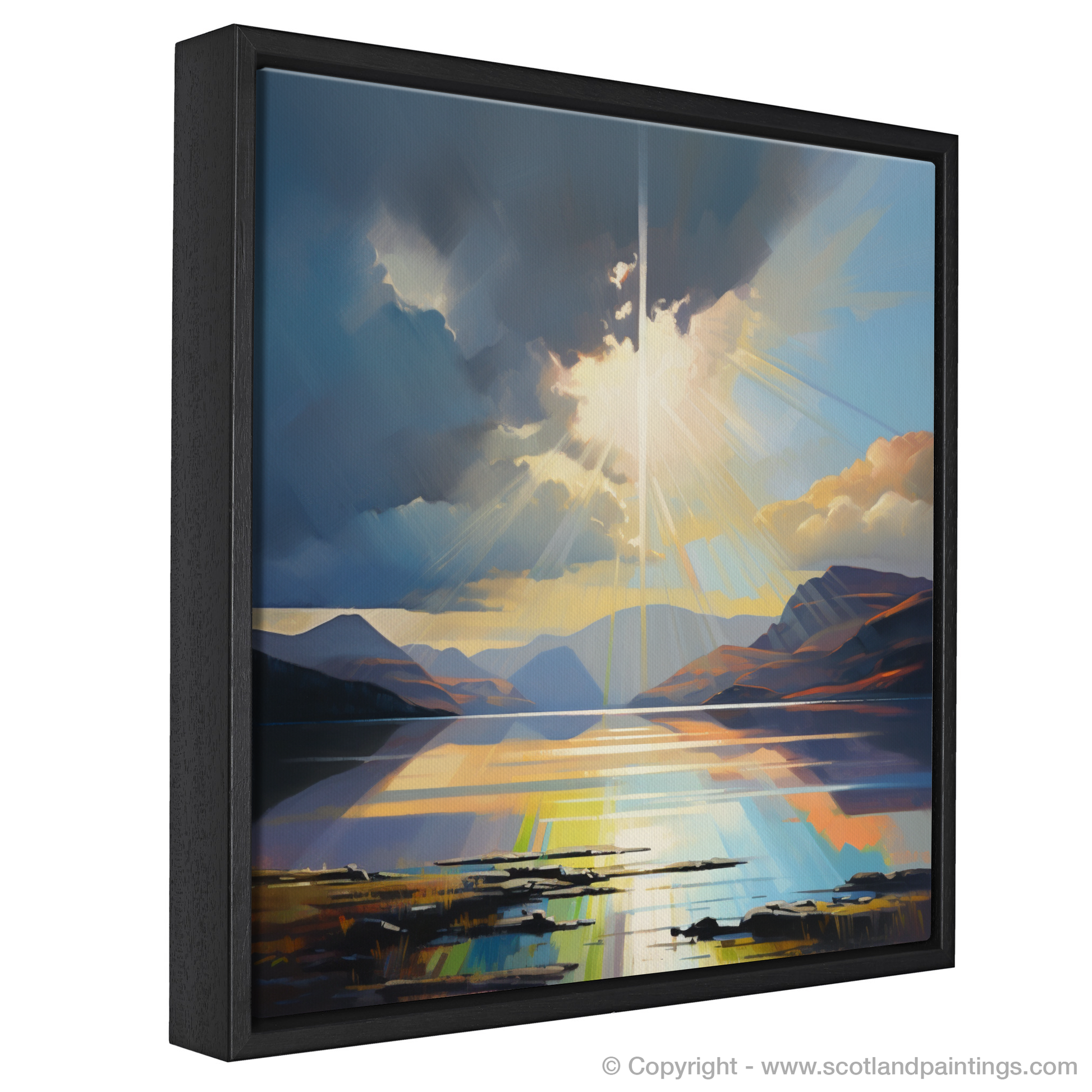 Captivate your senses with the radiant beauty of our contemporary print, depicting the majestic natural spectacle of Crepuscular rays piercing the dynamic cloud formations above the serene waters of Loch Lomond. The artwork masterfully captures the interplay of light and shadow, as sunbeams break through the heavens, illuminating the undulating hills and tranquil loch with a heavenly glow.
