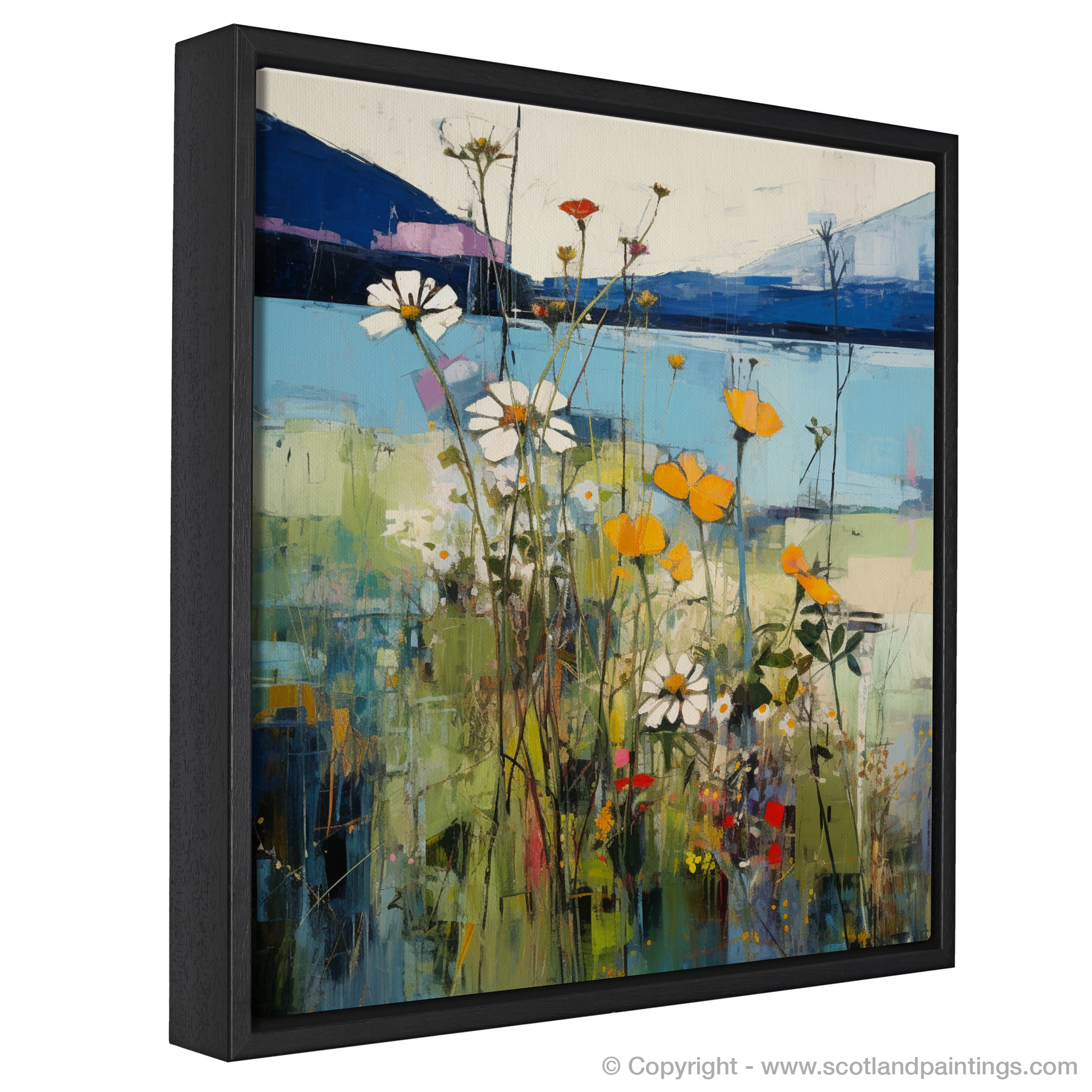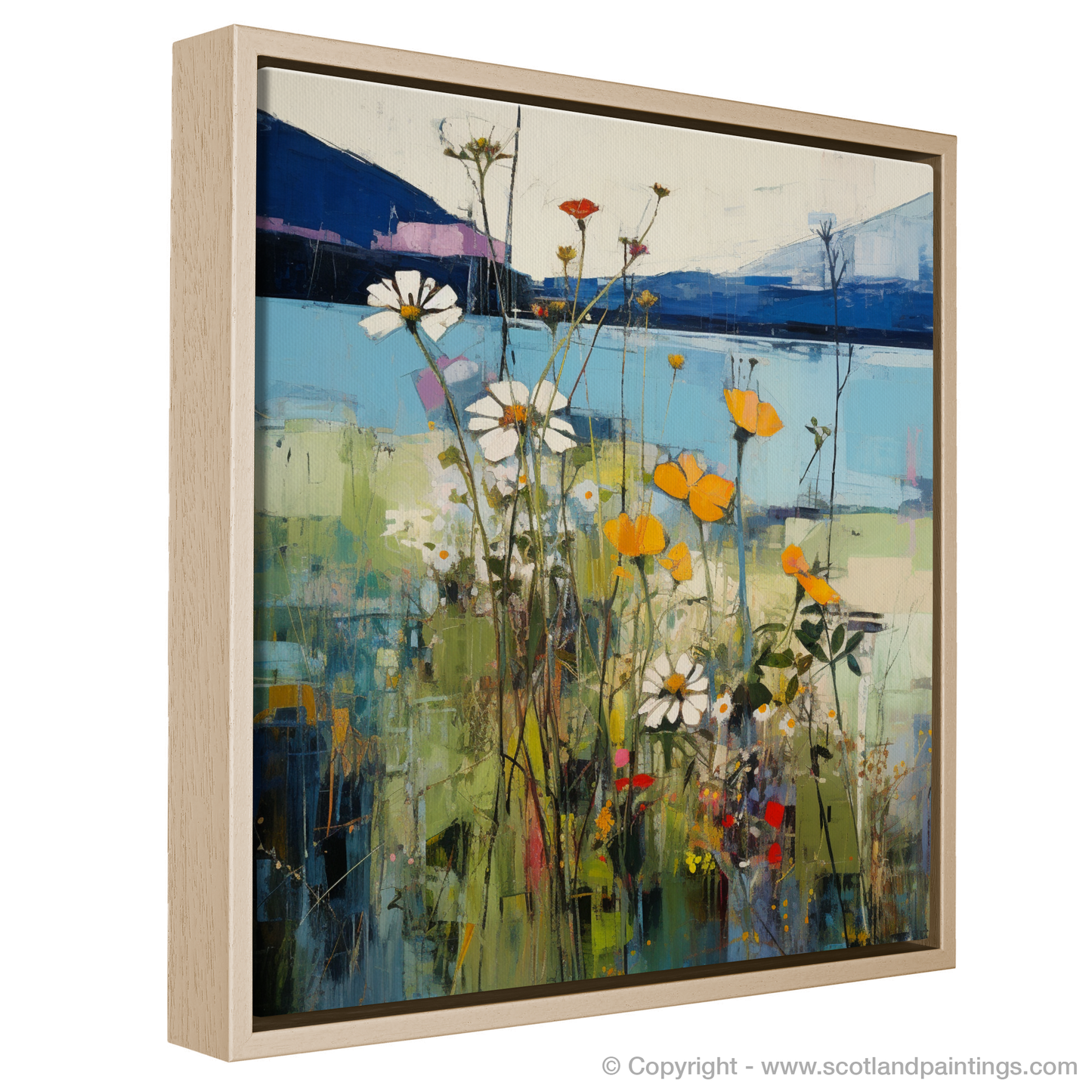 The backdrop is an evocative interpretation of the iconic Scottish loch, abstract shapes and serene blue tones suggesting the tranquil waters and distant hills. The mastery of colour and form creates a dynamic contrast between the serene loch and the lively wildflowers, conjuring a landscape that is both familiar and dreamlike.