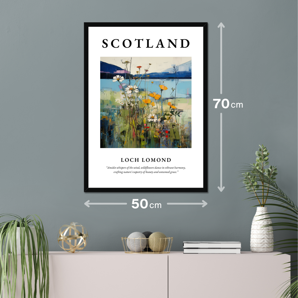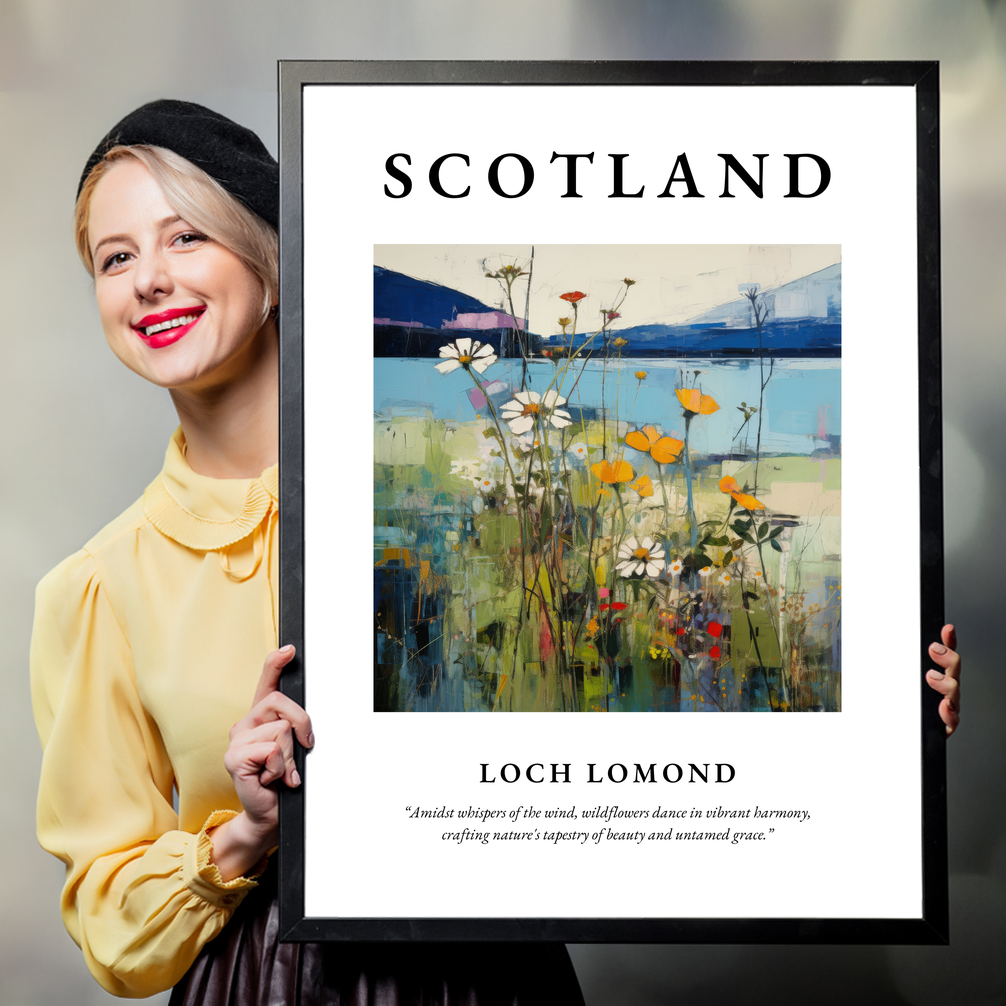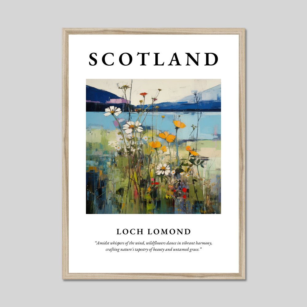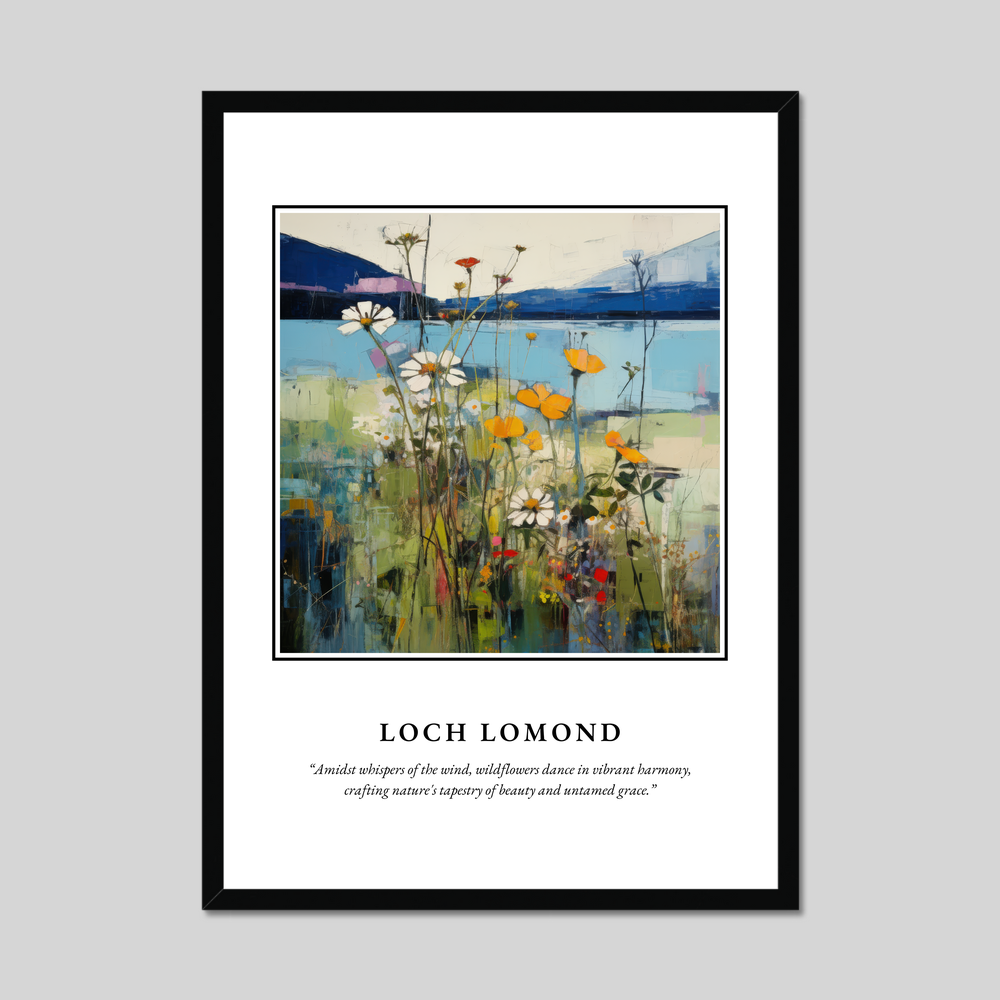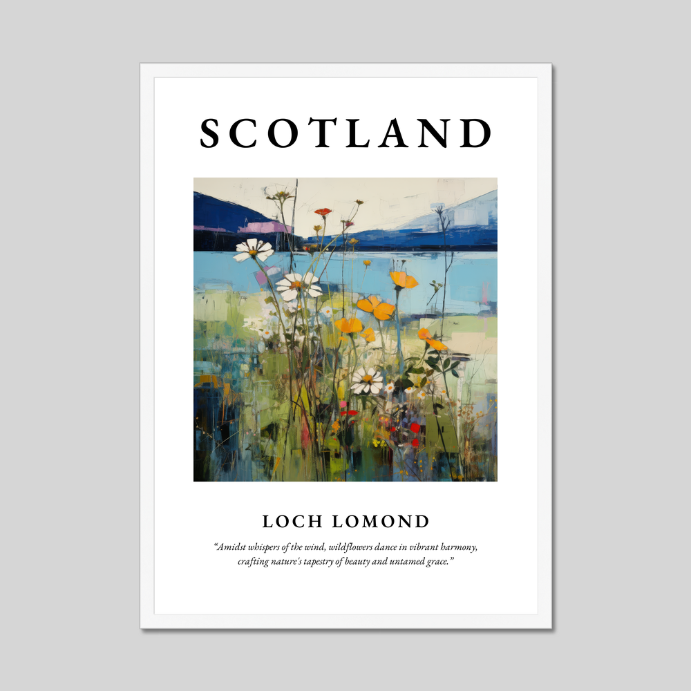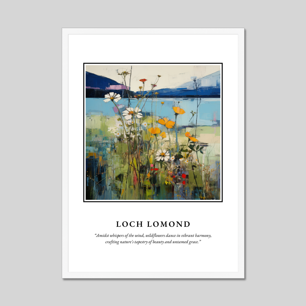 Beneath the painting, the quote “Amidst whispers of the wind, wildflowers dance in vibrant harmony, crafting nature's tapestry of beauty and untamed grace” encapsulates the spirit of the scene, enticing those who appreciate nature's artistry. Ideal for art enthusiasts who revel in the abstract impressionism style, this poster also resonates with travellers and locals alike who cherish memories or dreams of Loch Lomond's stunning vistas.