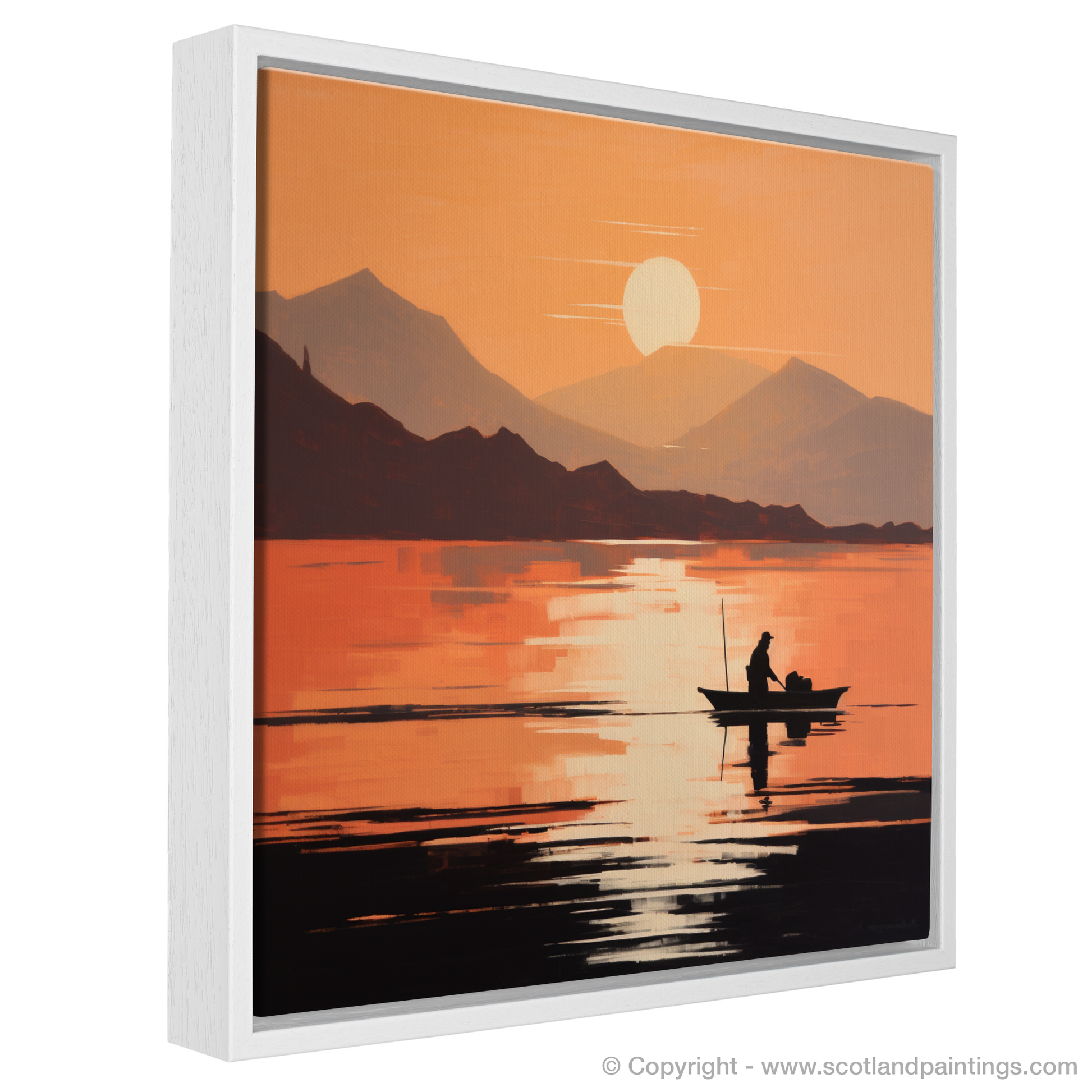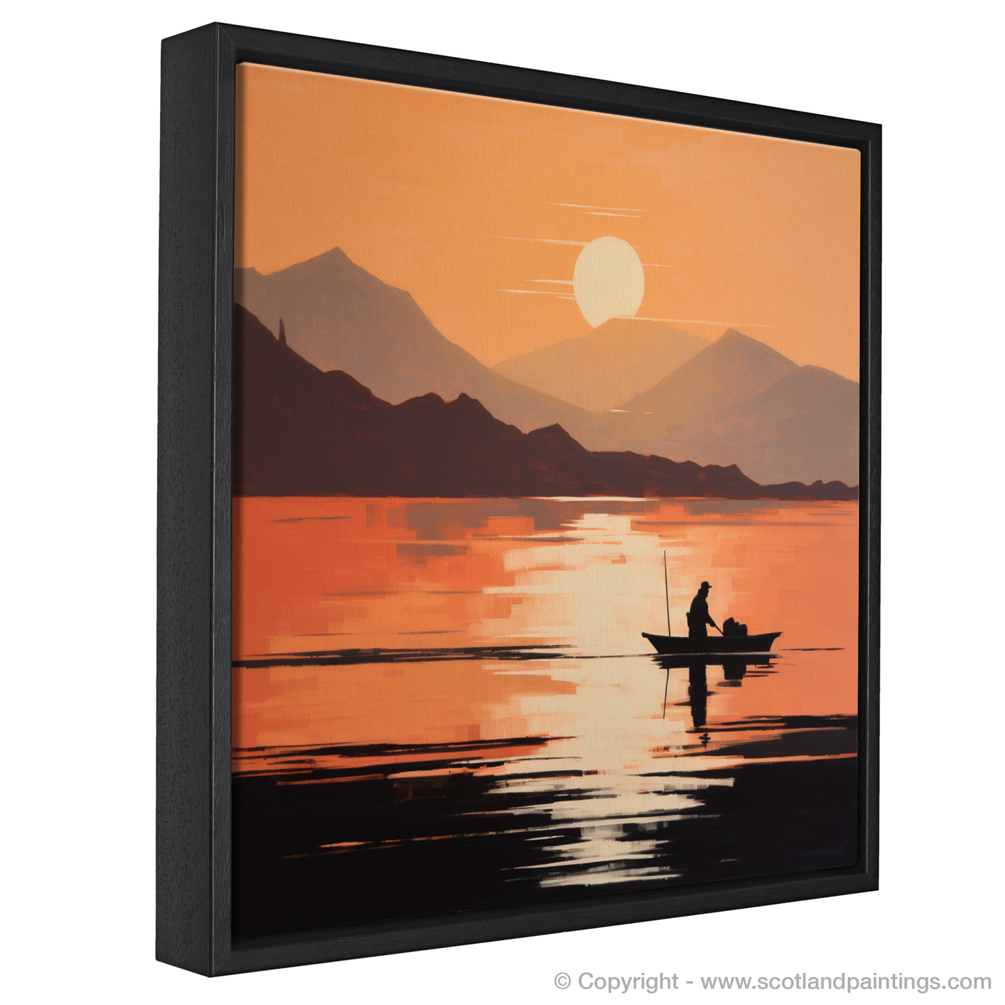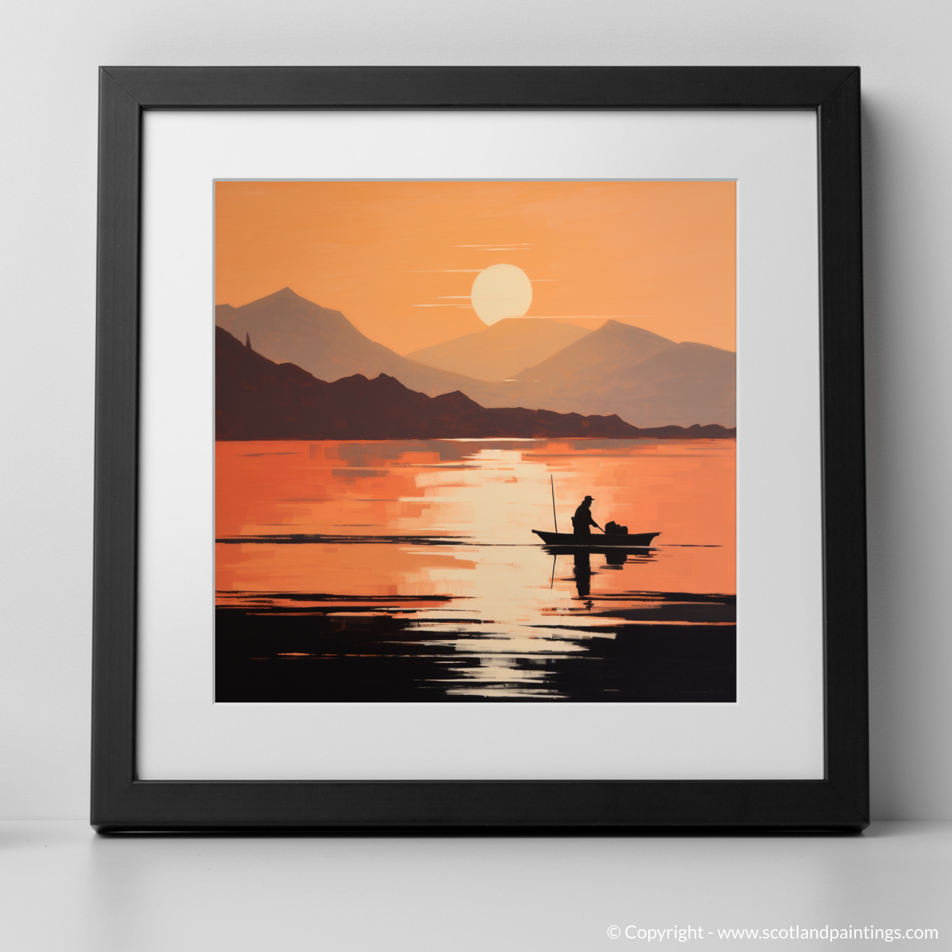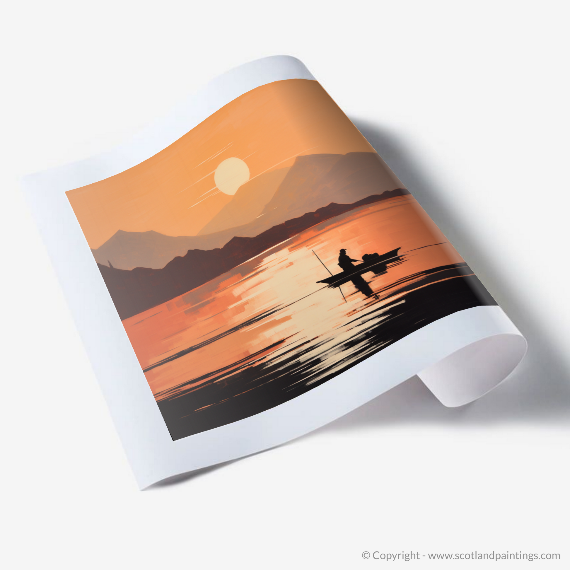 Captured in a captivating composition, this striking print presents a serene moment on the majestic Loch Lomond. The setting sun casts a warm, fiery hue across the sky, transitioning from a rich amber to a deepening orange that gently kisses the rippling surface of the water, embracing the mysterious depths with a soft, mirror-like reflection.