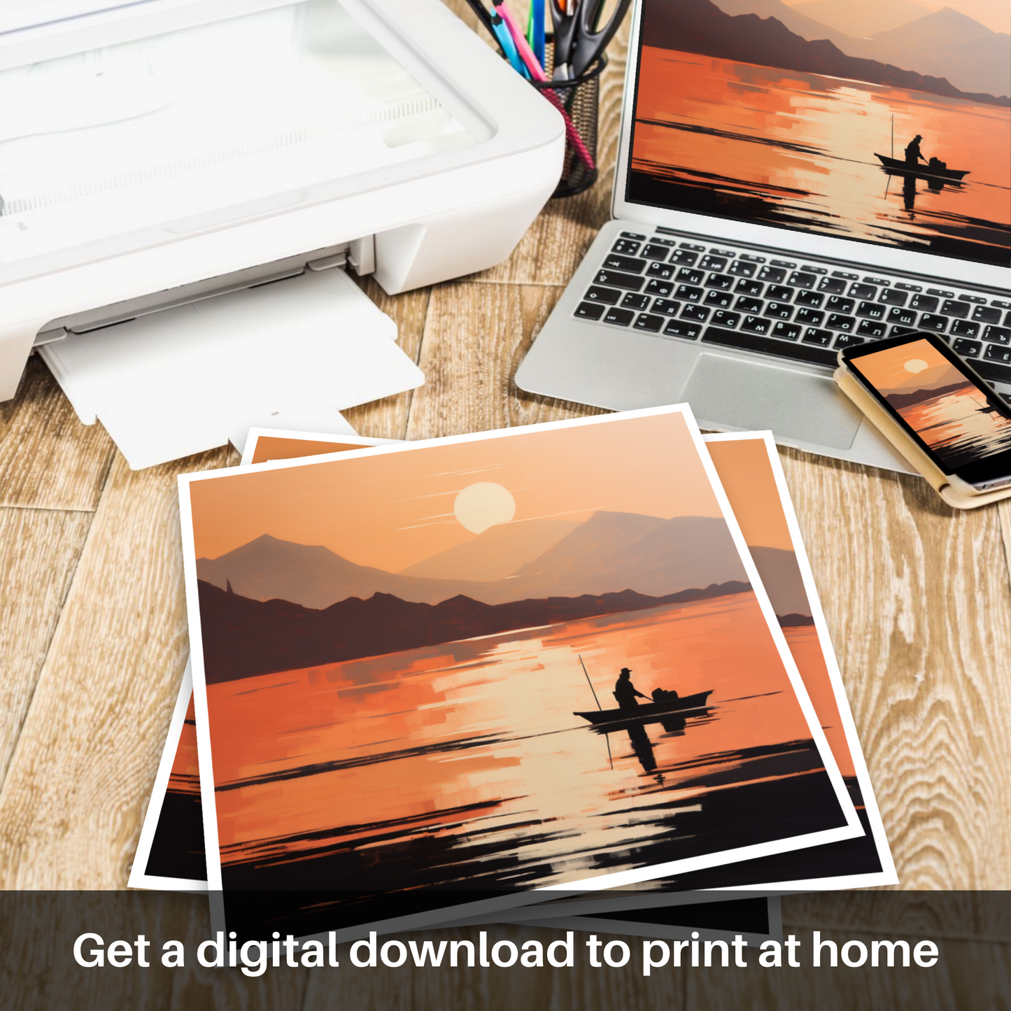 Painting and Art Print of Silhouetted fisherman on Loch Lomond. Silhouetted Serenity on Loch Lomond.