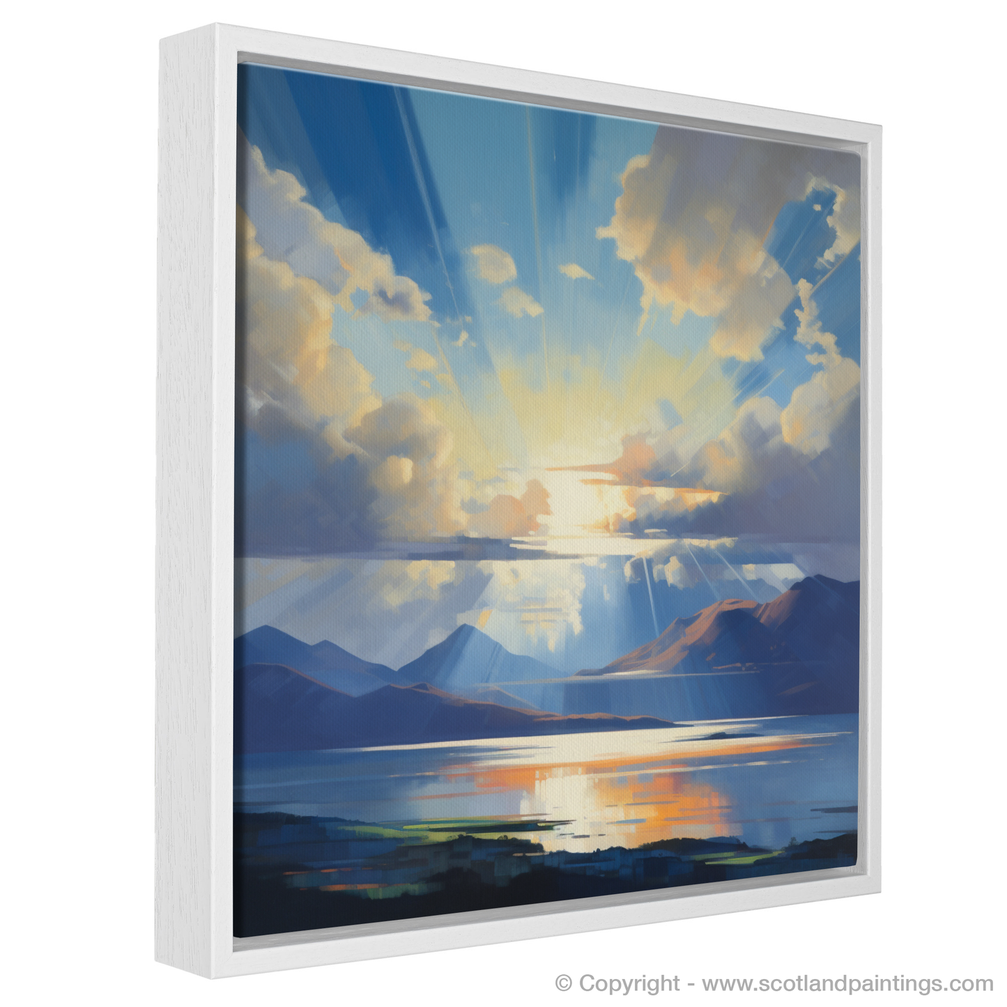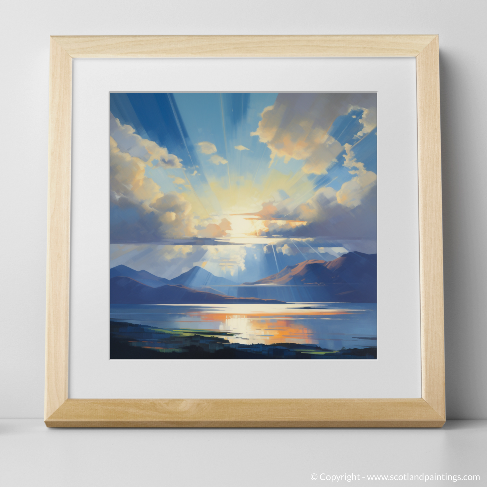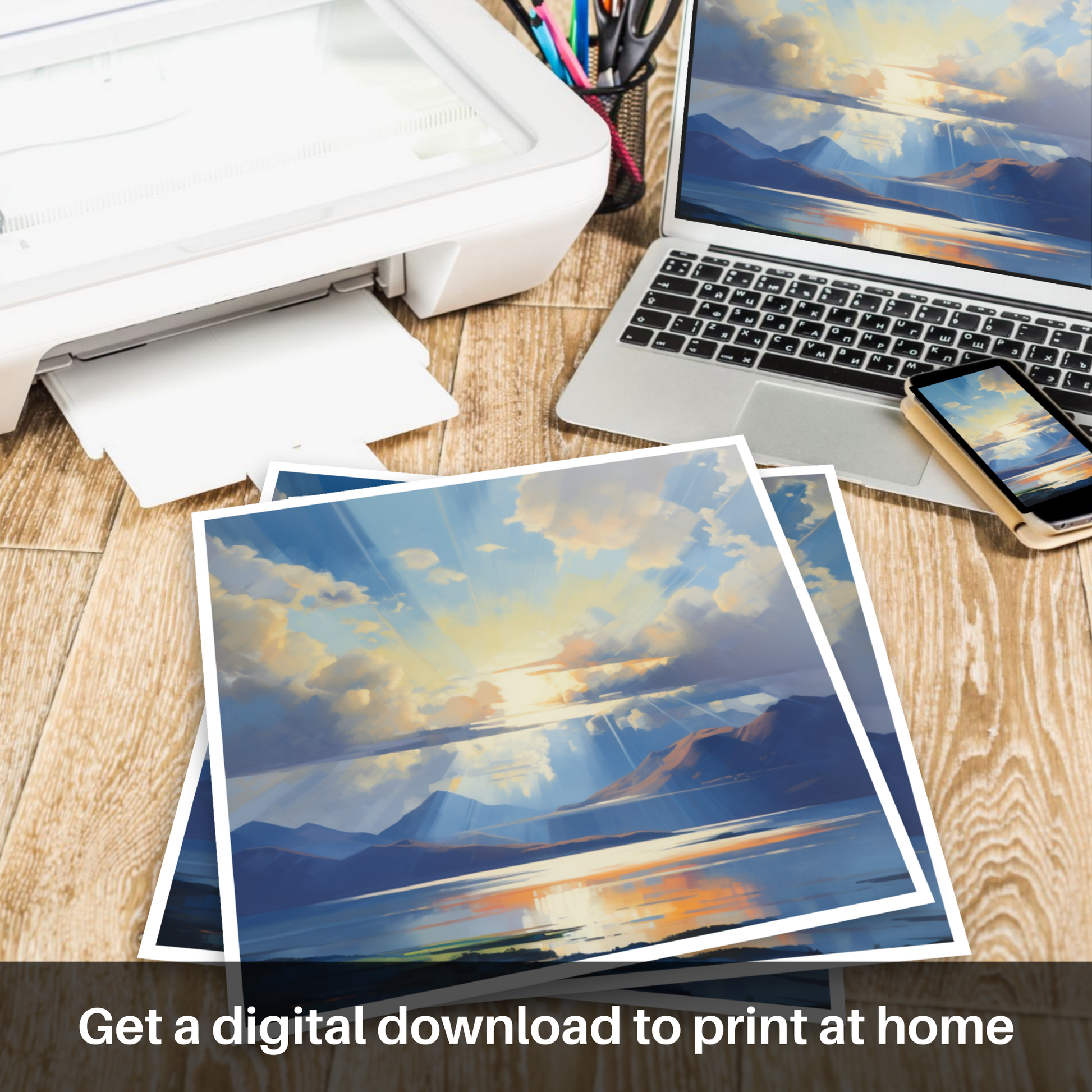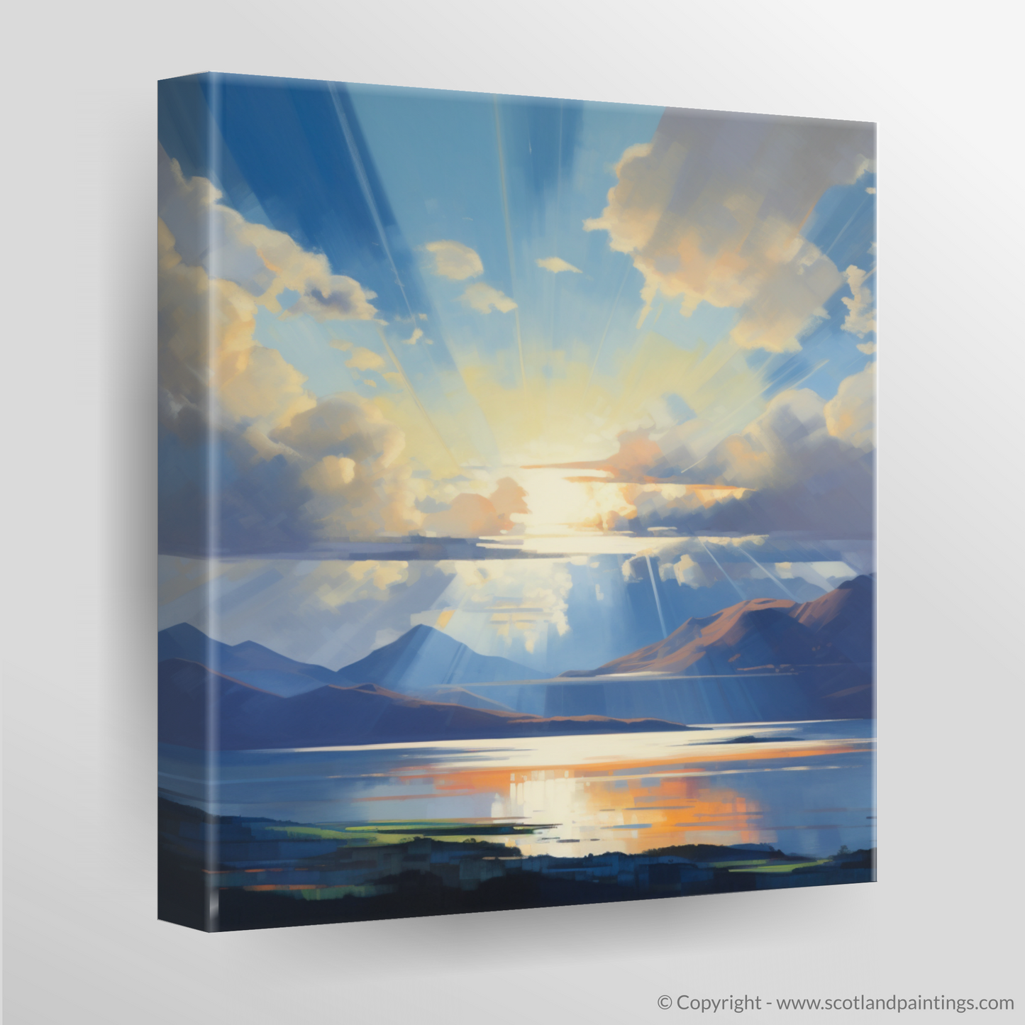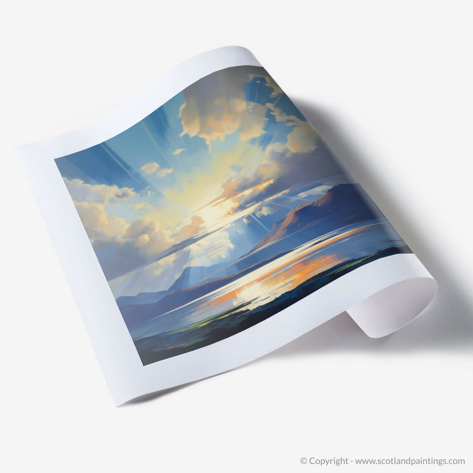 Capturing the ethereal beauty of nature's light show, this captivating print is an ode to the majestic splendour of Loch Lomond under the enchanting dance of crepuscular rays. Vividly portraying the moment when sunlight pierces through the formations of clouds, the image is a symphony of light and shadow playing over the tranquil waters and rolling hills that characterise the loch's stunning landscape.