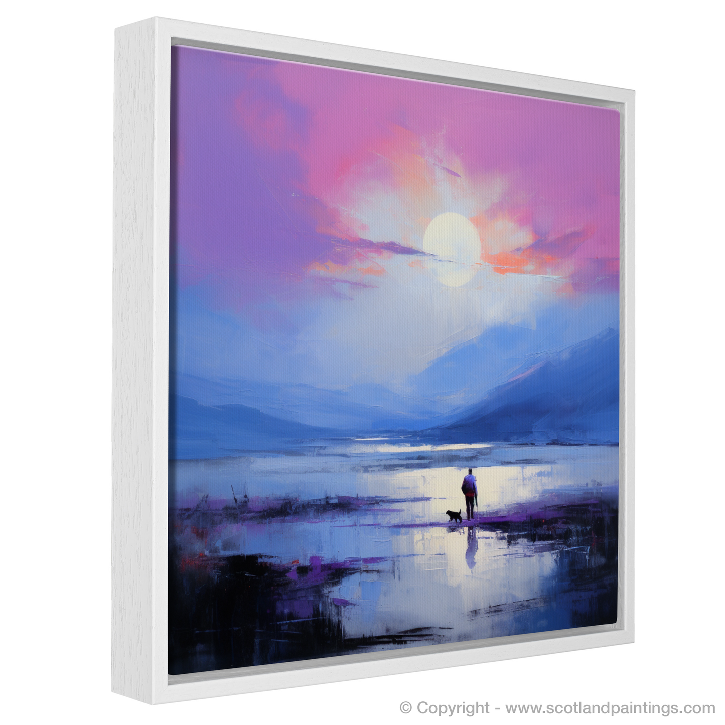The canvas is awash with an intense sky, where the dramatic interplay of magenta, azure, and wisps of white suggests an ethereal sunset or sunrise. The celestial orb hangs low, its radiant light kissing the land and water, infusing the scene with a dreamlike atmosphere. Below, the calm waters of Loch Lomond mirror the spectacle above, creating a symphony of colour that dances across its surface.