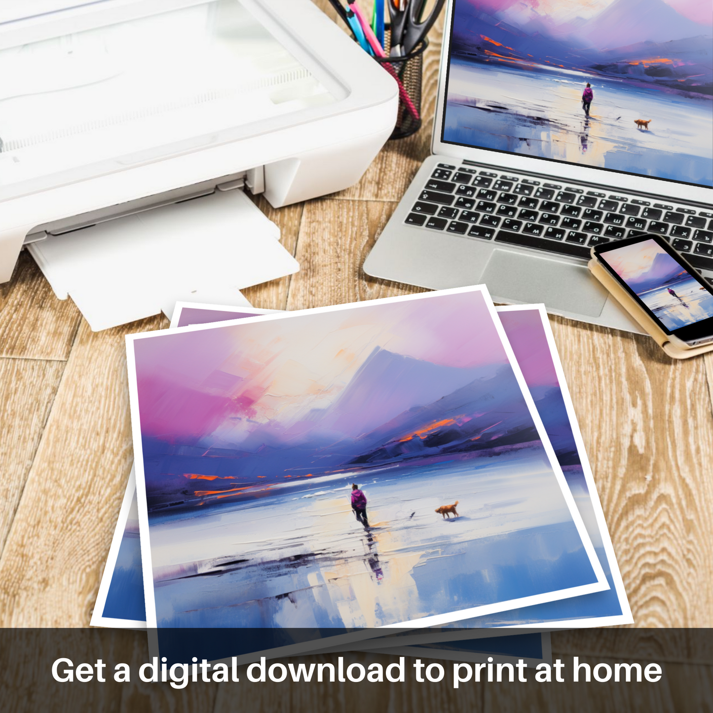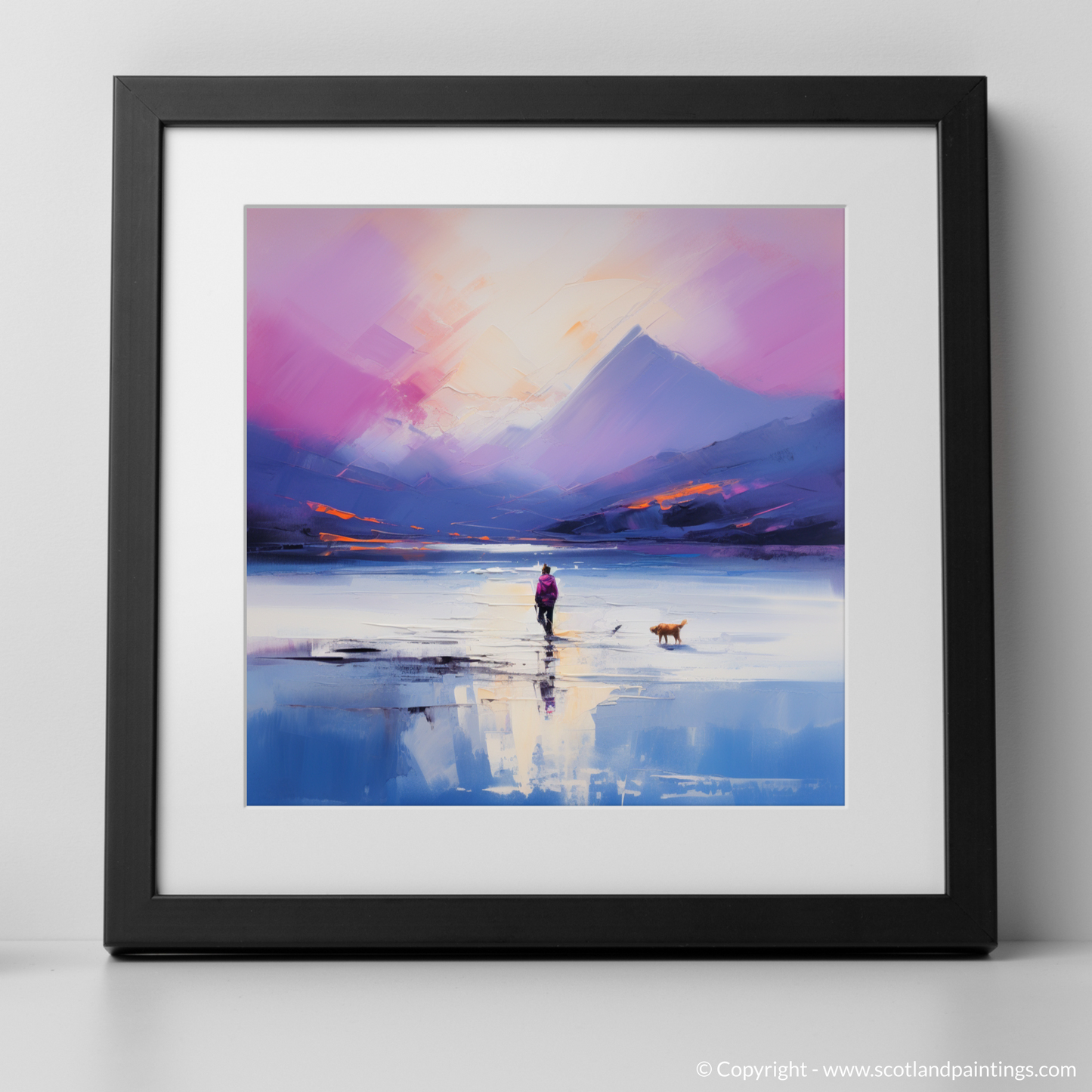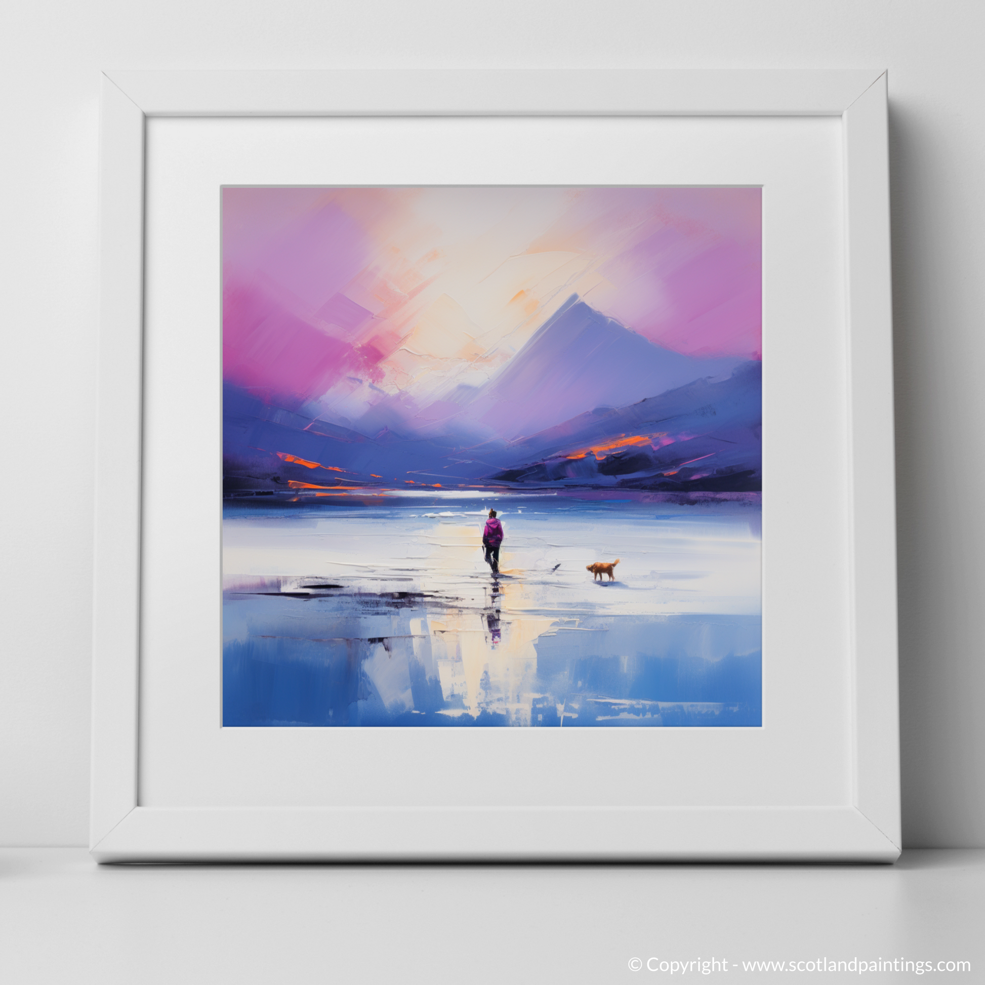 Captured within this print is a visual poem that gracefully unfolds against the serene backdrop of Loch Lomond. The artwork, steeped in the passionate strokes of Expressionism, showcases a man with his loyal canine companion strolling beside the tranquil, mirrored waters. Visceral brushstrokes in shades of violet, cerulean, and a crescendo of fiery oranges and pinks convey the sky's twilight ballet as the day's final light cloaks the rugged peaks in a soft, ethereal glow.