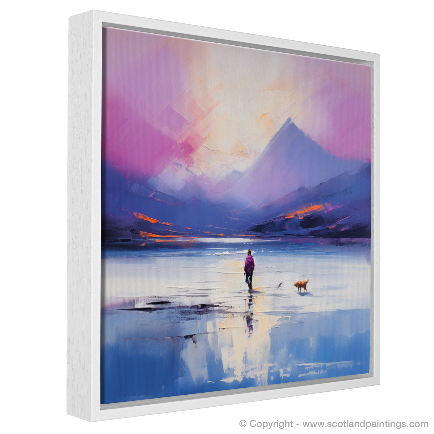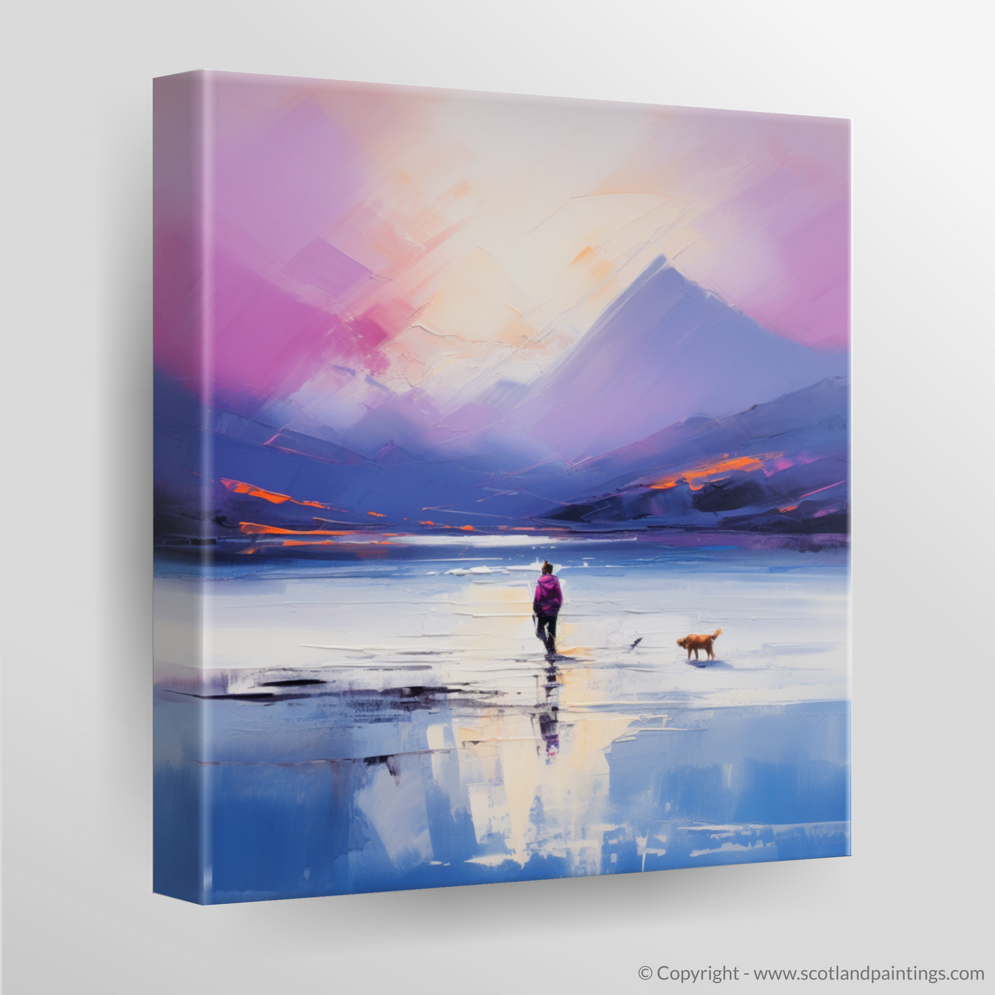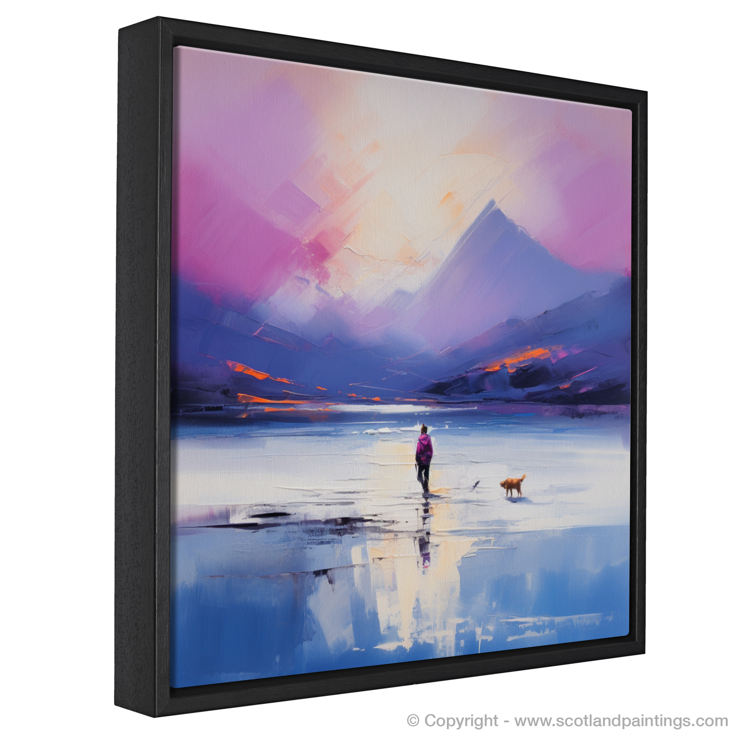 Captured within this print is a visual poem that gracefully unfolds against the serene backdrop of Loch Lomond. The artwork, steeped in the passionate strokes of Expressionism, showcases a man with his loyal canine companion strolling beside the tranquil, mirrored waters. Visceral brushstrokes in shades of violet, cerulean, and a crescendo of fiery oranges and pinks convey the sky's twilight ballet as the day's final light cloaks the rugged peaks in a soft, ethereal glow.
