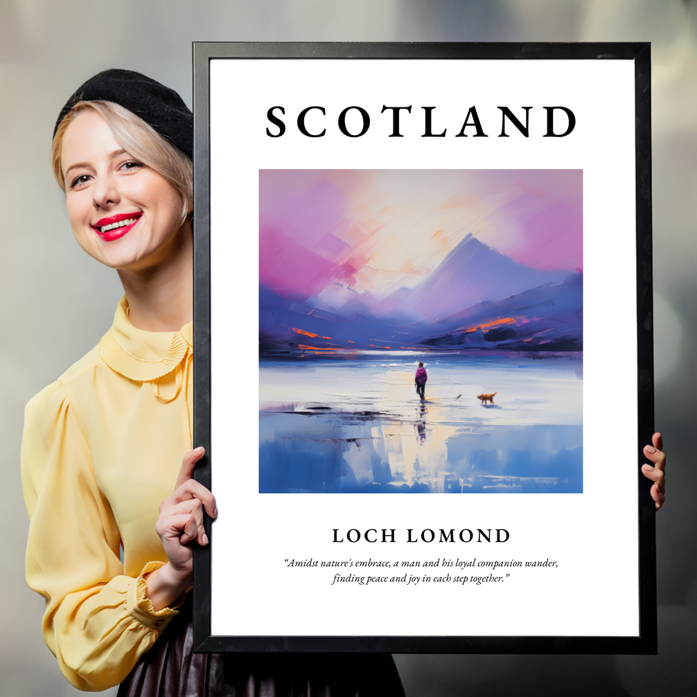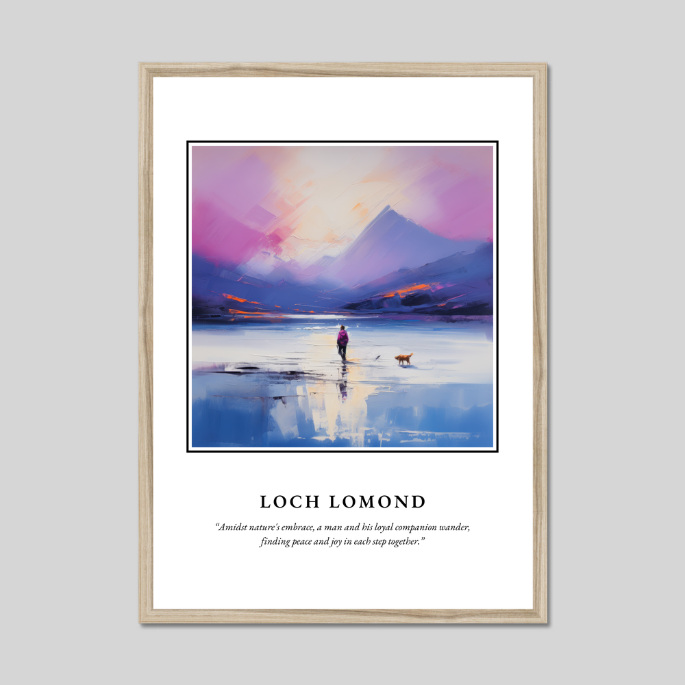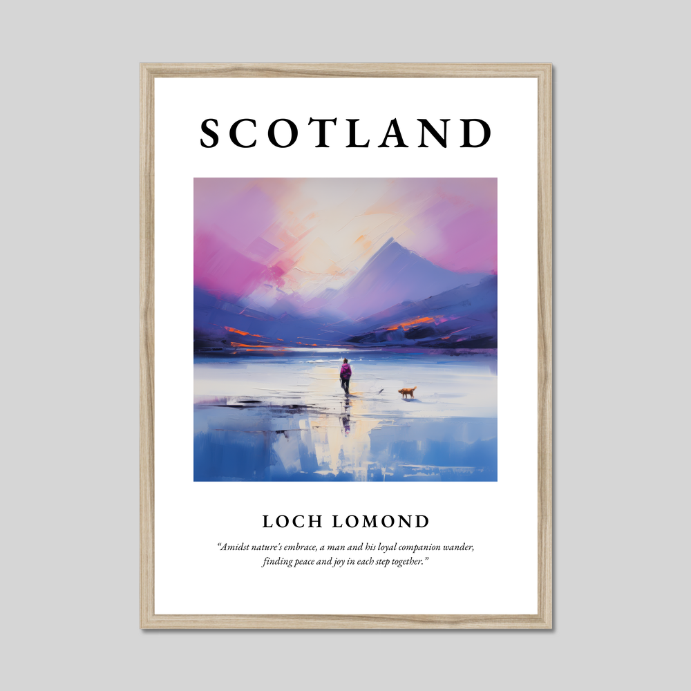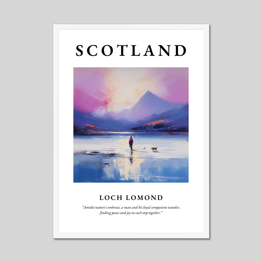 Embodying the essence of Expressionism, the painting of Loch Lomond captures the vibrant energy and deep emotions associated with this breathtaking landscape. The bold strokes and dynamic colours evoke the serene yet invigorating atmosphere of one of Scotland's most beloved lochs. The scene features a lone figure and their loyal companion, a heartwarming touch that resonates with anyone who finds solace in nature's embrace. Below the painting, the quote encapsulates a sentiment of peace and joy that can only be found in quiet, reflective moments amid natural splendour.