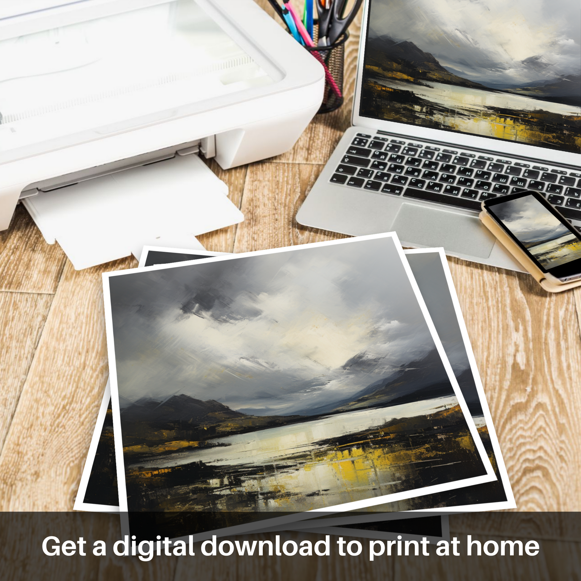 This evocative print captures the dramatic essence of Scotland’s famed natural beauty with an abstract interpretation of storm clouds gathering over Loch Lomond. With a palette dominated by deep greys, contrasting whites, and a spectrum of yellows, the artwork conveys the dynamic spectacle of light and shadow that dances over the landscape as a storm approaches.