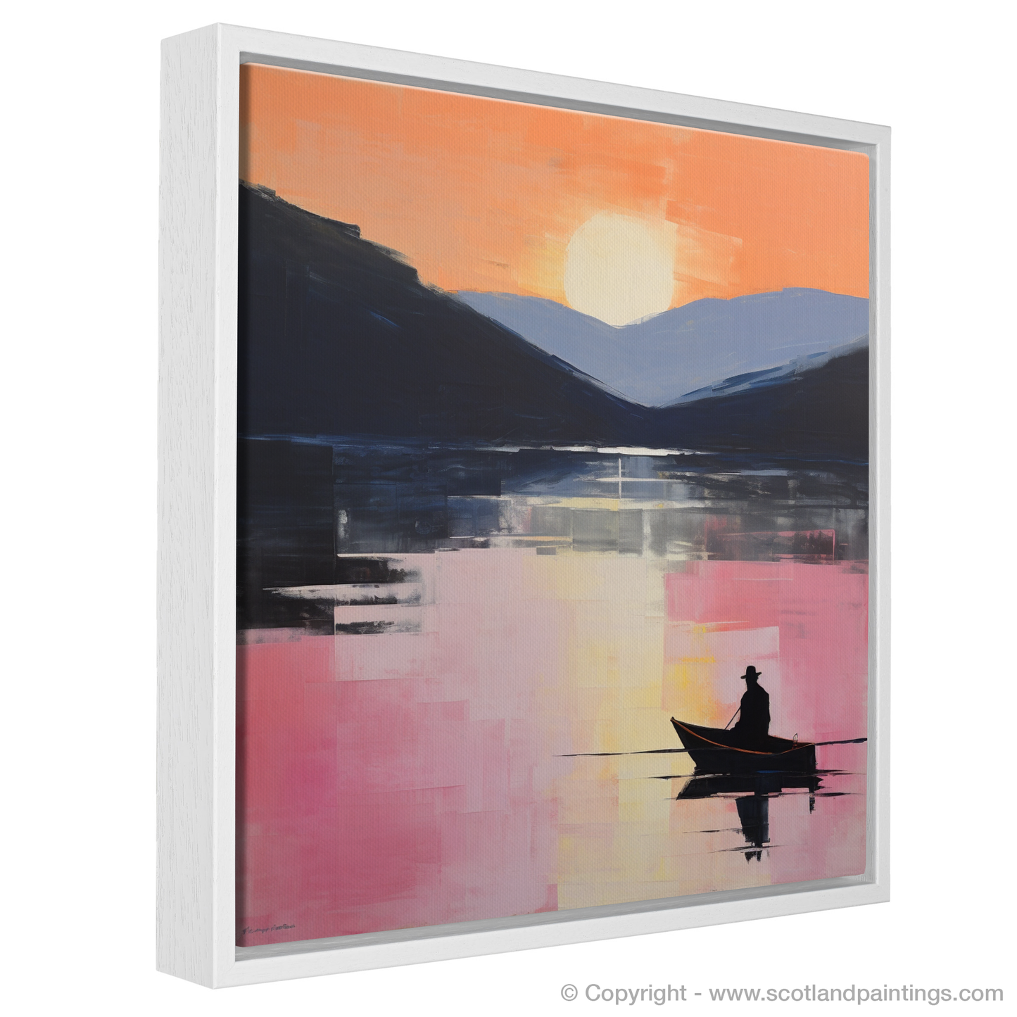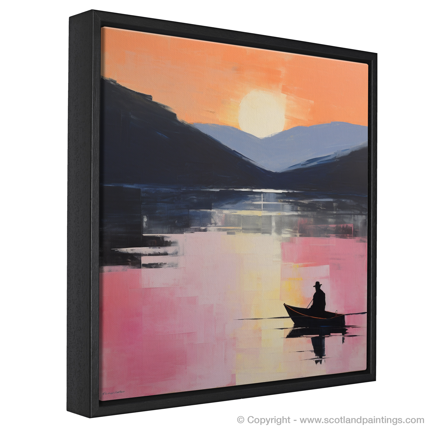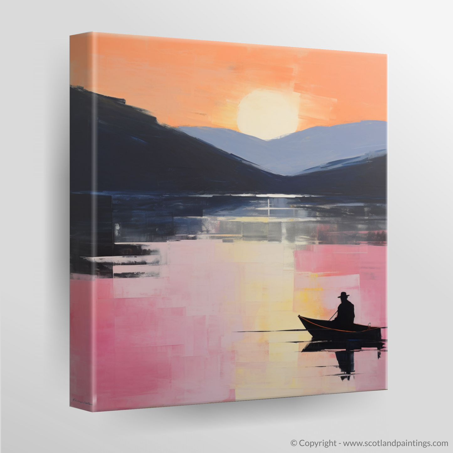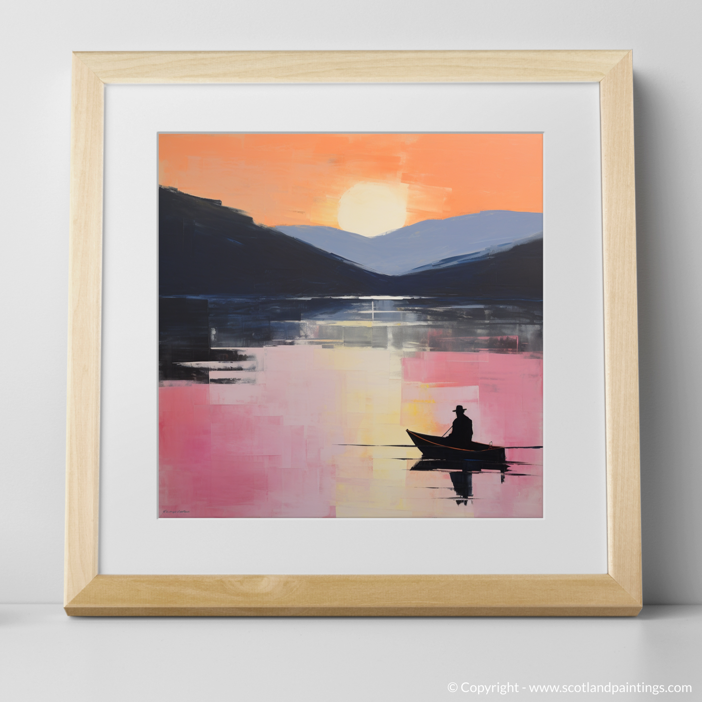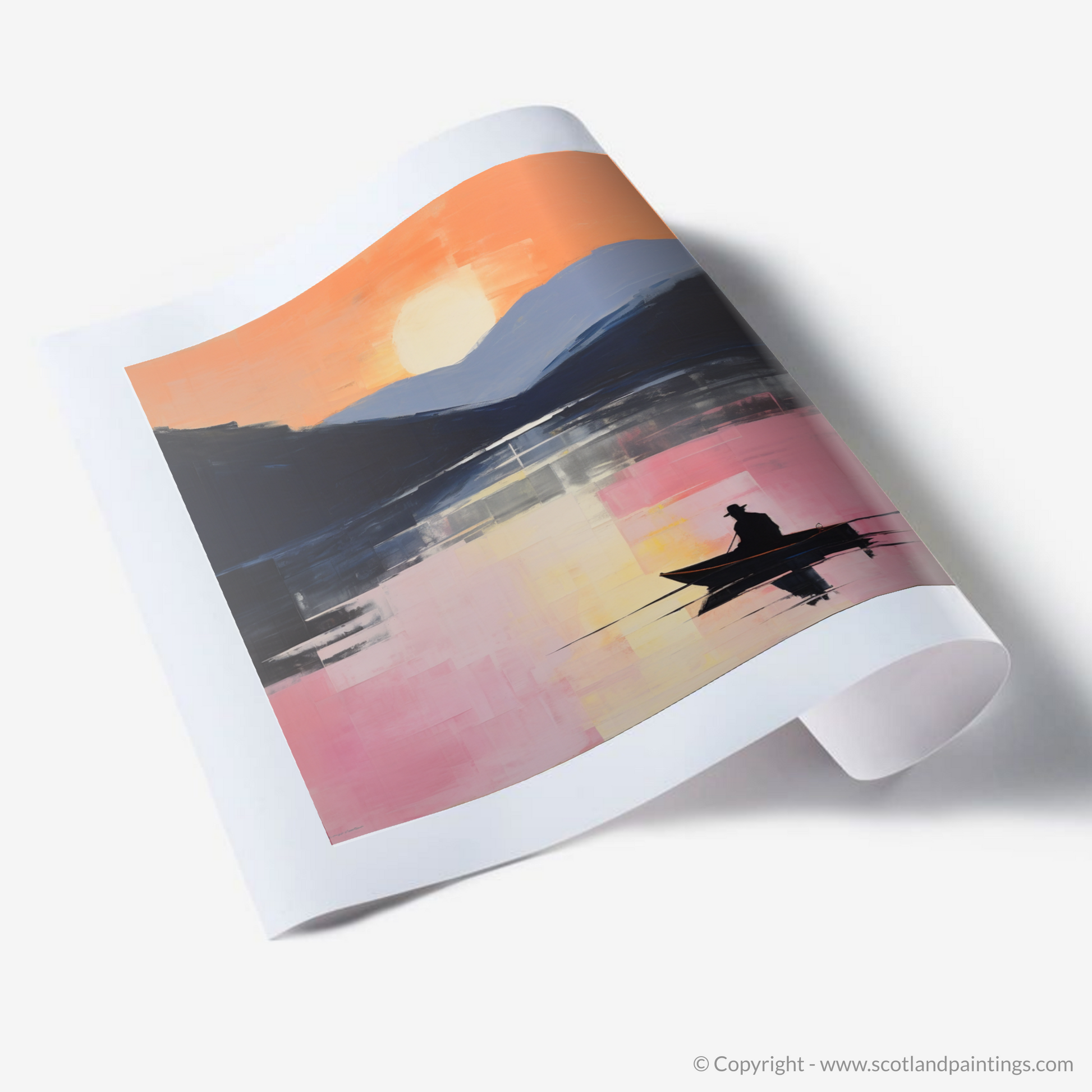This evocative print captures the serene beauty of Loch Lomond through the lens of Abstract Impressionism. The tranquil setting is dominated by a soft, radiant orb of the setting sun, gently diffusing its warm hues across the canvas. The sky, a tapestry of luminous corals and subtle violets, graces the composition, hinting at the closing of day.
