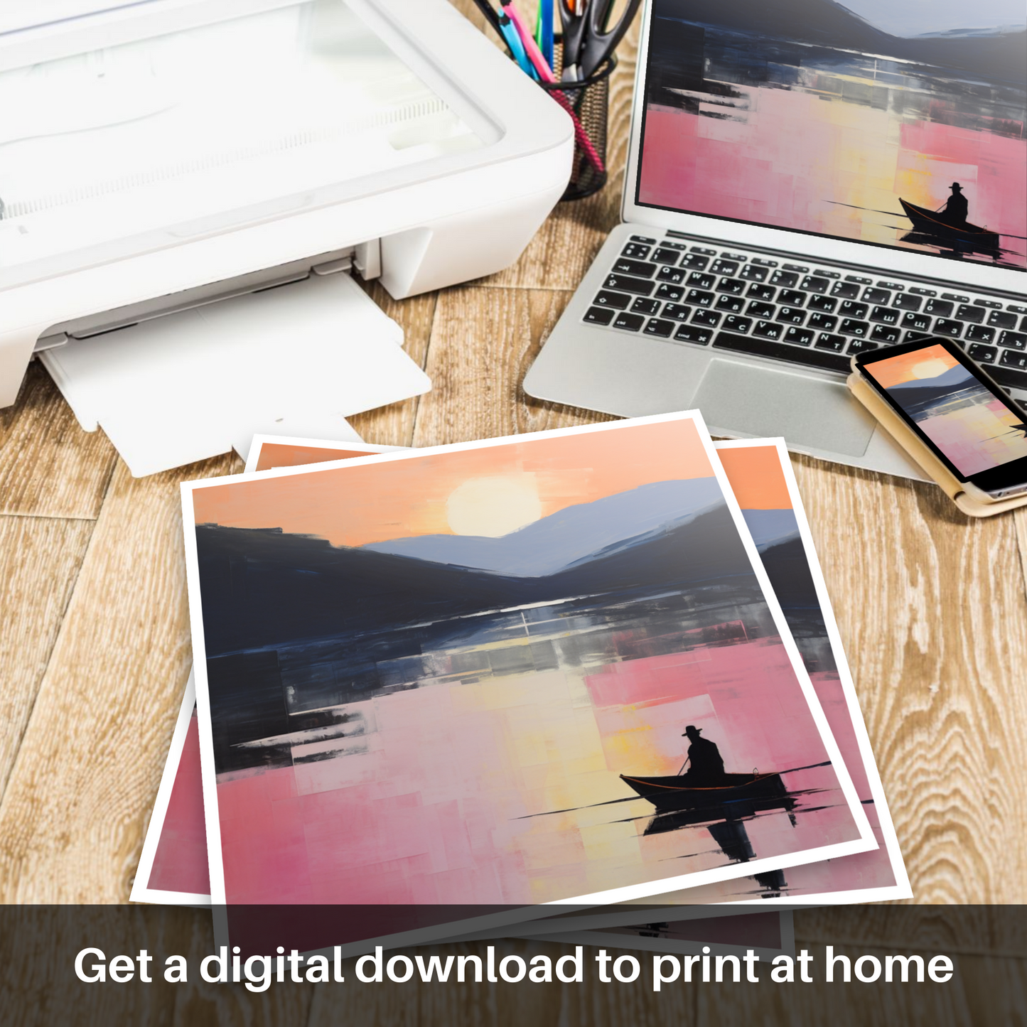 Painting and Art Print of Silhouetted fisherman on Loch Lomond entitled "Silhouetted Fisherman at Dusk: An Abstract Impression of Loch Lomond".