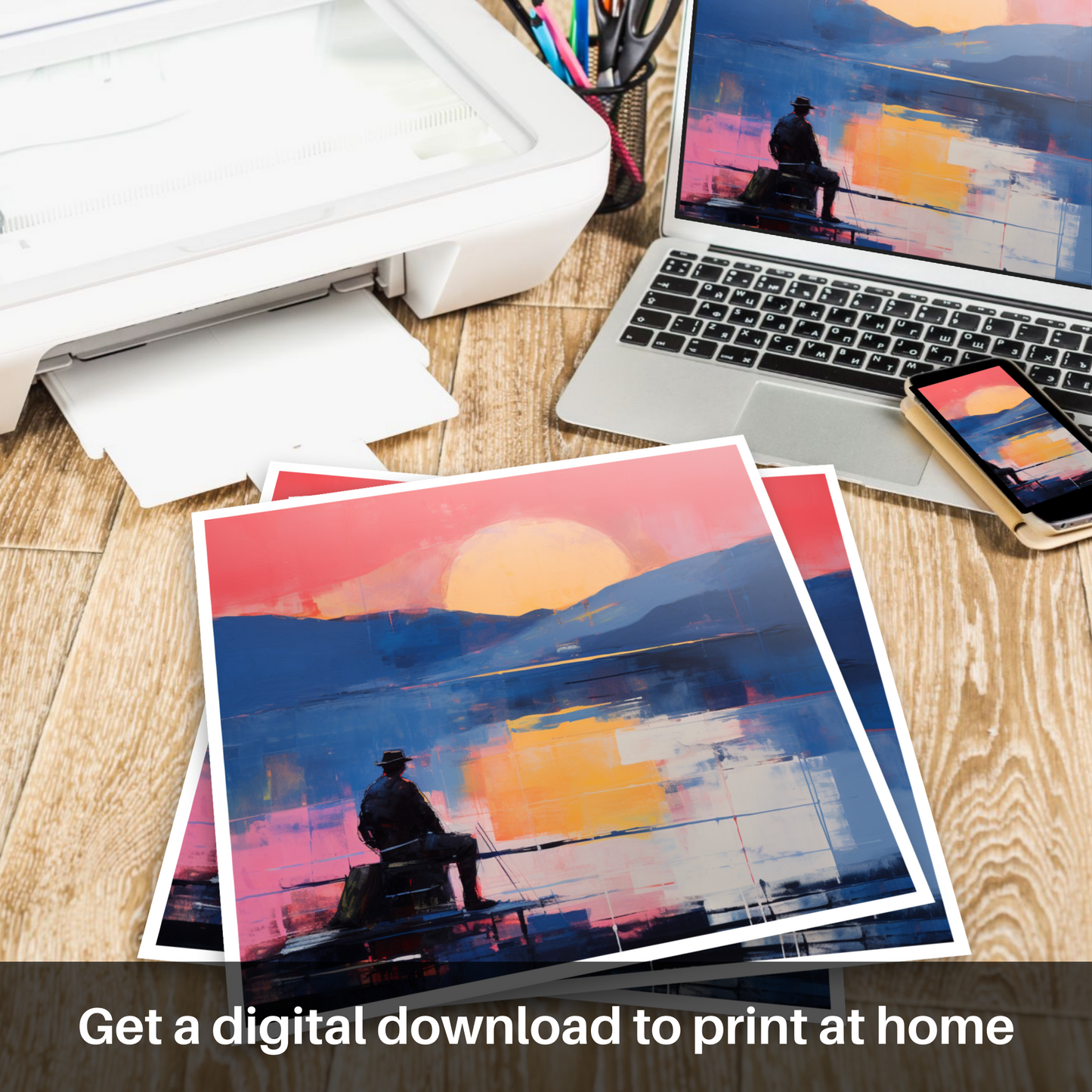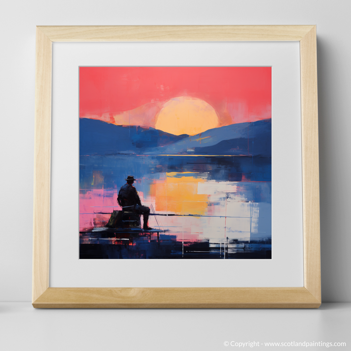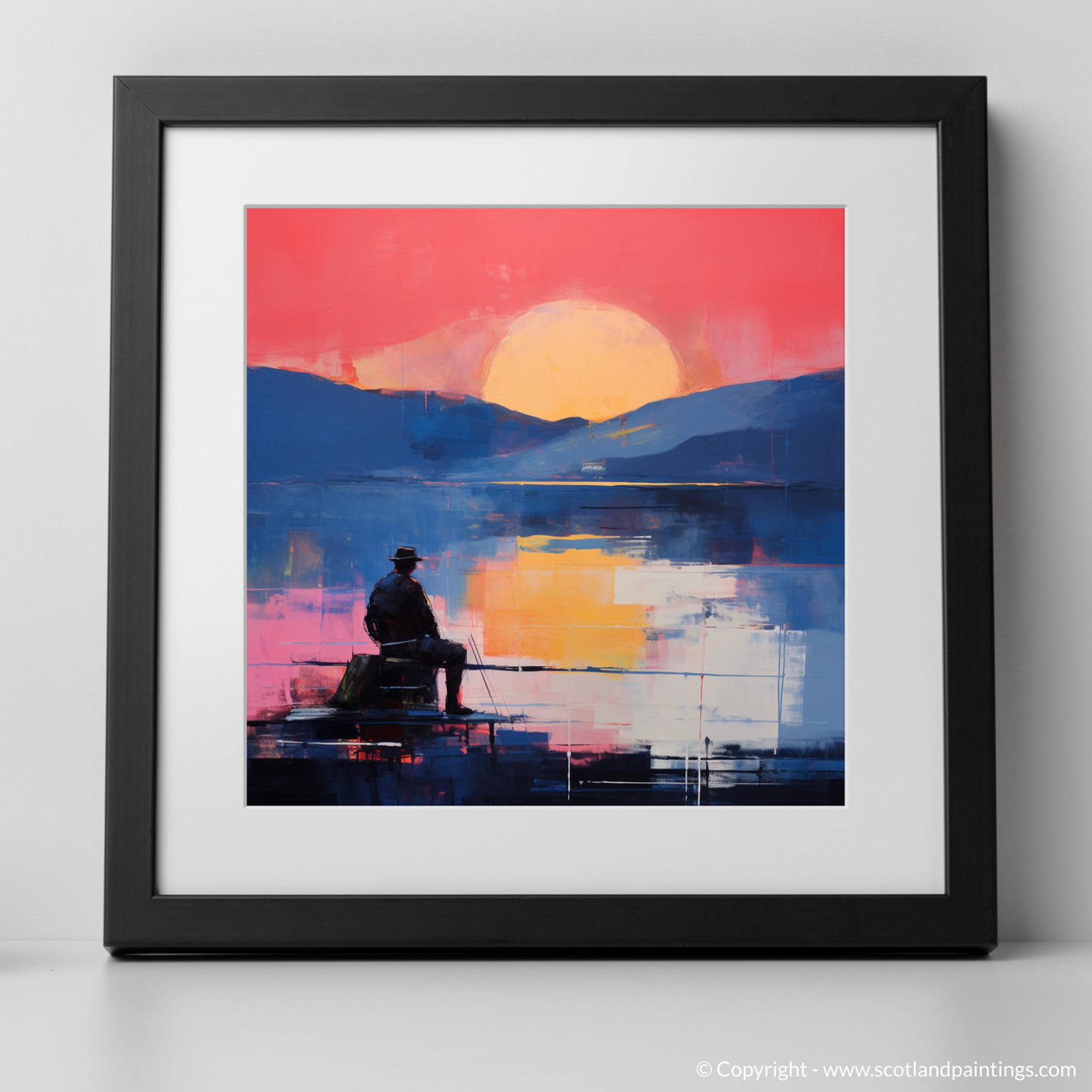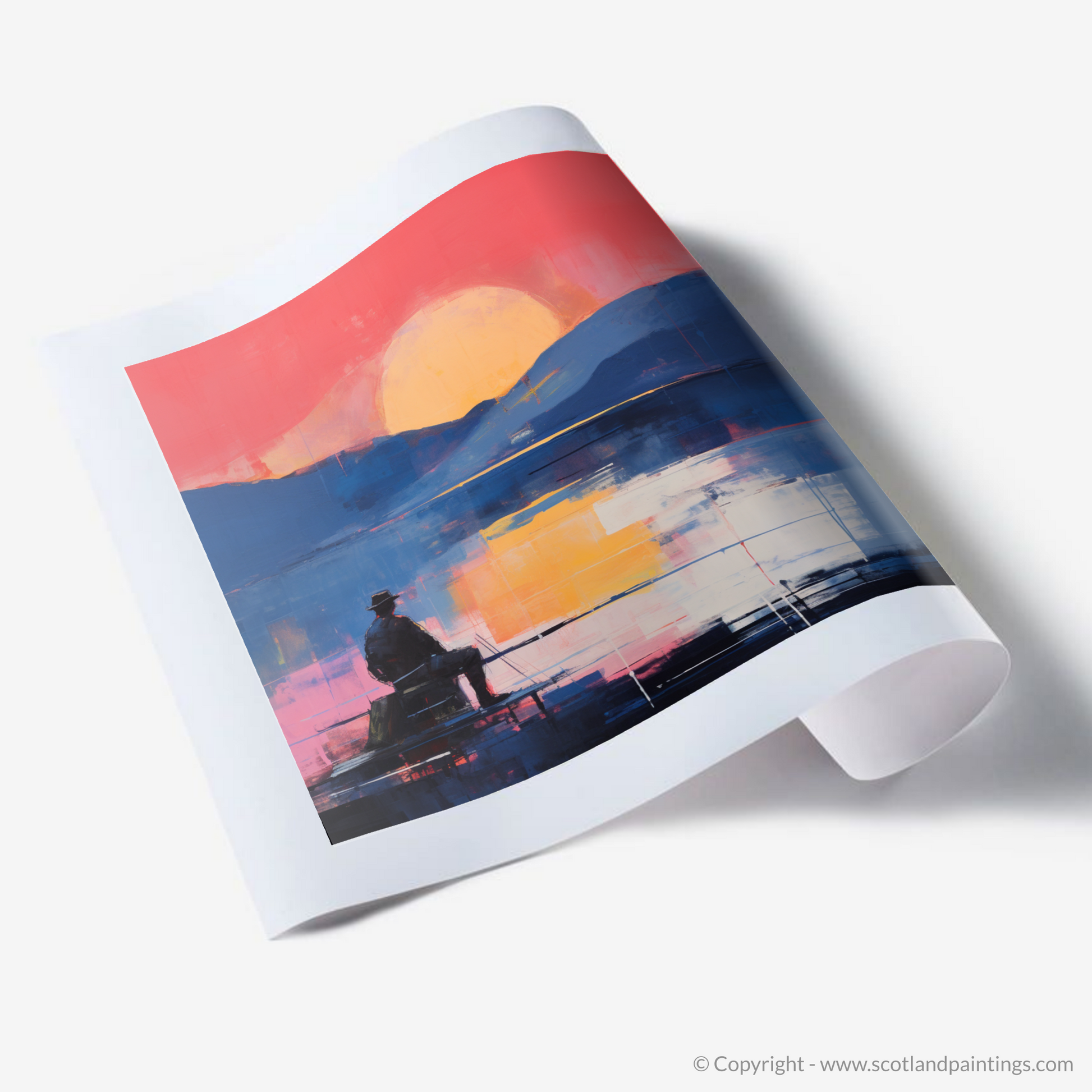 Captured within this evocative print is a scene that embodies the serene beauty of Loch Lomond through the lens of Abstract Impressionism. The artwork features a lone fisherman, rendered as a silhouette against a mesmerising backdrop, his posture one of patient tranquillity. The composition is bathed in a dramatic interplay of colours, with a bold, fiery orb of a sun descending behind the undulating profile of distant hills, casting an array of warm hues across the sky.