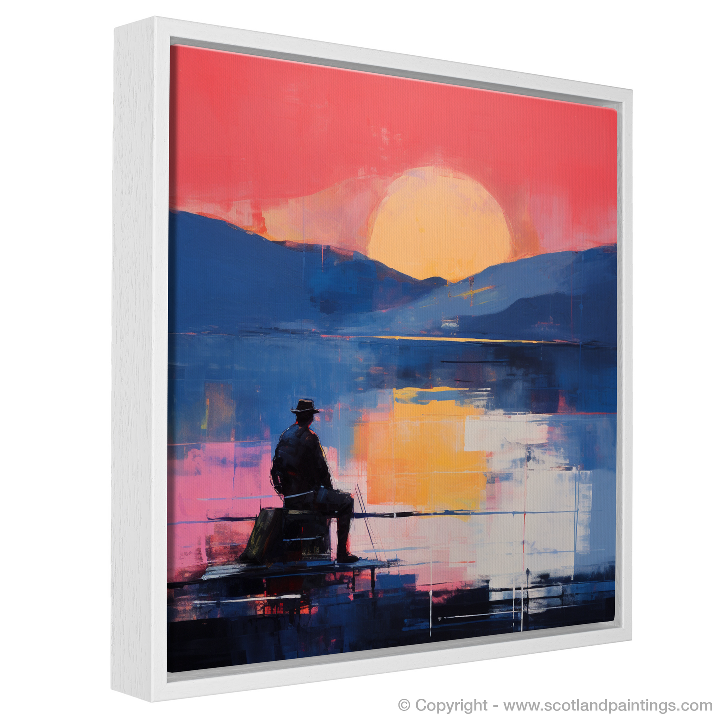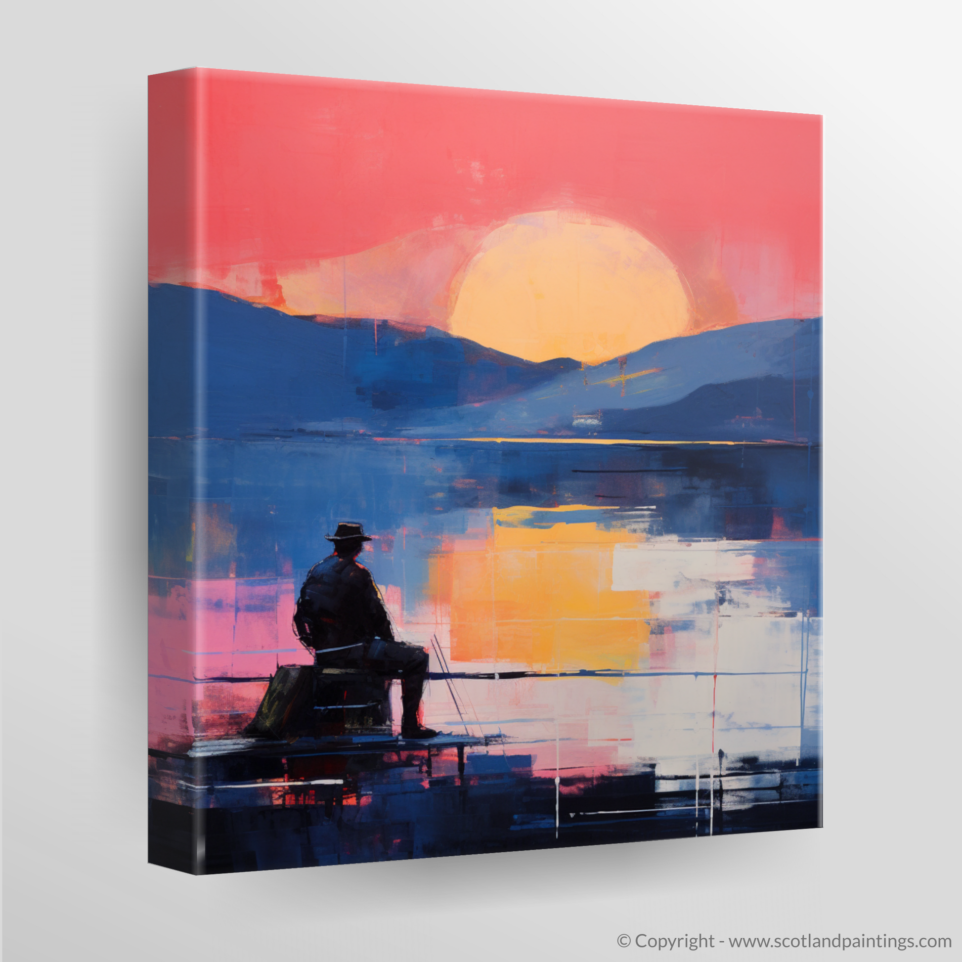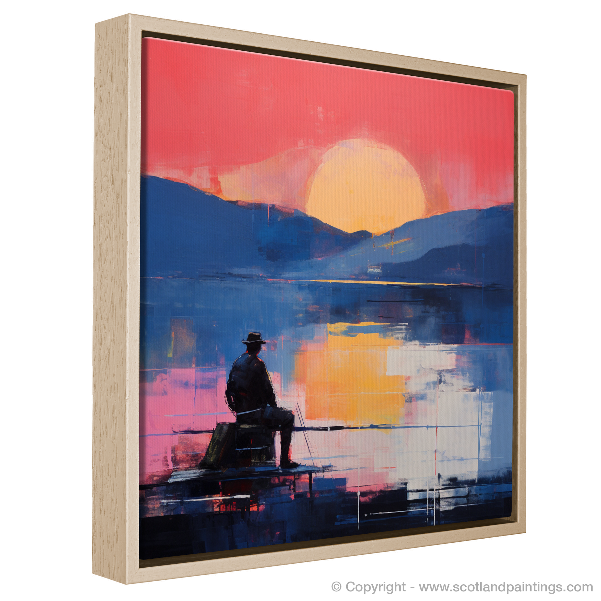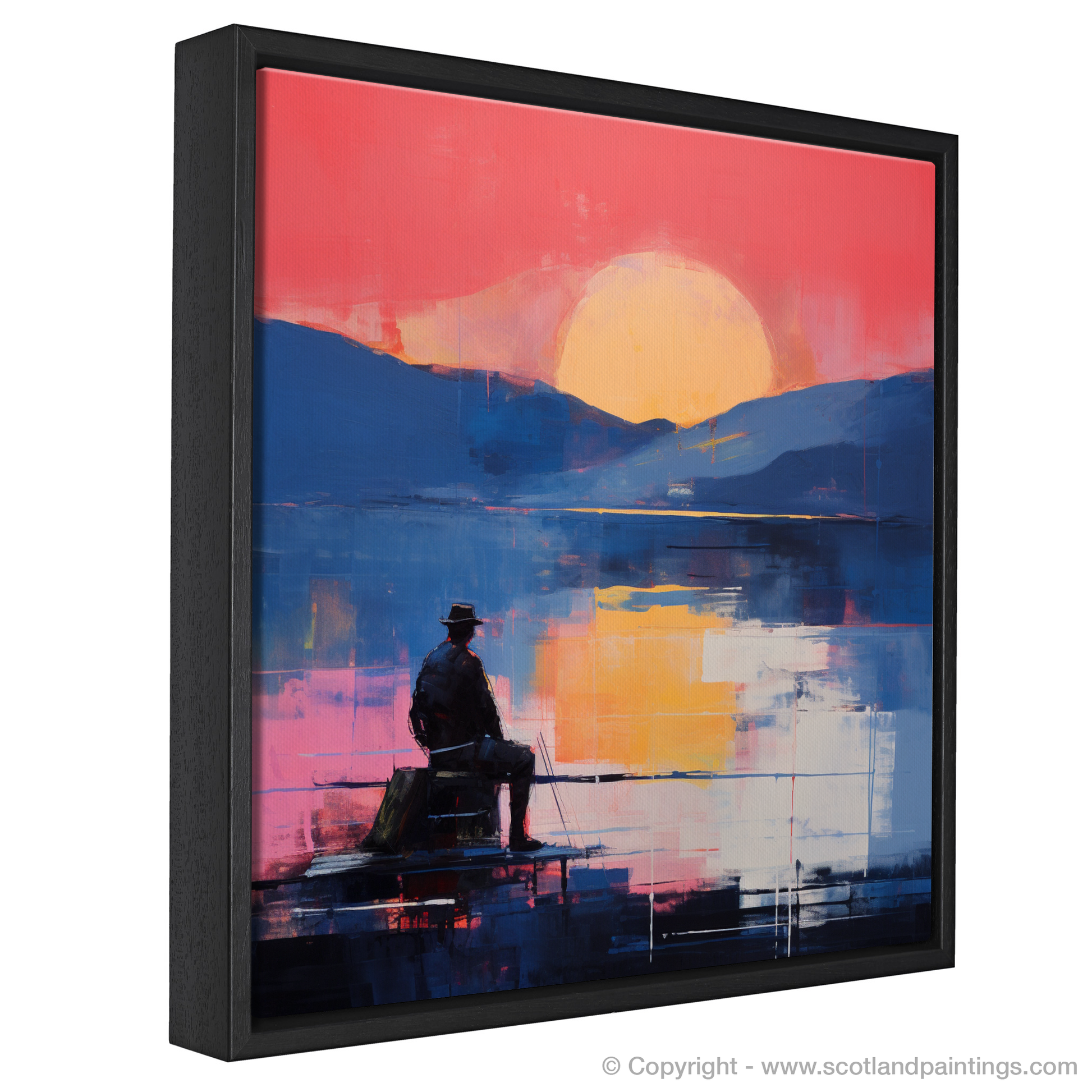 Captured within this evocative print is a scene that embodies the serene beauty of Loch Lomond through the lens of Abstract Impressionism. The artwork features a lone fisherman, rendered as a silhouette against a mesmerising backdrop, his posture one of patient tranquillity. The composition is bathed in a dramatic interplay of colours, with a bold, fiery orb of a sun descending behind the undulating profile of distant hills, casting an array of warm hues across the sky.