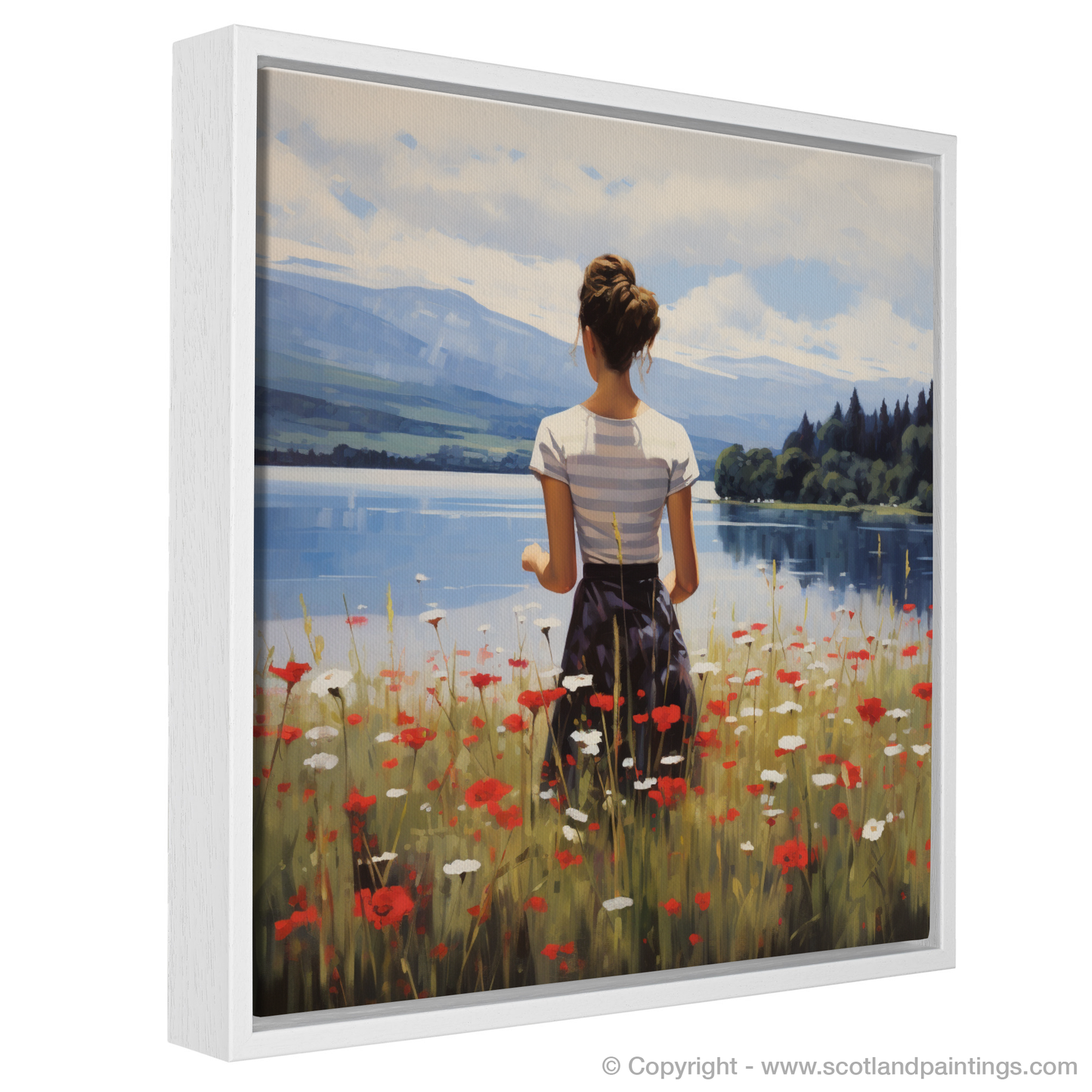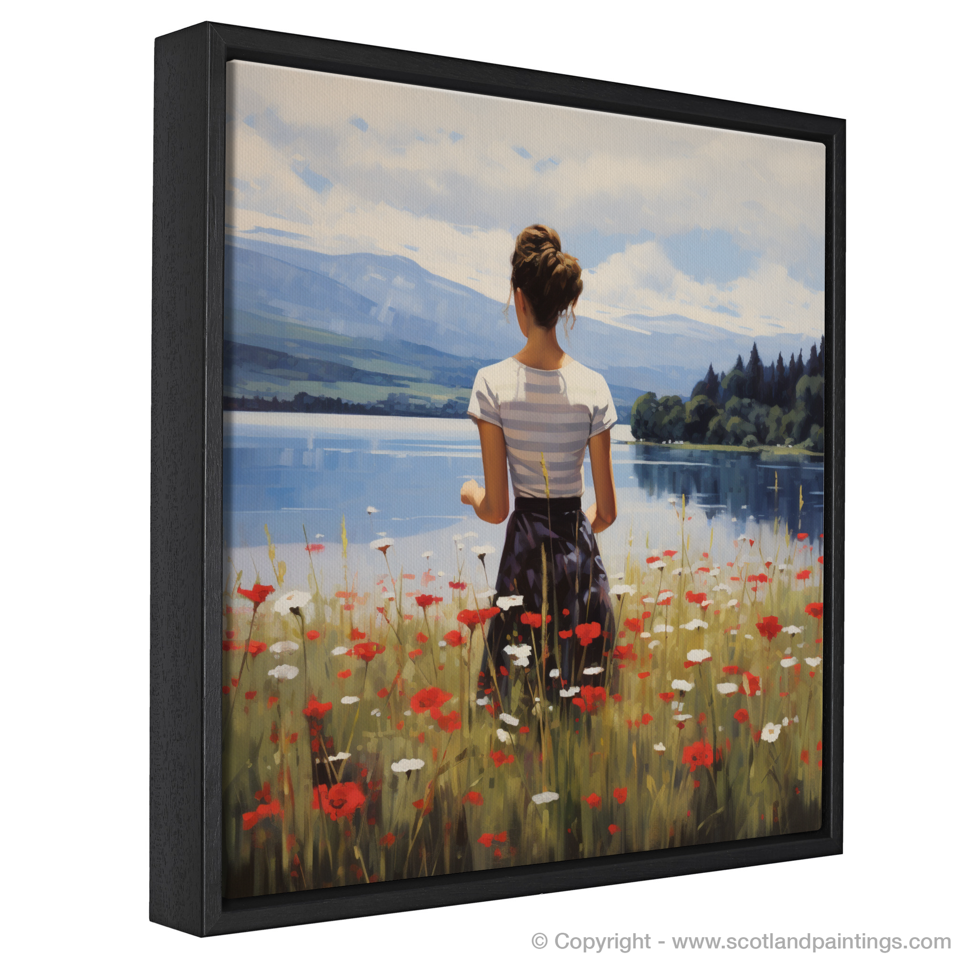 Captured within this exquisite print is an evocative scene of natural elegance and serene beauty inspired by the iconic wildflowers by Loch Lomond. One is instantly drawn to the central figure, a young woman viewed from behind, who stands amidst a sea of blooming wildflowers, her attention captivated by the tranquil expanse of water before her. The woman's casual attire—a horizontal-striped T-shirt paired with a dark skirt—blends harmoniously with the surroundings, as though she is a natural part of this picturesque landscape.
