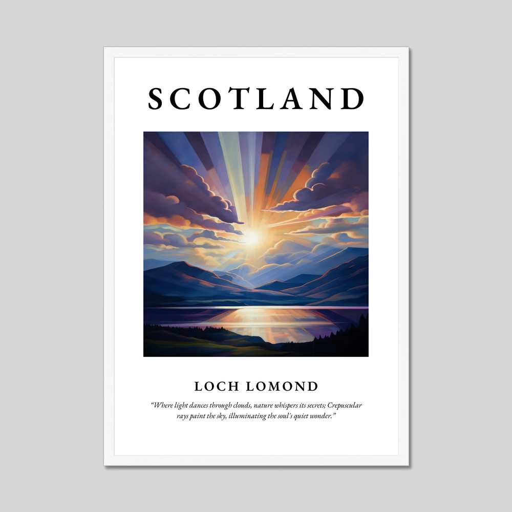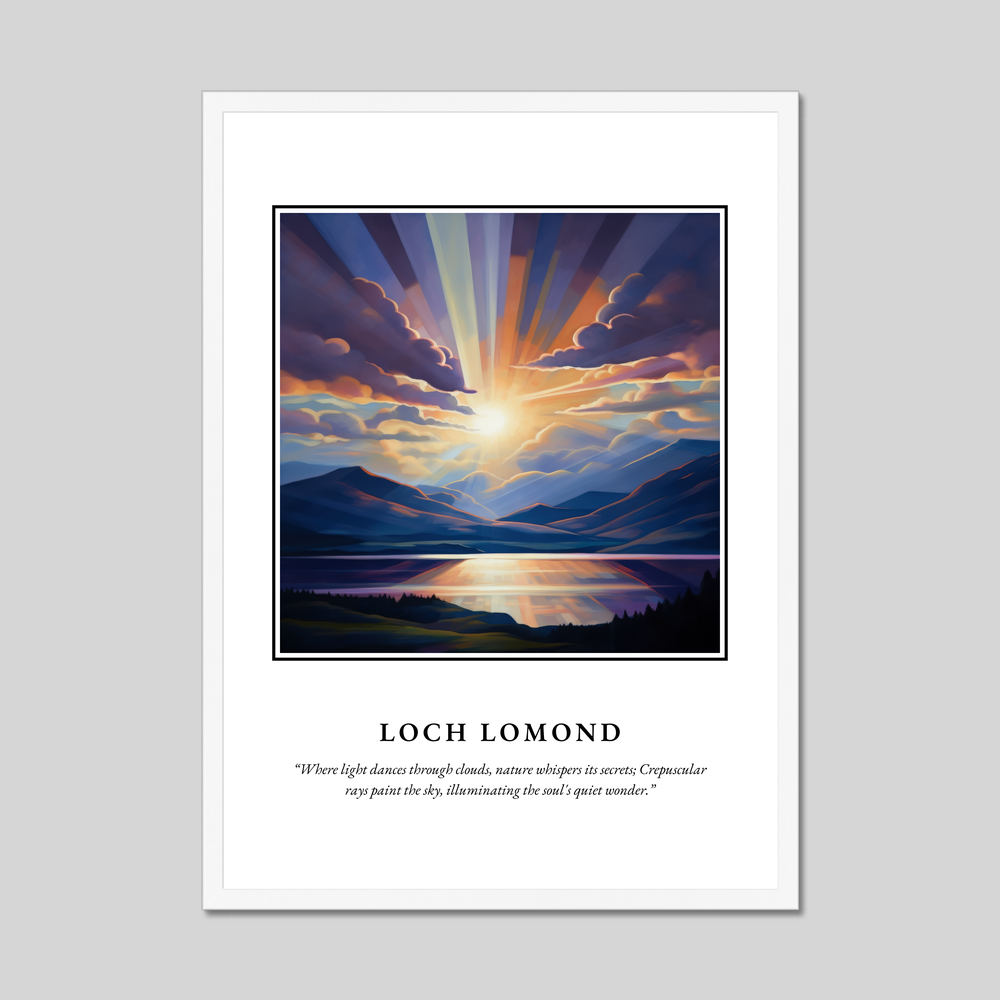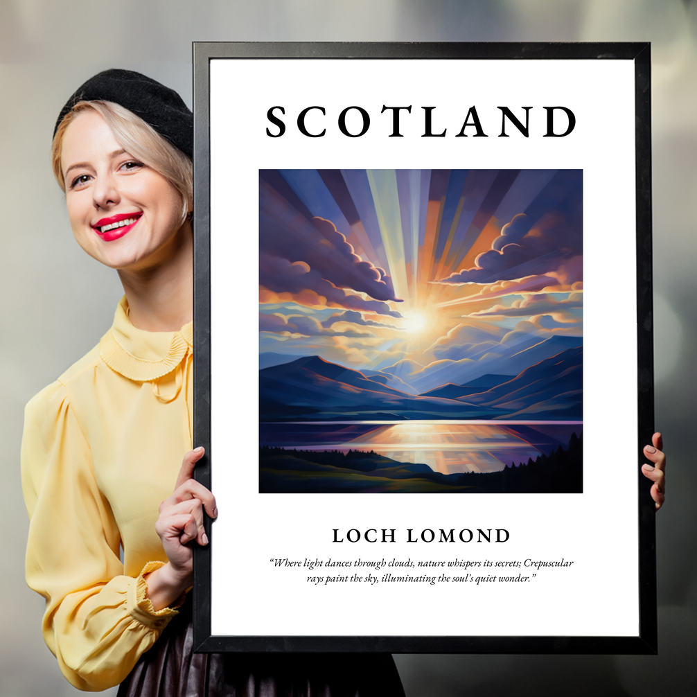 At the top of the poster, the bold lettering of "SCOTLAND" heralds the captivating scene beneath: a mesmerising rendition of Loch Lomond. Painted in the Realism style, the artwork vividly captures the ethereal quality of the loch, where tranquil waters meet the sky. The play of light and shadow amongst the clouds highlights the natural splendour of this Scottish treasure. Beneath this visual masterpiece is the evocative quote in graceful text: “Where light dances through clouds, nature whispers its secrets; Crepuscular rays paint the sky, illuminating the soul's quiet wonder.” This quote encapsulates the scene's serene and mystical atmosphere.