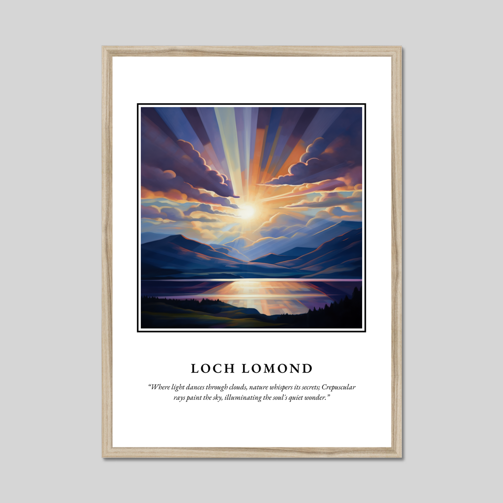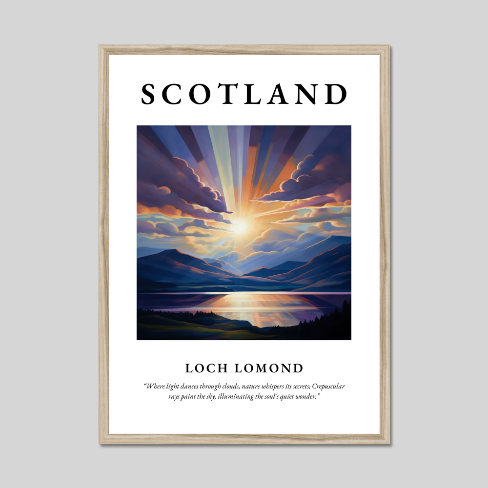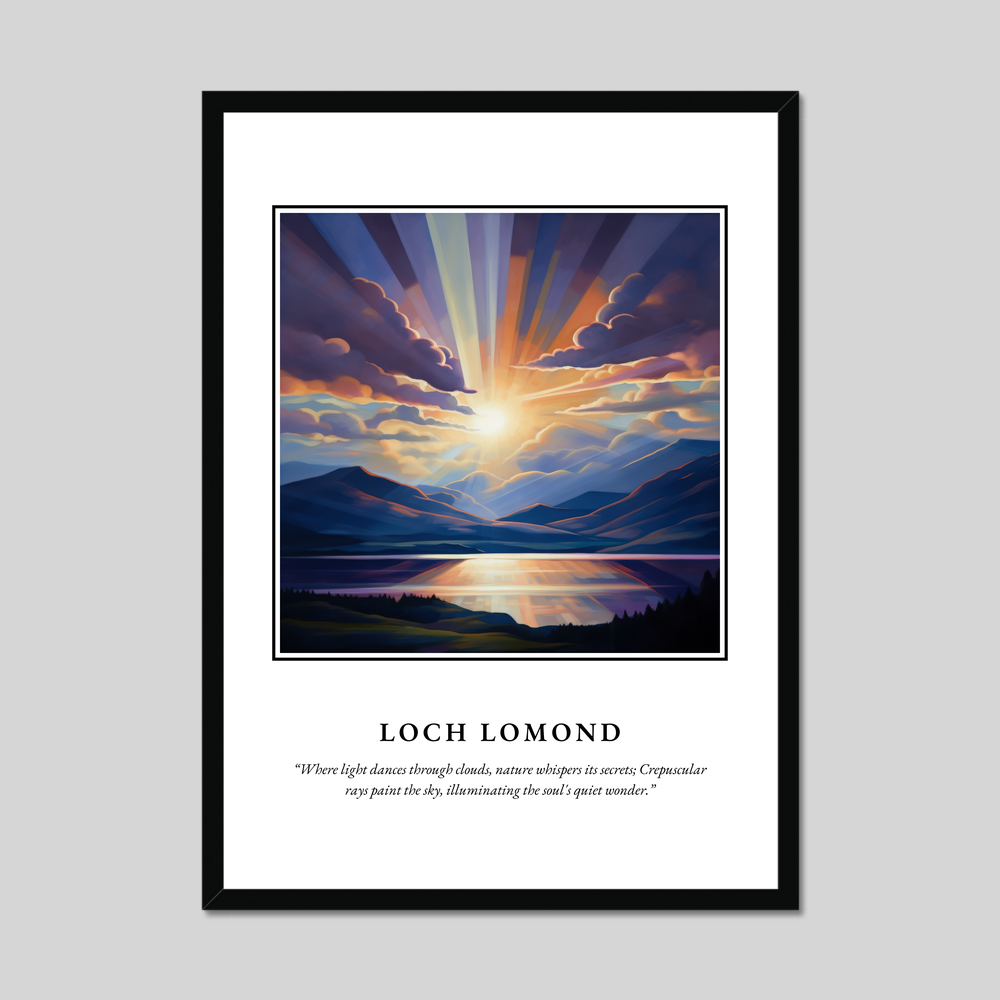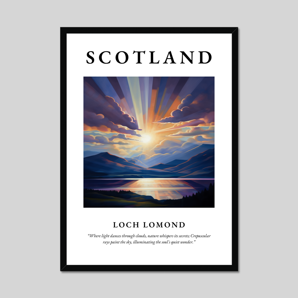 At the top of the poster, the bold lettering of "SCOTLAND" heralds the captivating scene beneath: a mesmerising rendition of Loch Lomond. Painted in the Realism style, the artwork vividly captures the ethereal quality of the loch, where tranquil waters meet the sky. The play of light and shadow amongst the clouds highlights the natural splendour of this Scottish treasure. Beneath this visual masterpiece is the evocative quote in graceful text: “Where light dances through clouds, nature whispers its secrets; Crepuscular rays paint the sky, illuminating the soul's quiet wonder.” This quote encapsulates the scene's serene and mystical atmosphere.