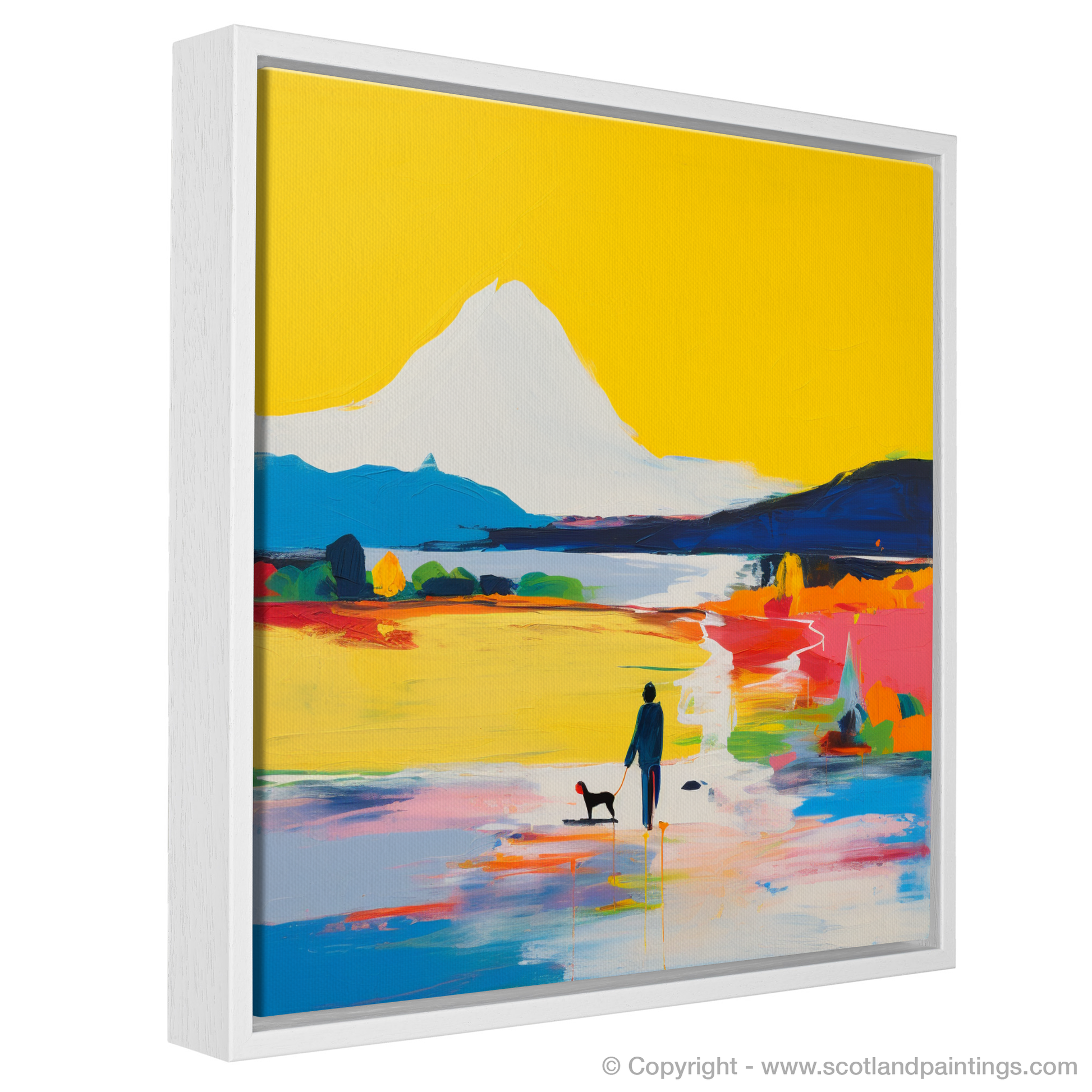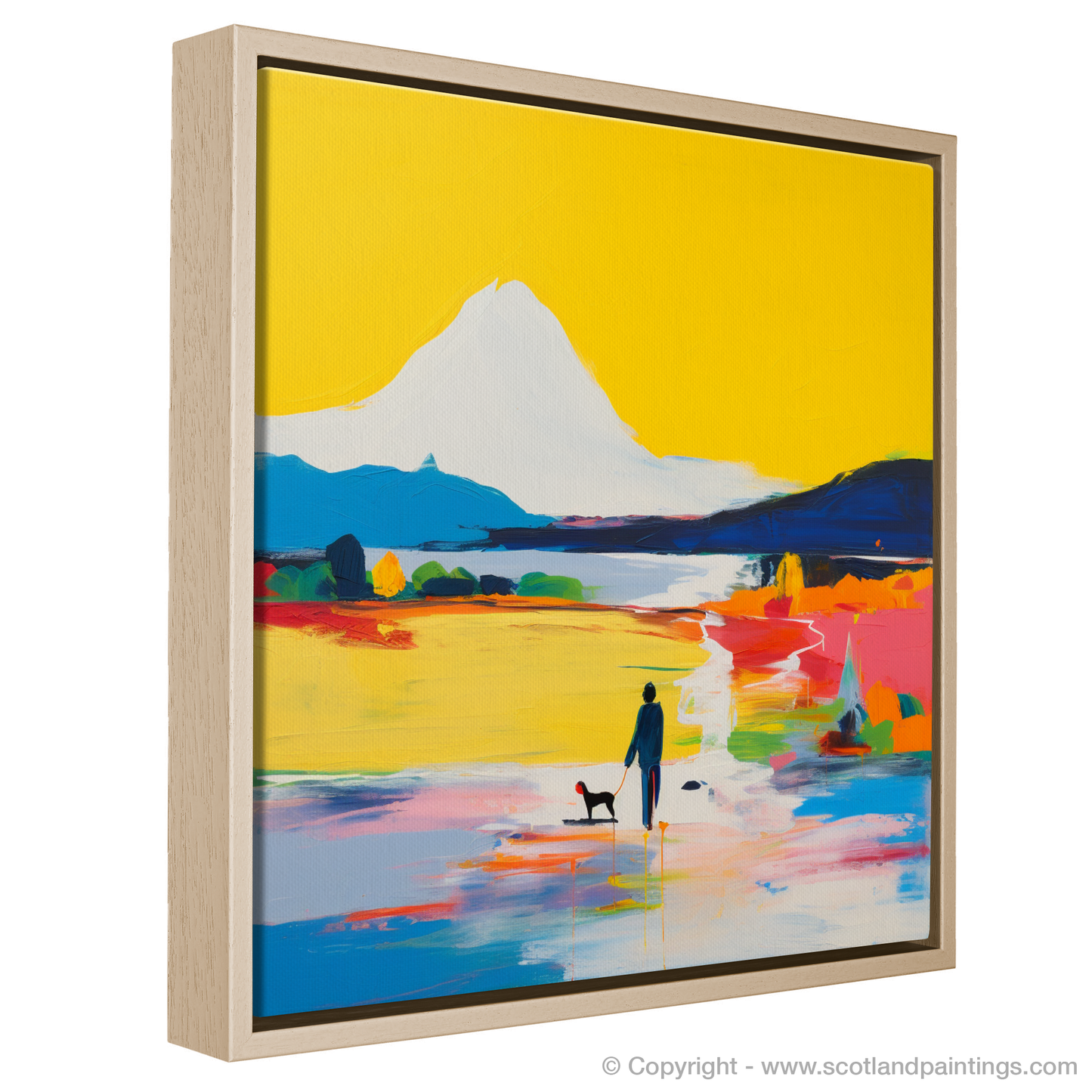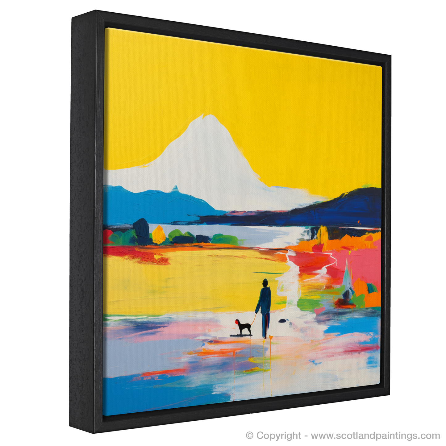 This vibrant print captures the essence of a serene moment by Loch Lomond through an abstract lens. Bold strokes of colour set the tone for this piece as a vivid yellow sky dominates the background, creating an almost mystical aura. The central figure of a man and his loyal canine companion is silhouetted against the dazzling display, rendered in deep blues with subtle hints of shadow and form.
