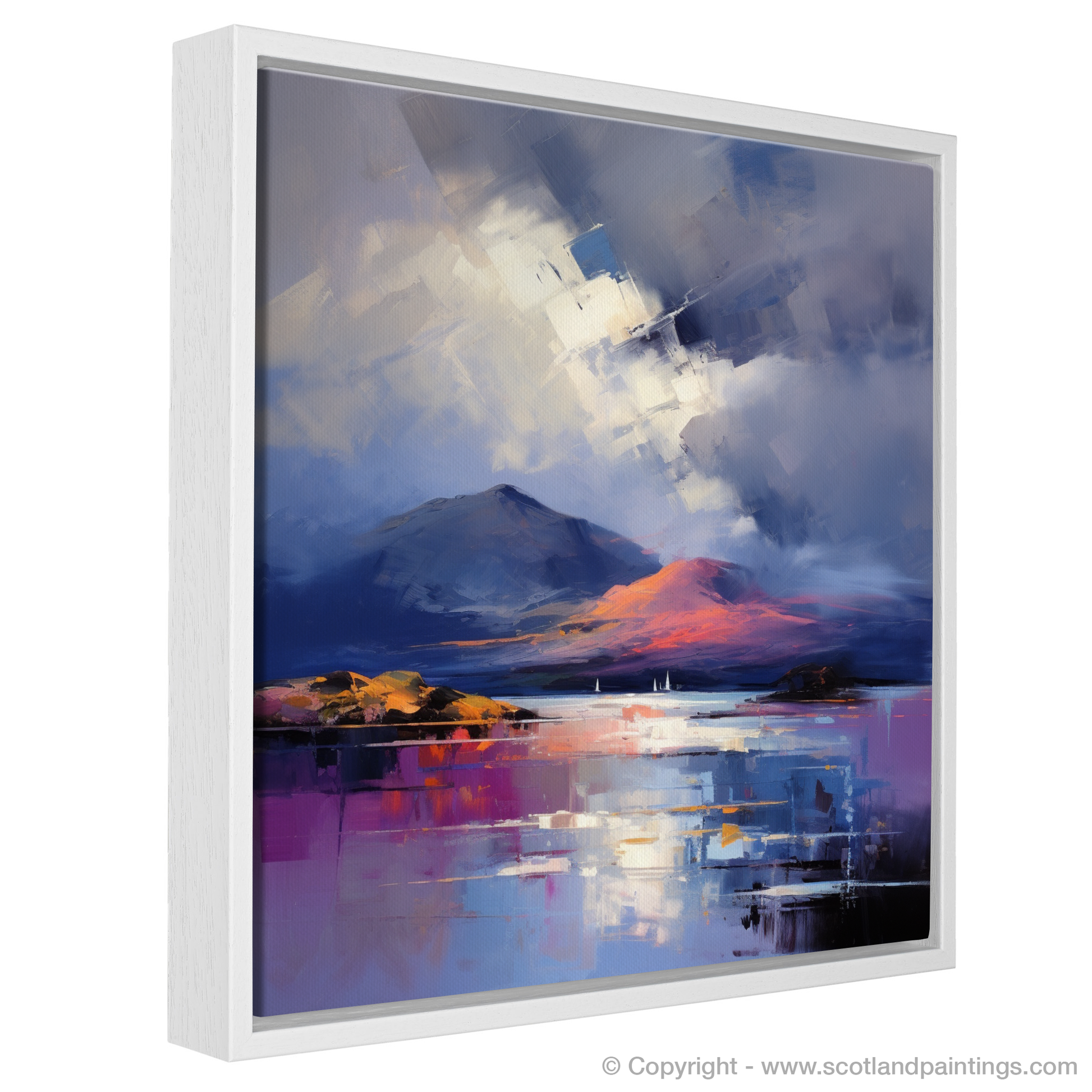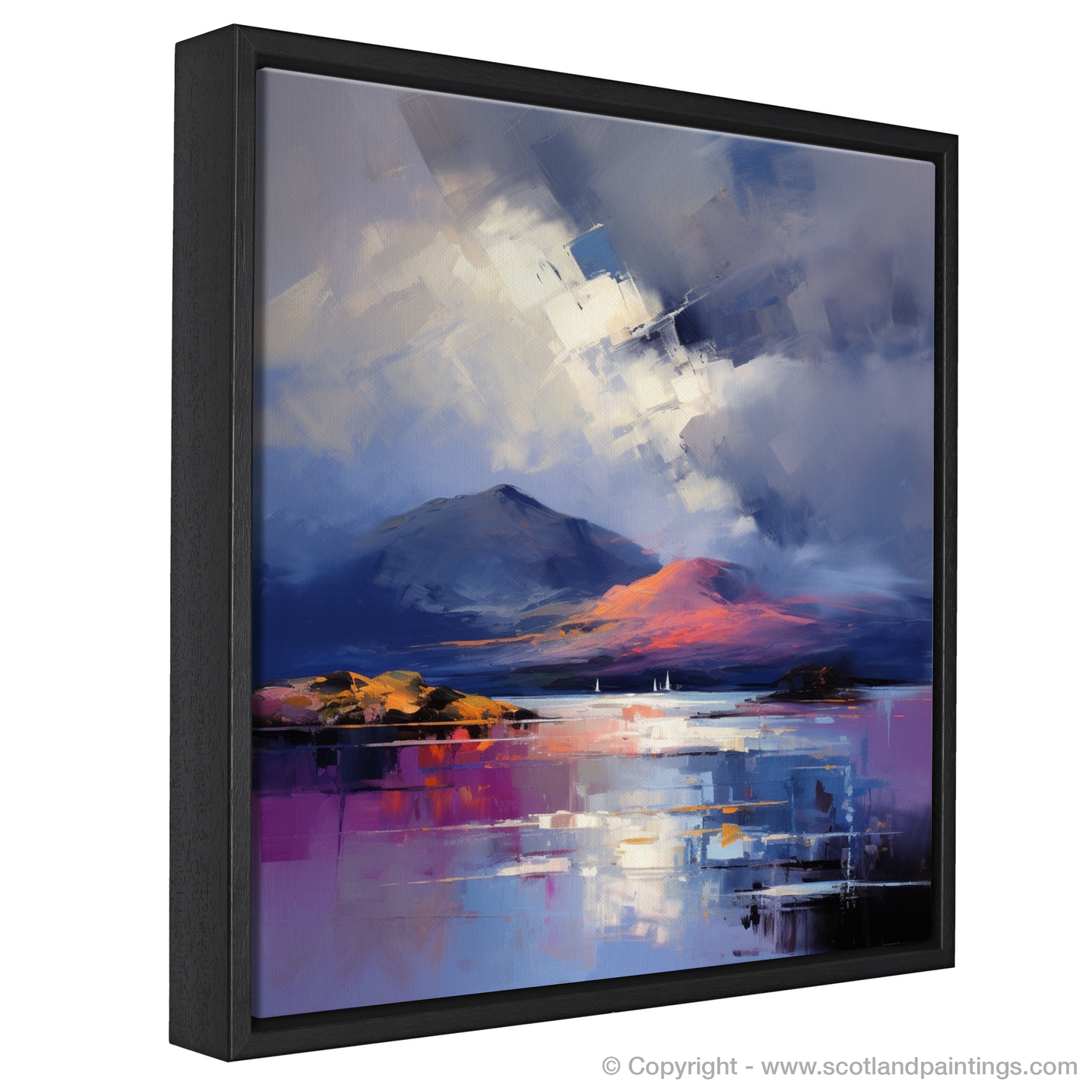 The print invites the viewer to experience the contrast of the fleeting, fiery kiss of sunset against the cool, ominous advance of the storm. With its rich textures and poignant use of colour, this piece is a testament to the expressive power of the style, and an homage to the untamed beauty of Scotland's landscapes. It's an ideal choice for anyone wishing to bring a touch of the Highlands' dramatic character into their space.