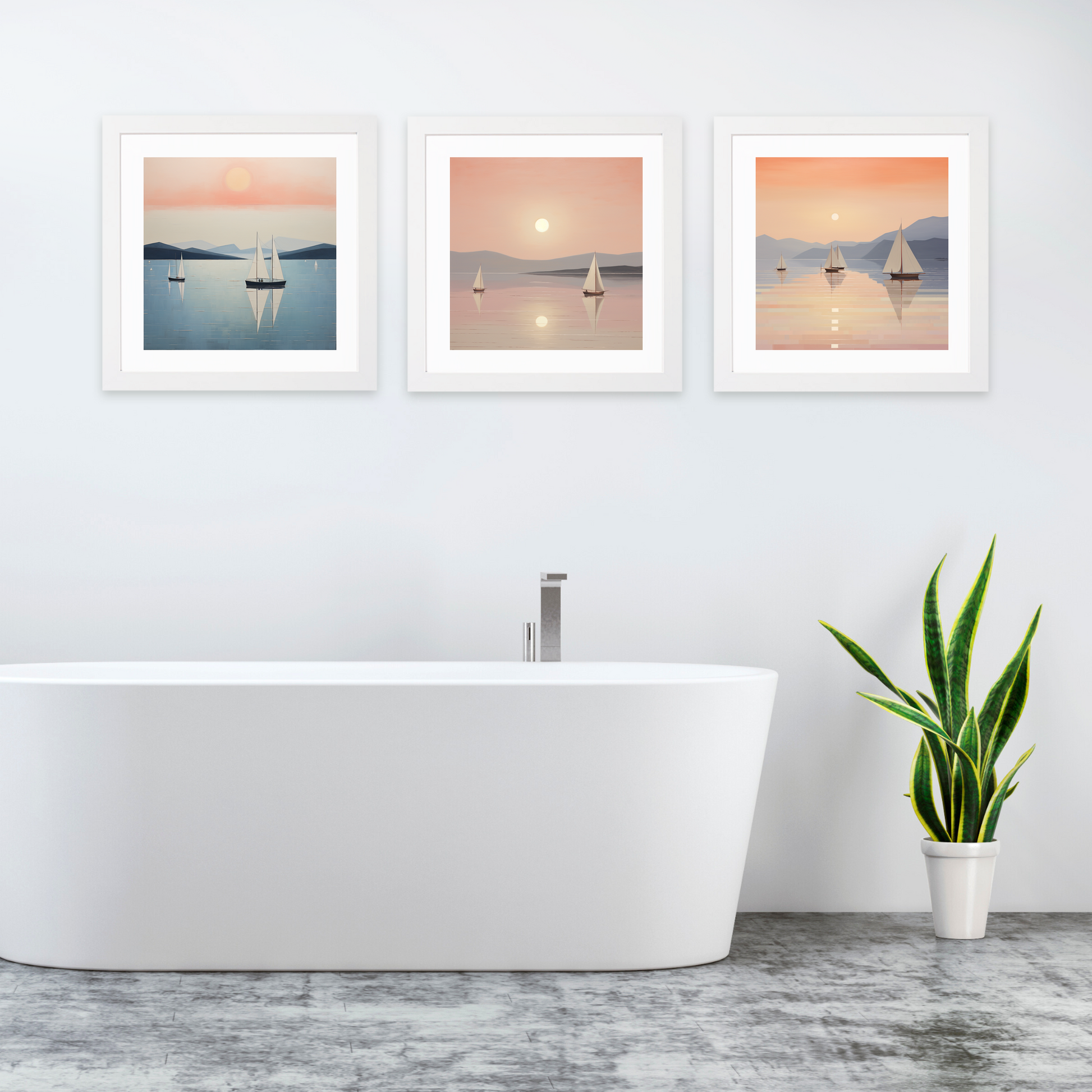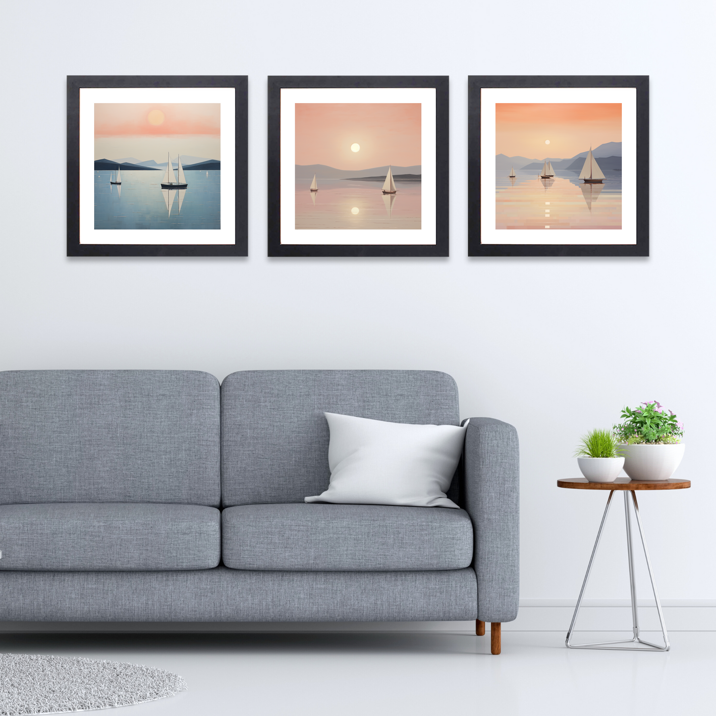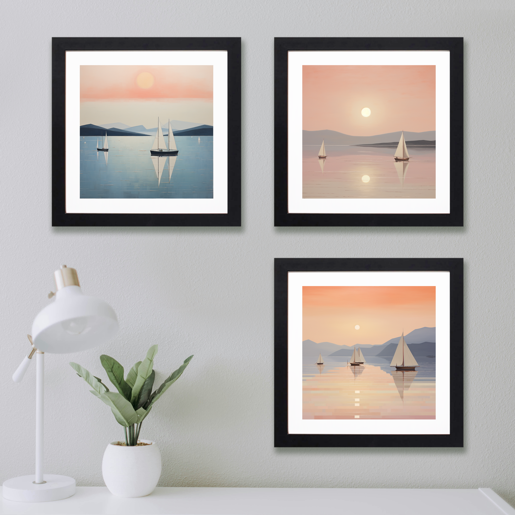 Introducing a stunning set of three framed prints that capture the serene beauty of Sailing Boats on Loch Lomond at sunset, available exclusively from ScotlandPaintings.com. This exquisite collection is part of the Loch Lomond series, designed to invite tranquility and elegance into your home. Each print encapsulates the majestic expanse of water, graceful sailboats, and the ethereal glow of a setting sun, bringing a calming presence to any room.
