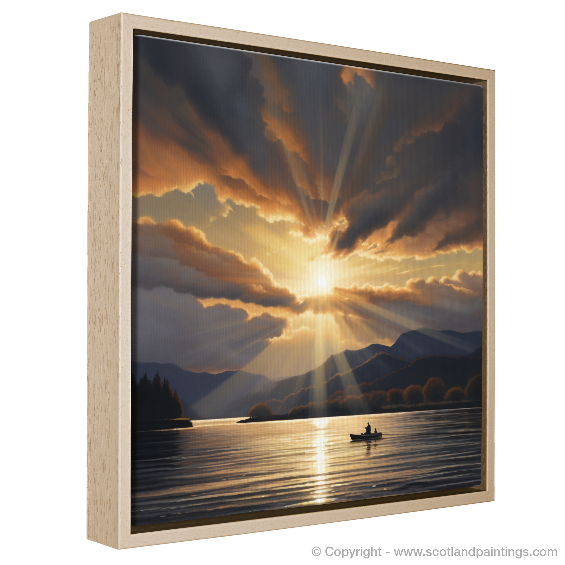 Capturing the ethereal beauty of natural light as it pierces through the majestic cloud cover, this exquisite print transports viewers to the serene environs of Loch Lomond. The painter's adept use of the Realism style vividly brings to life the calm waters of the Loch, shimmering under the awe-inspiring display of Crepuscular rays. Delicate gradations of light and shadow play across the clouds and sky, while the sun's luminous disc hangs low, suggesting either an early dawn or the approach of twilight.