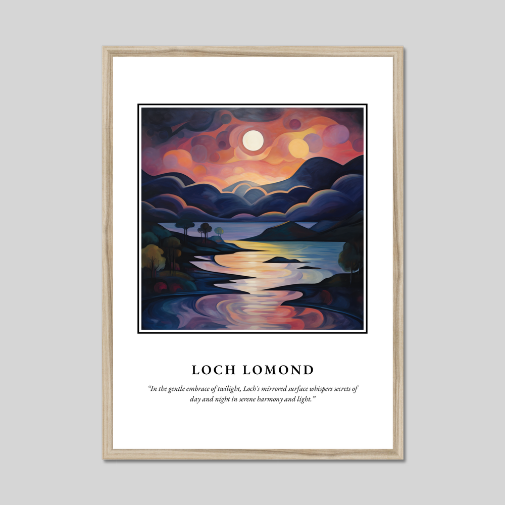 Capture the essence of Scotland's natural beauty with our striking 50cm x 70cm framed poster print, a breathtaking tribute to Loch Lomond. This bold, abstract representation transforms your living space with vibrant swirls of colour that reflect the magical twilight setting over the loch. The large format ensures that it commands attention, becoming the focal point of any room, whilst remaining an affordable luxury.