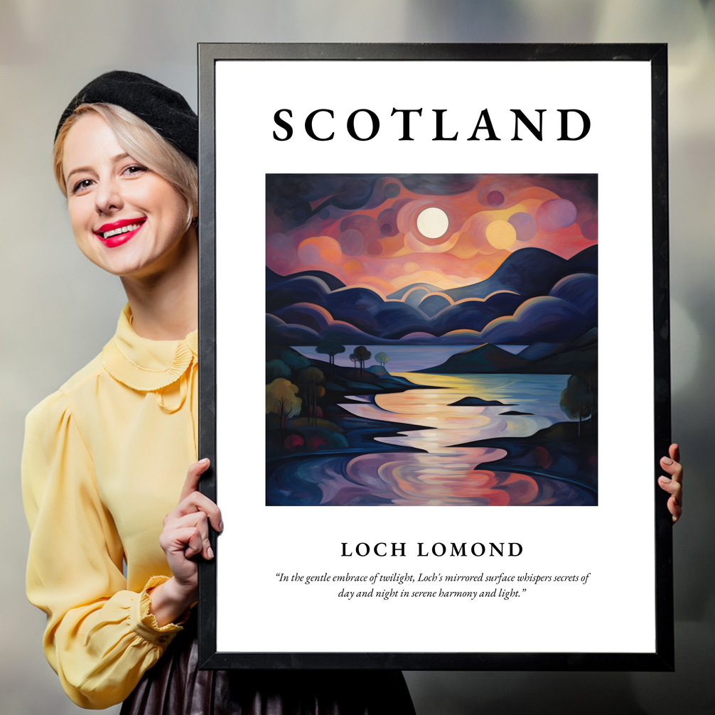 Choose from a sleek black, crisp white, or warm natural wood-effect frame to complement your décor. The poster features the word “SCOTLAND” in bold lettering above the evocative painting, while the quote beneath whispers, “In the gentle embrace of twilight, Loch's mirrored surface whispers secrets of day and night in serene harmony and light.” This poetic touch adds a layer of introspection, perfect for those who hold a deep connection to the place, have visited, or simply appreciate its serene allure.