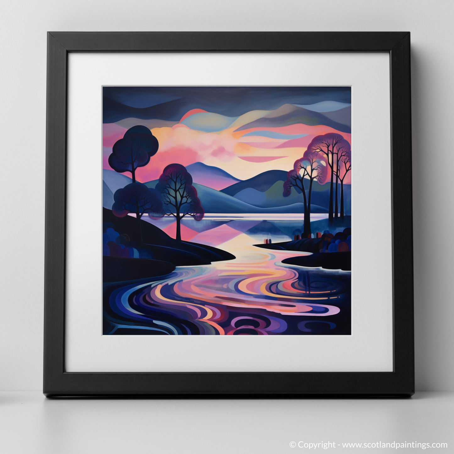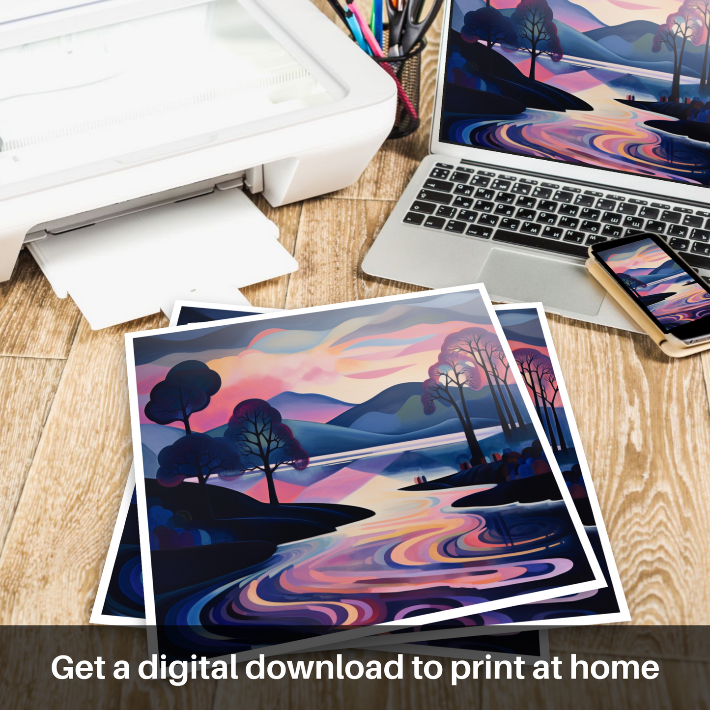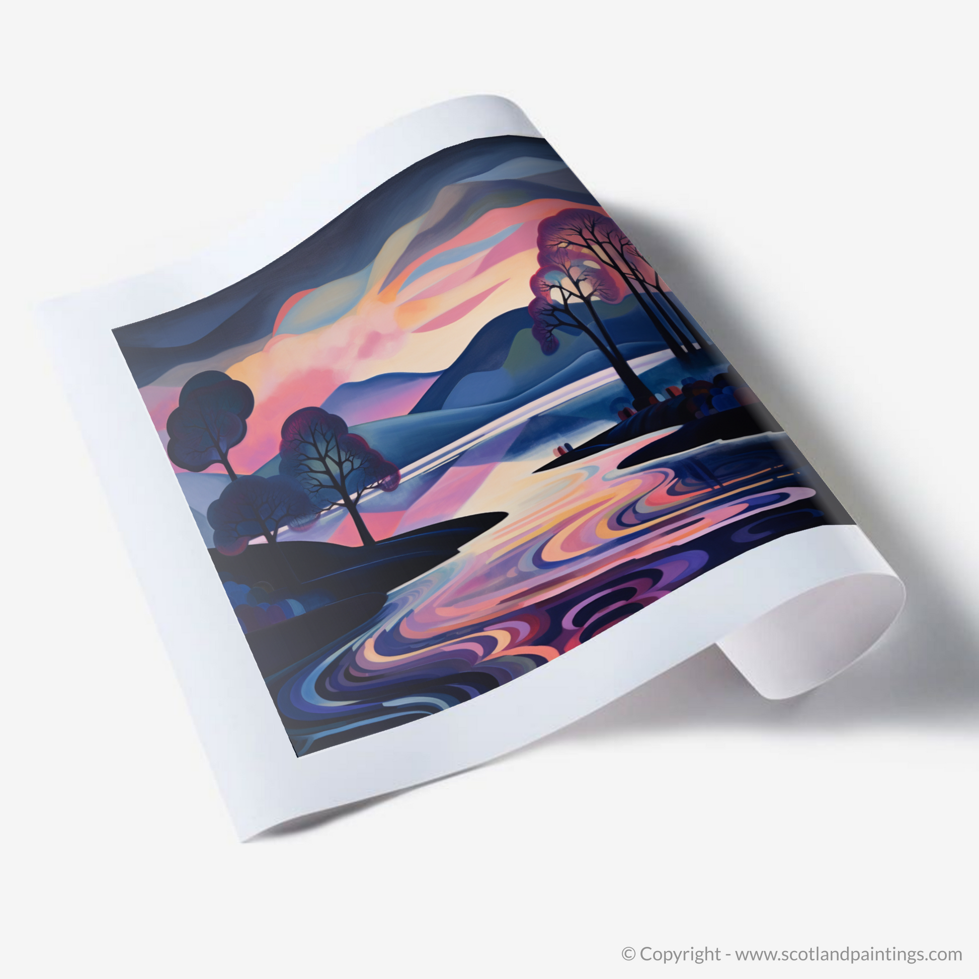 Capturing the ethereal beauty of dusk, this artwork offers a visual symphony of vibrant hues and sweeping abstract forms that evoke the serene majesty of Loch Lomond. Swathes of pink, orange, and purple dance across the sky, their reflections shimmering on the water's surface in a whirl of impressionistic swirls and ripples. Deep blues and purples define the undulating hills, carving a stark silhouette against the twilight glow, while trees stand sentinel along the banks—some with leaves and others bare, adding a note of contemplative melancholy to the scene.