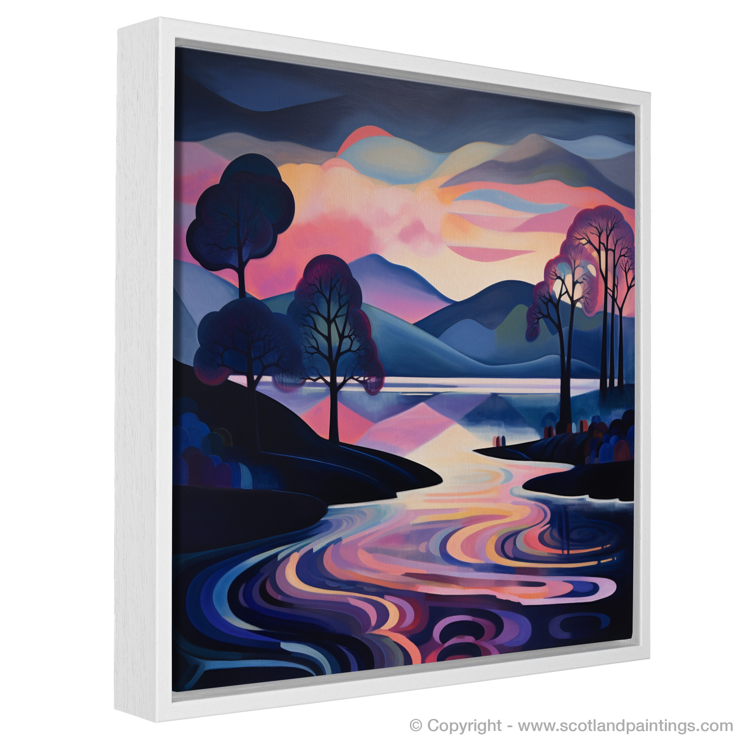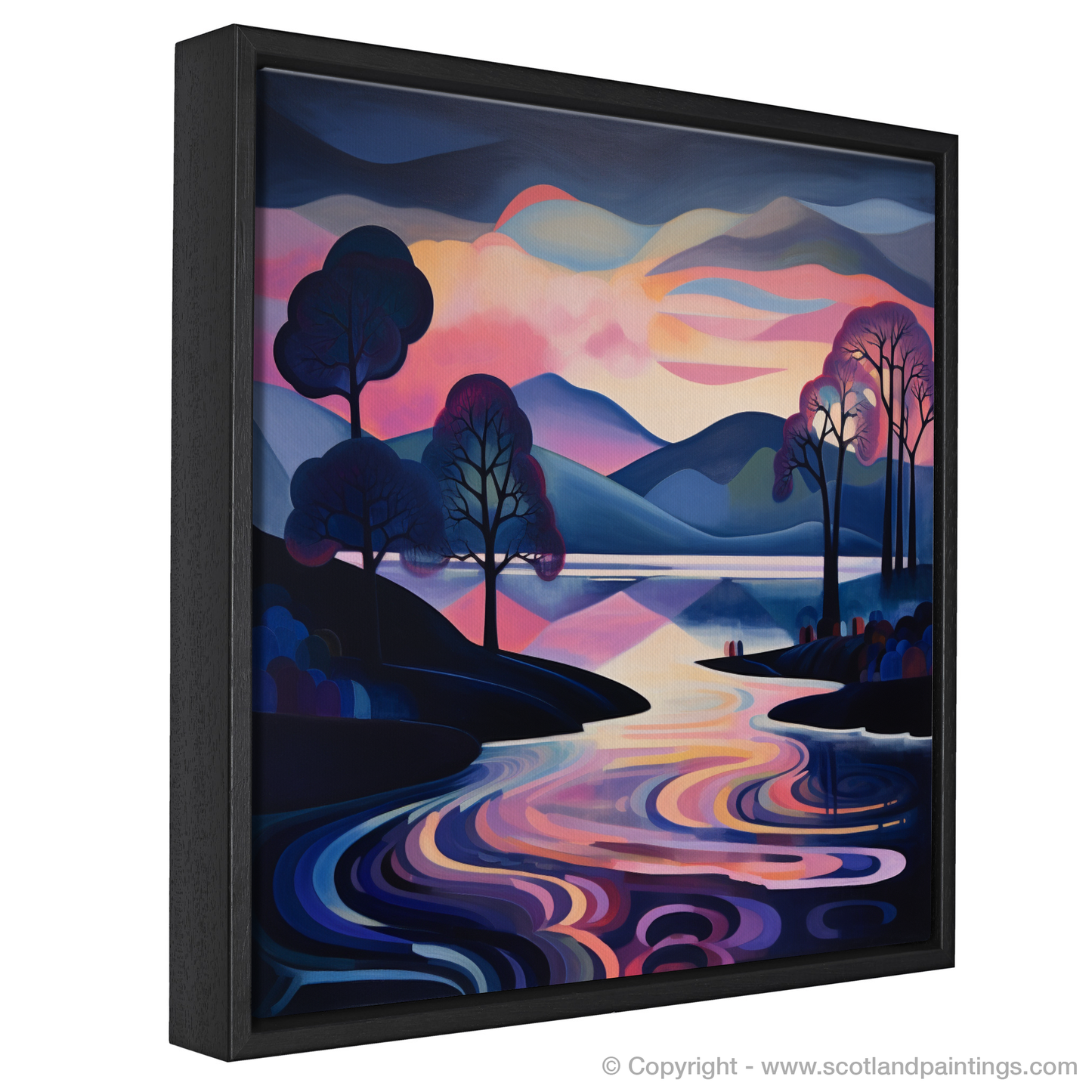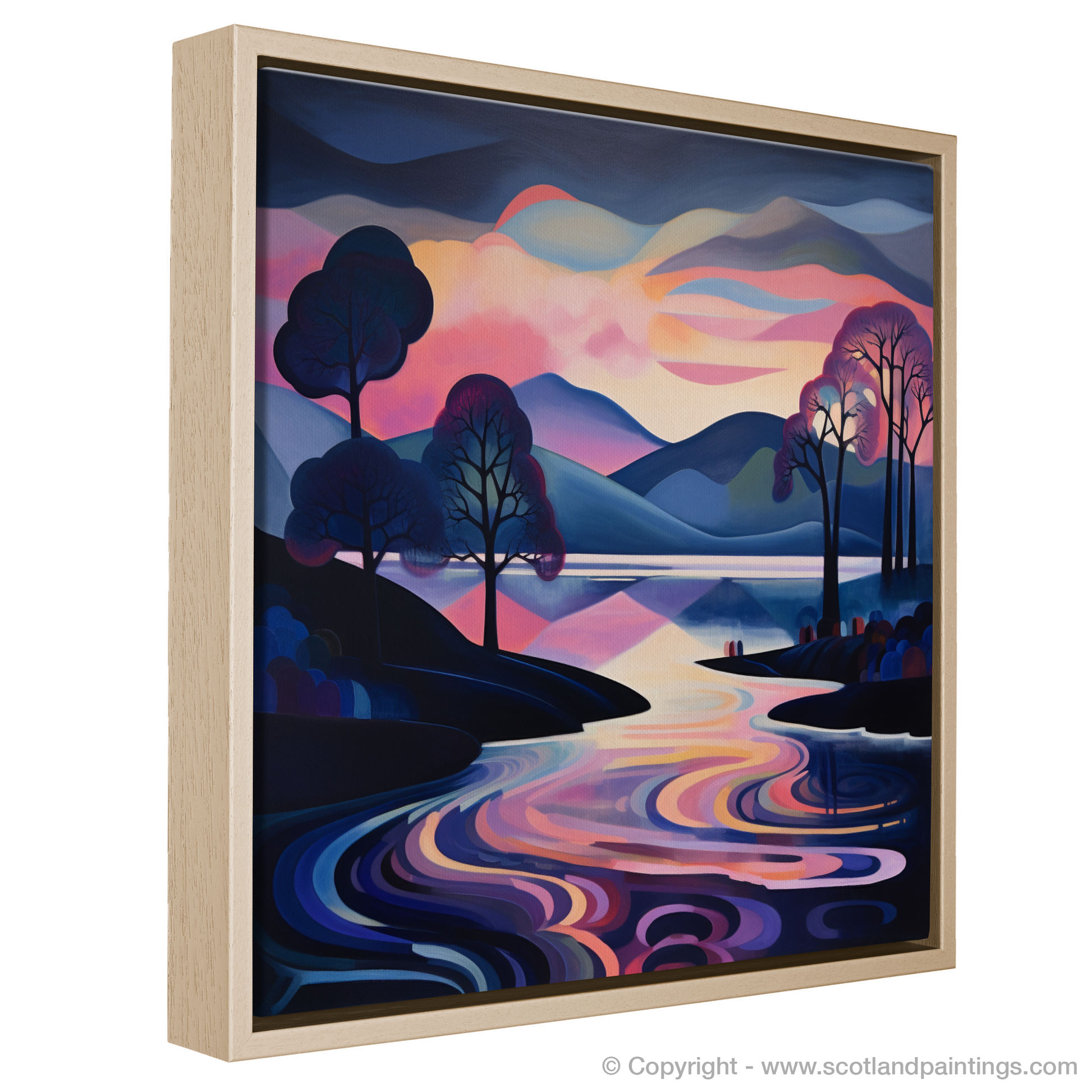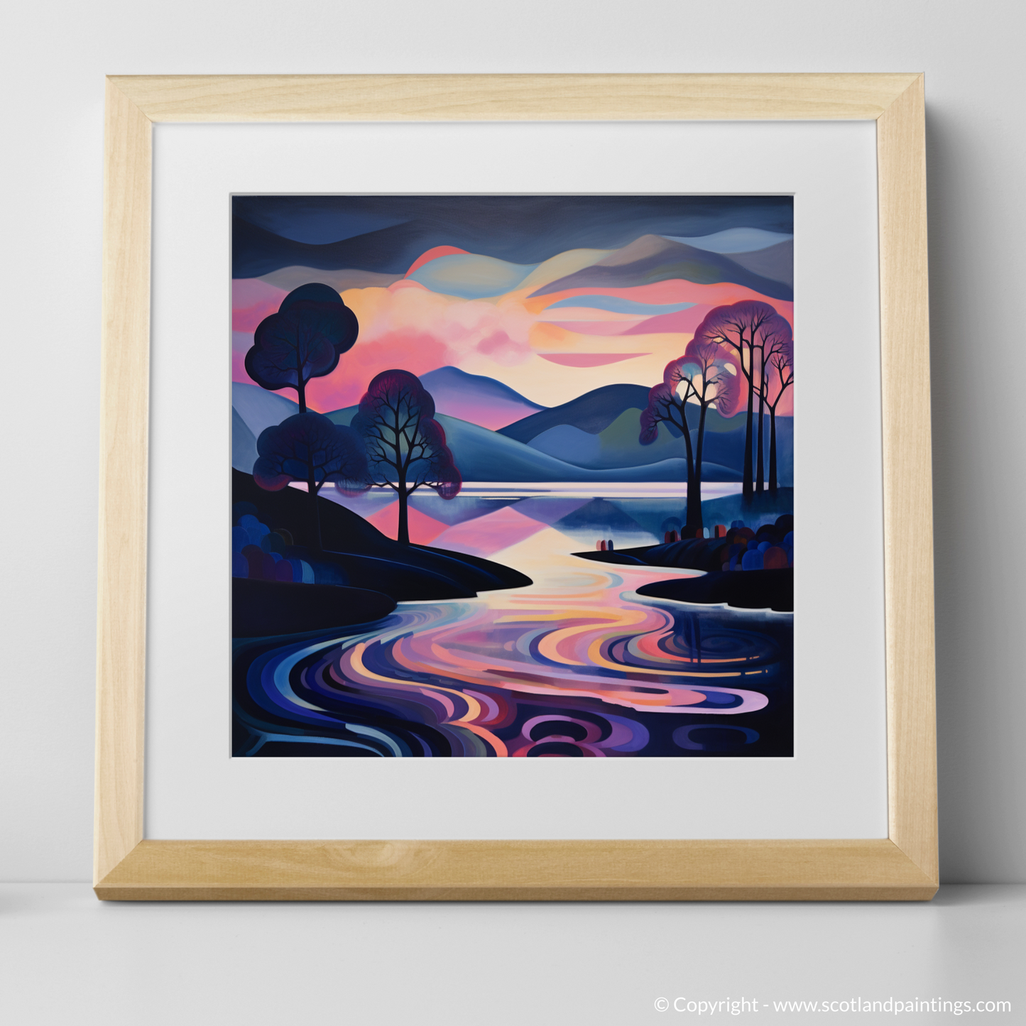 Capturing the ethereal beauty of dusk, this artwork offers a visual symphony of vibrant hues and sweeping abstract forms that evoke the serene majesty of Loch Lomond. Swathes of pink, orange, and purple dance across the sky, their reflections shimmering on the water's surface in a whirl of impressionistic swirls and ripples. Deep blues and purples define the undulating hills, carving a stark silhouette against the twilight glow, while trees stand sentinel along the banks—some with leaves and others bare, adding a note of contemplative melancholy to the scene.
