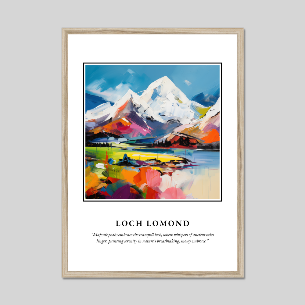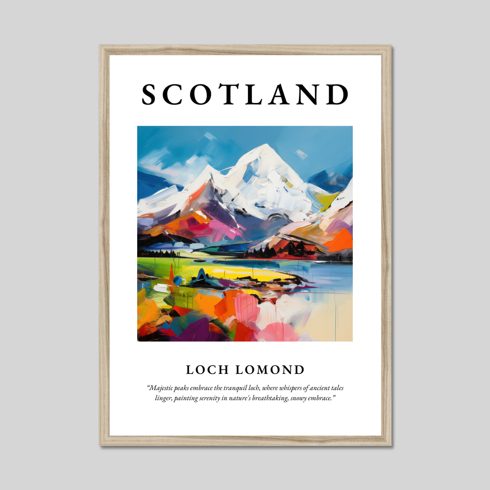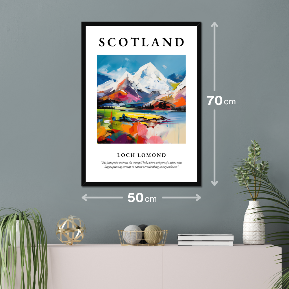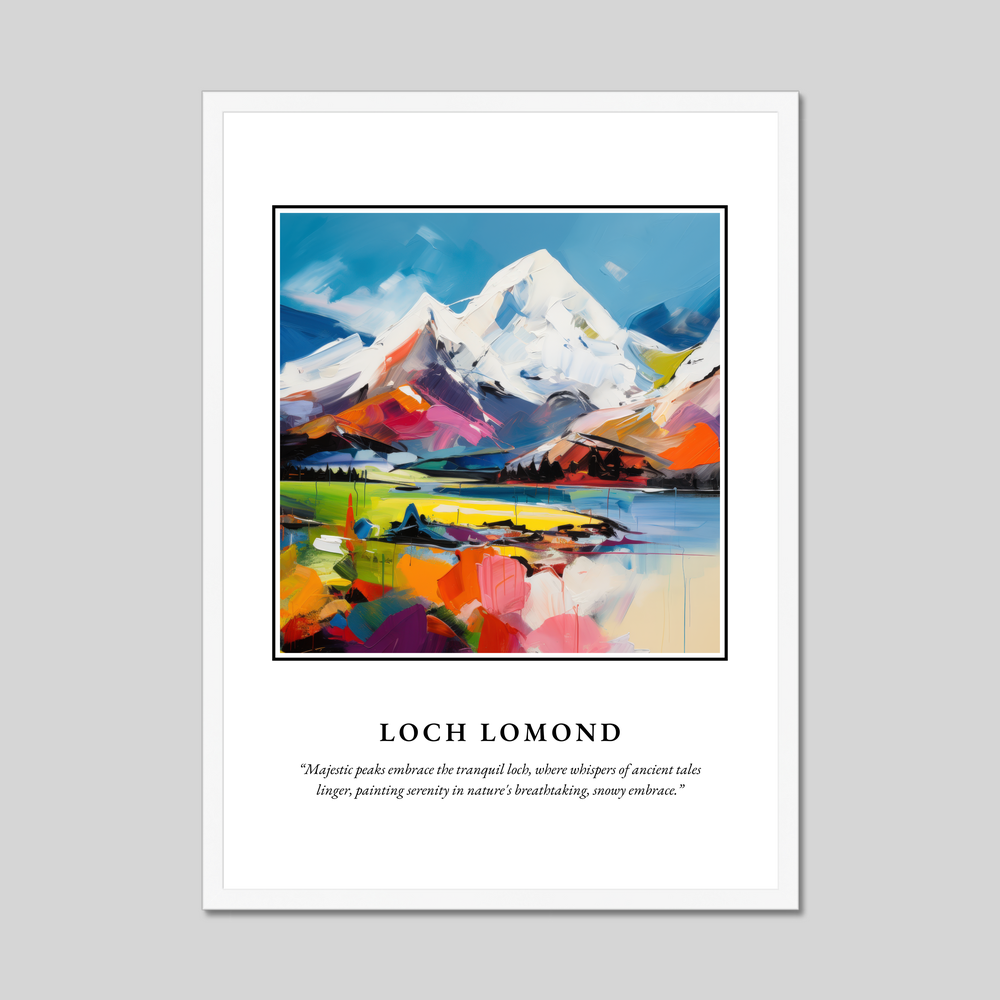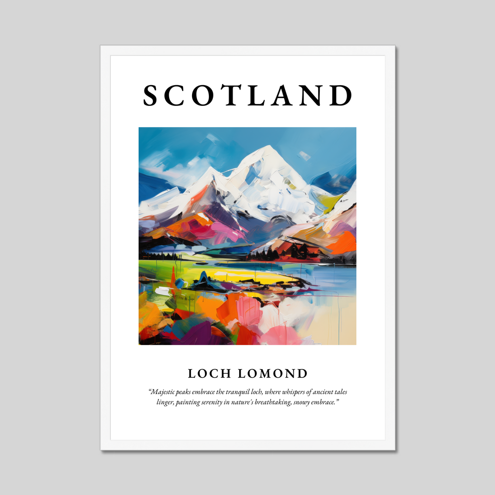The word "SCOTLAND" boldly crowns the poster, leading your eyes down to a breathtaking abstract painting of Loch Lomond. Vibrant hues and dynamic brushstrokes evoke the majestic peaks and tranquil waters, creating a vivid portrayal that speaks to the heart. Beneath the artwork, the evocative quote “Majestic peaks embrace the tranquil loch, where whispers of ancient tales linger, painting serenity in nature's breathtaking, snowy embrace” invites viewers to connect emotionally with the landscape.