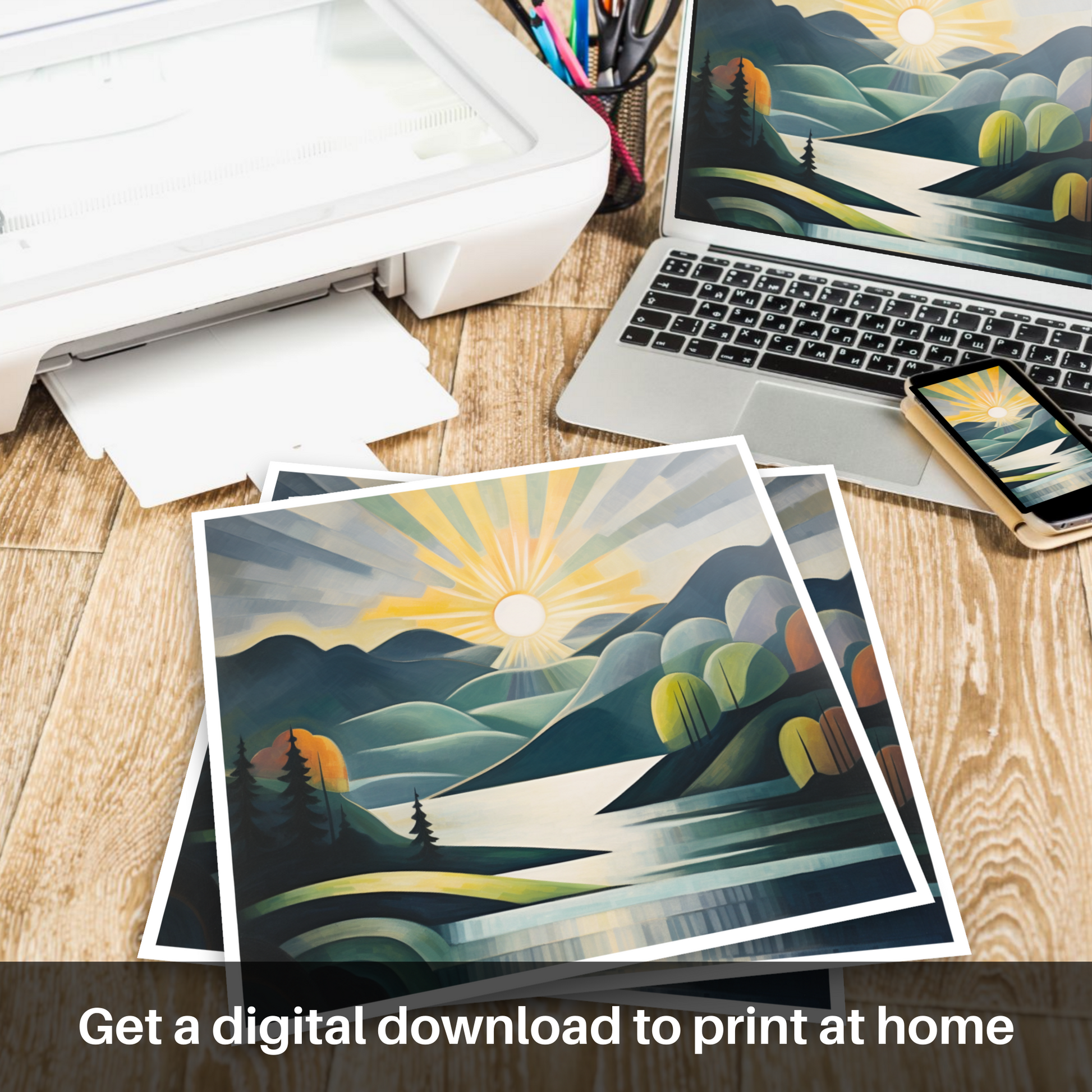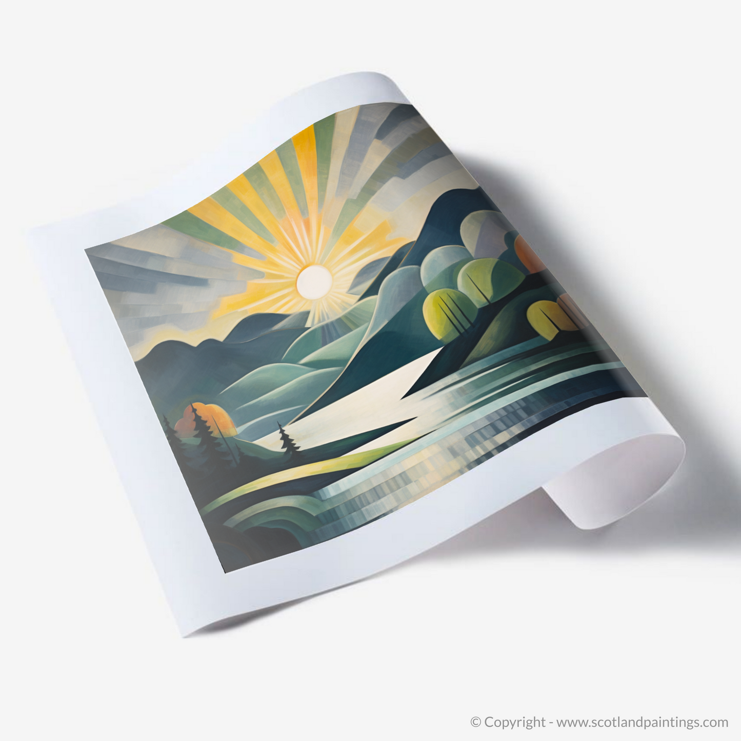 Capturing the majestic beauty of Loch Lomond with a mesmerising interplay of light and colour, this abstract piece offers a contemporary twist on the natural splendour of one of Scotland's most beloved landscapes. The artwork exudes a radiant warmth, with a vibrant sun at its focus, its rays permeating the sky and reflecting off the tranquil waters below. Soft undulating hills are rendered in smooth gradients of blues and greens, creating a rhythm that mirrors the gentle ebb and flow of the loch's serene waters.