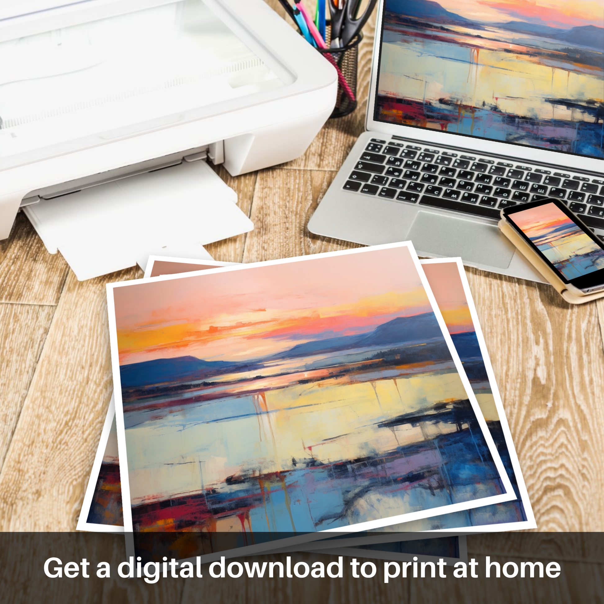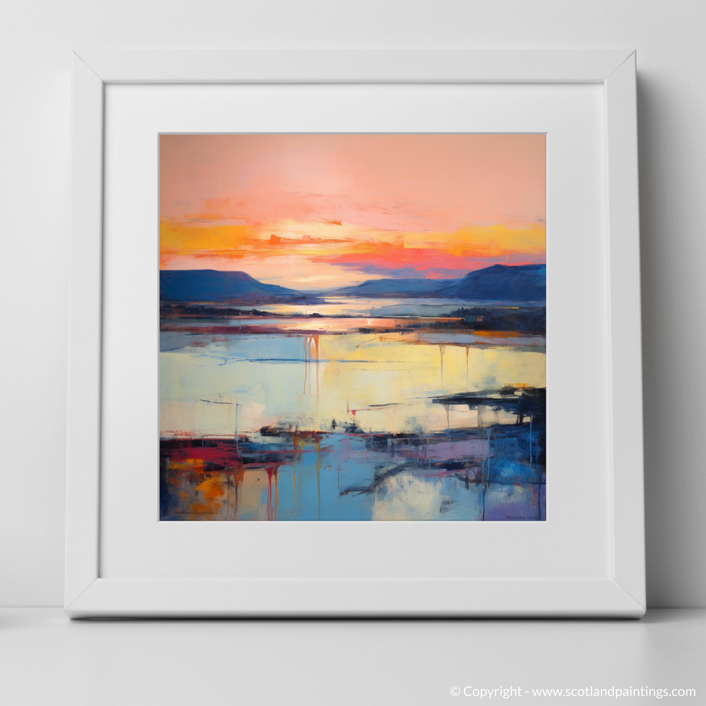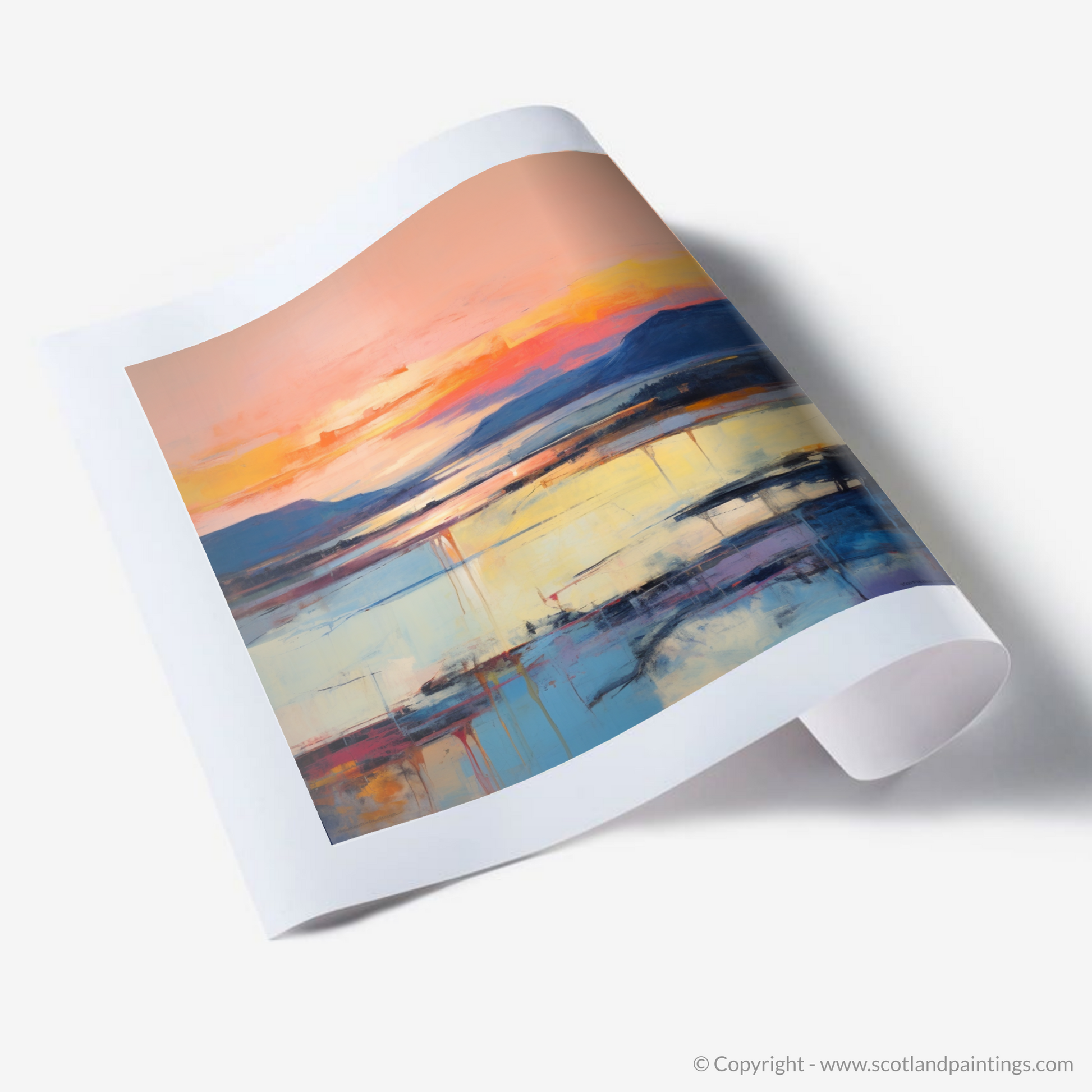 Capturing the ephemeral beauty of a setting sun, this exquisite print is a visual symphony that pays homage to the serene grandeur of Loch Lomond's landscapes. Embracing the essence of Abstract Impressionism, the artwork offers a feast for the eyes with its vibrant palette of warm hues; melting oranges and pinks blend seamlessly into cooler blues, reflecting the last golden kiss of sunlight upon the water's surface.