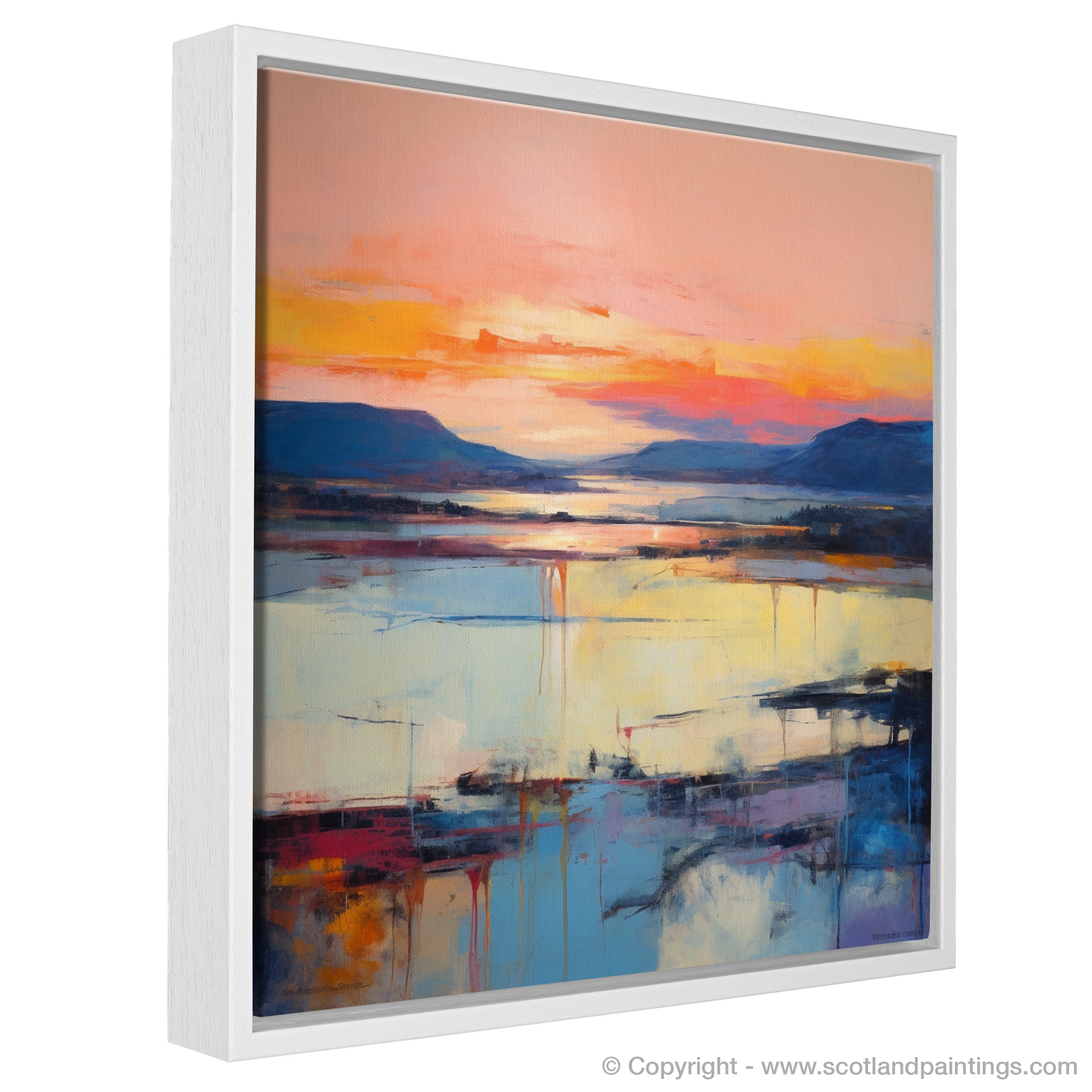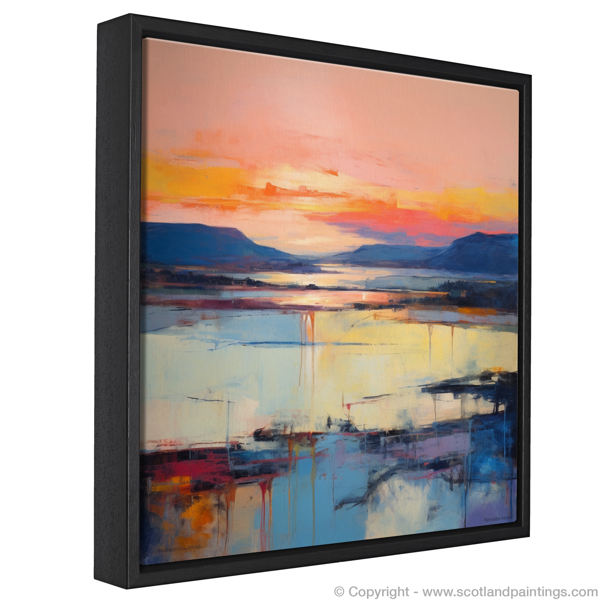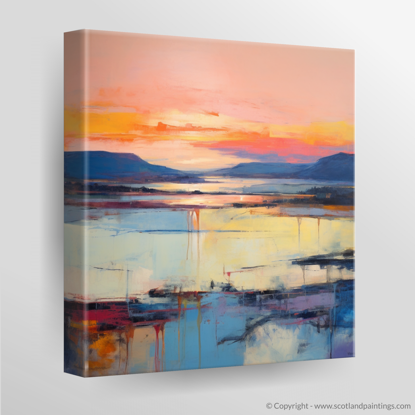 Capturing the ephemeral beauty of a setting sun, this exquisite print is a visual symphony that pays homage to the serene grandeur of Loch Lomond's landscapes. Embracing the essence of Abstract Impressionism, the artwork offers a feast for the eyes with its vibrant palette of warm hues; melting oranges and pinks blend seamlessly into cooler blues, reflecting the last golden kiss of sunlight upon the water's surface.