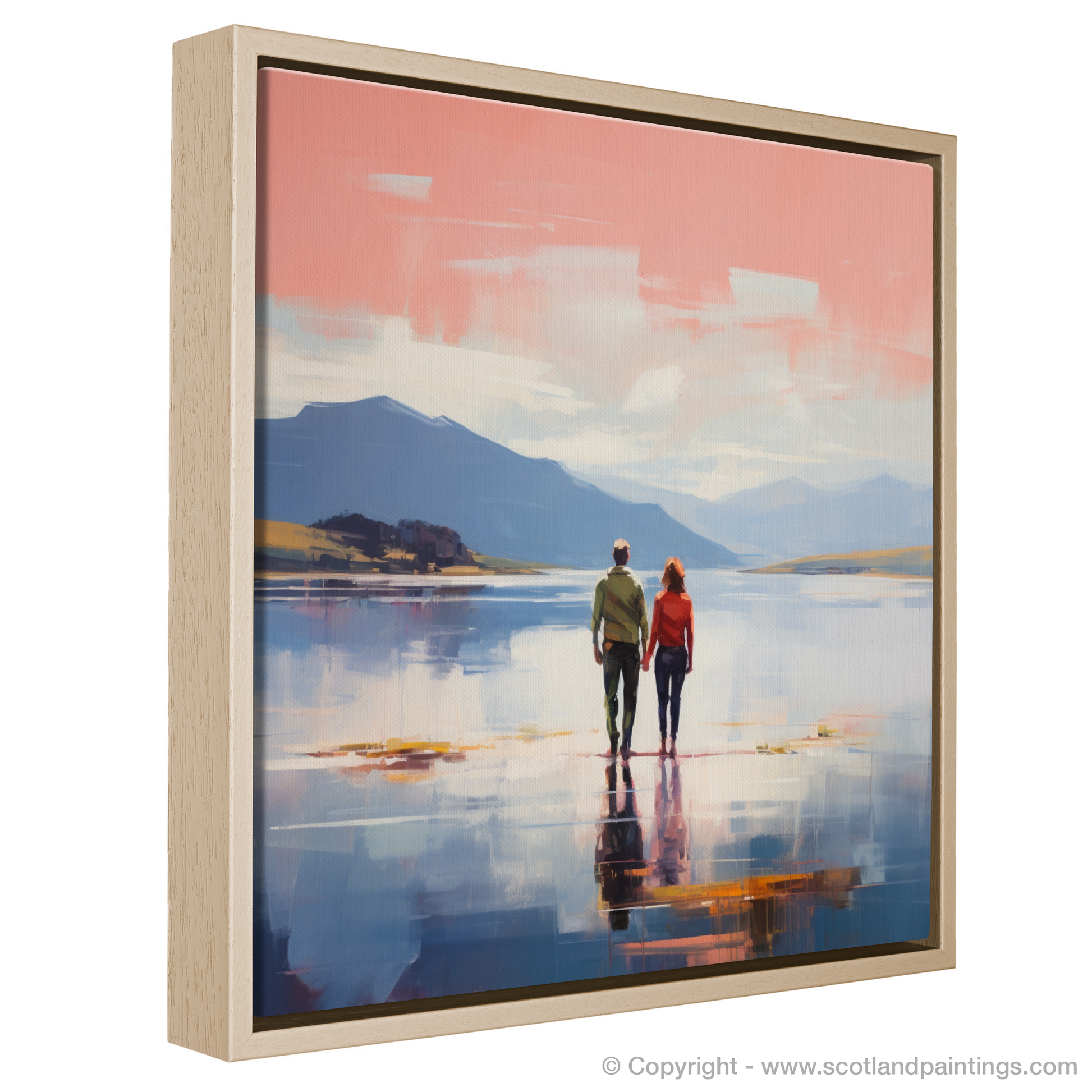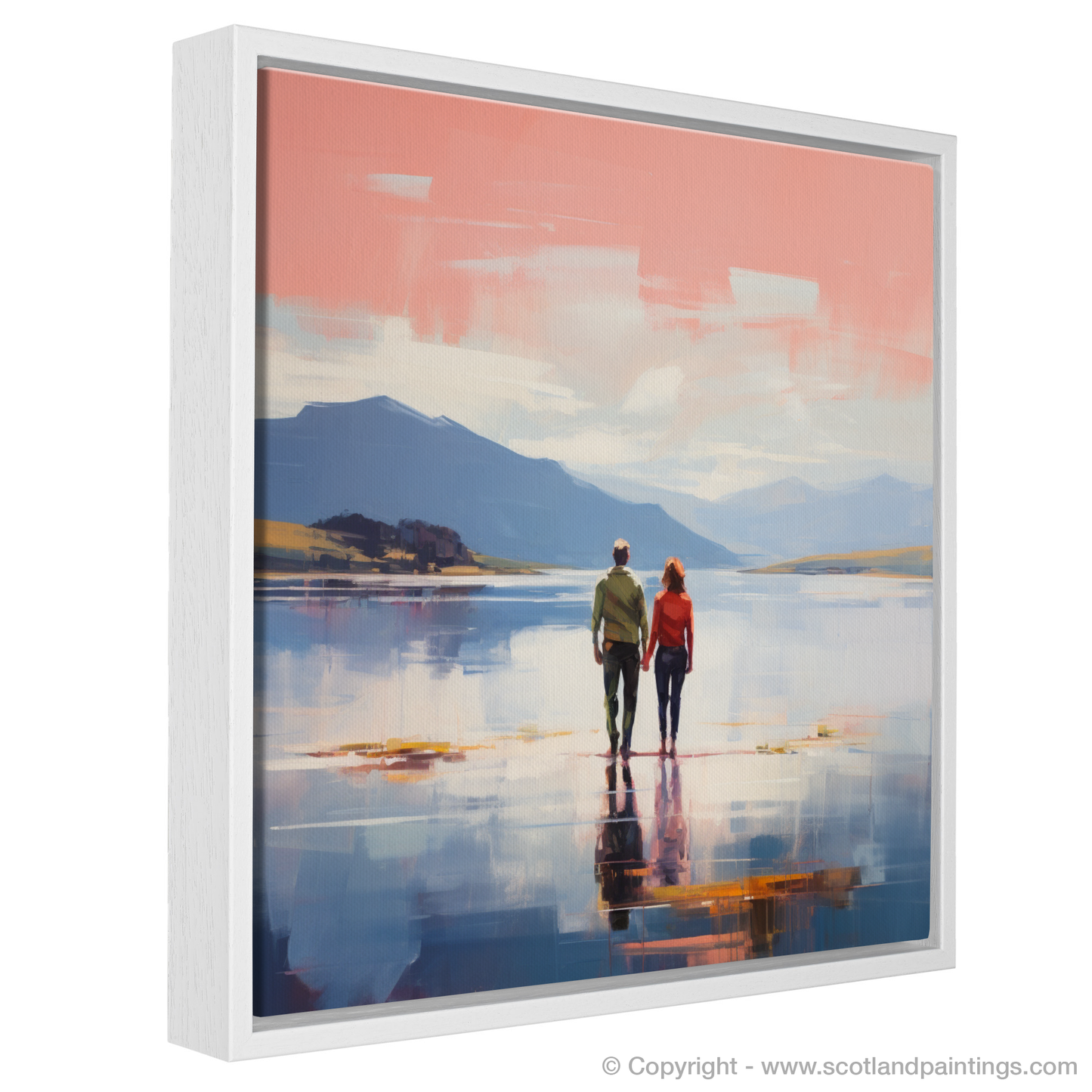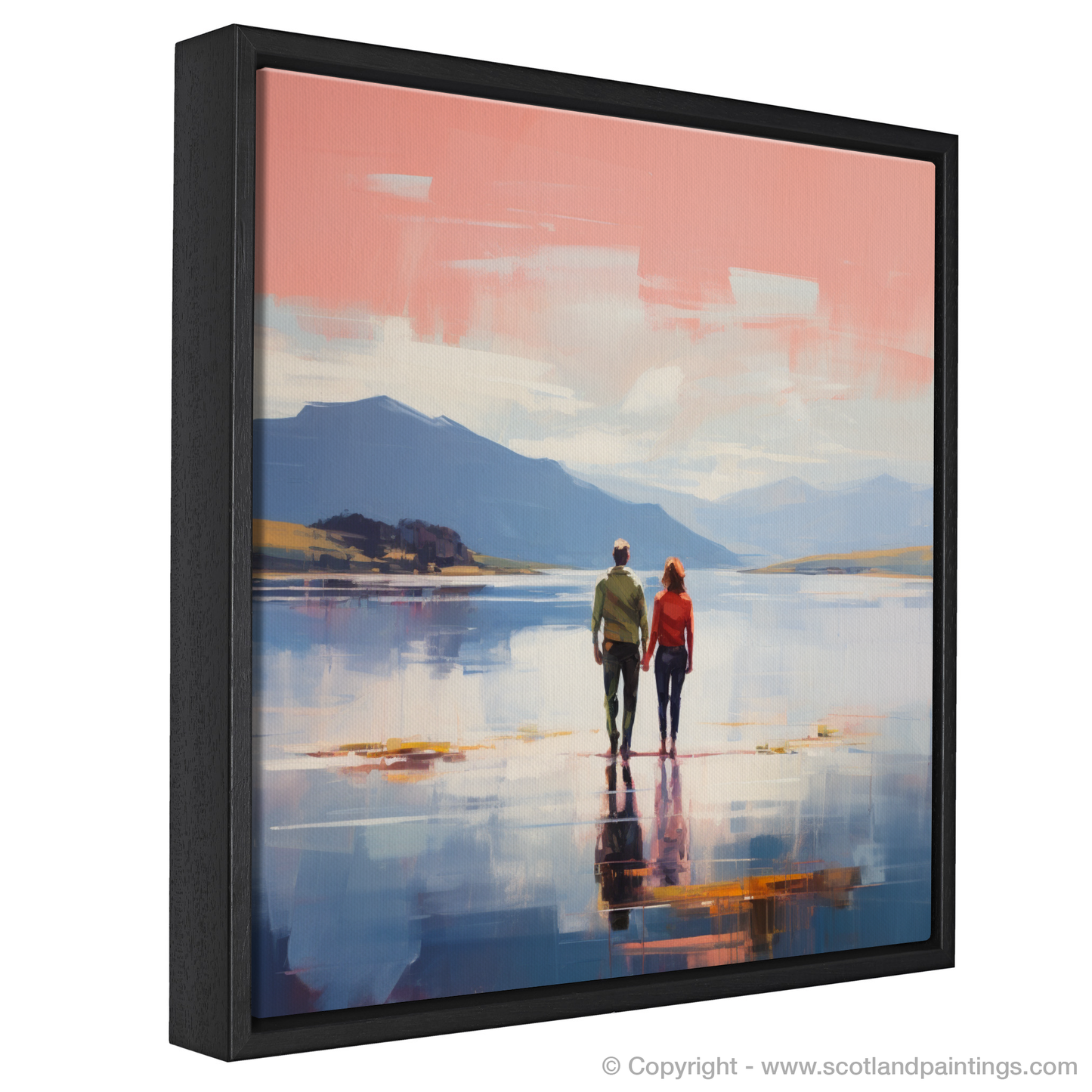 Captured in this evocative print is a serene moment shared by a couple standing hand-in-hand, gazing out across the tranquil waters of Loch Lomond. The artwork, suffused with the essence of contemporary style, depicts the figures in a serene silhouette against a backdrop that celebrates the natural beauty of one of Scotland's most famed lochs.