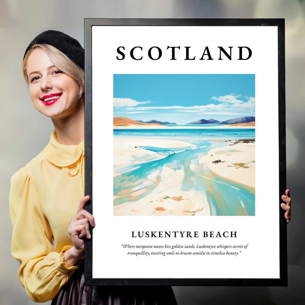 Beneath the painting, in elegant smaller text, is the evocative quote: “Where turquoise waves kiss golden sands, Luskentyre whispers secrets of tranquillity, inviting souls to dream amidst its timeless beauty.” This phrase perfectly encapsulates the serene and almost magical atmosphere of Luskentyre Beach, making the poster not just a visual delight, but also a profound homage to a beloved locale.