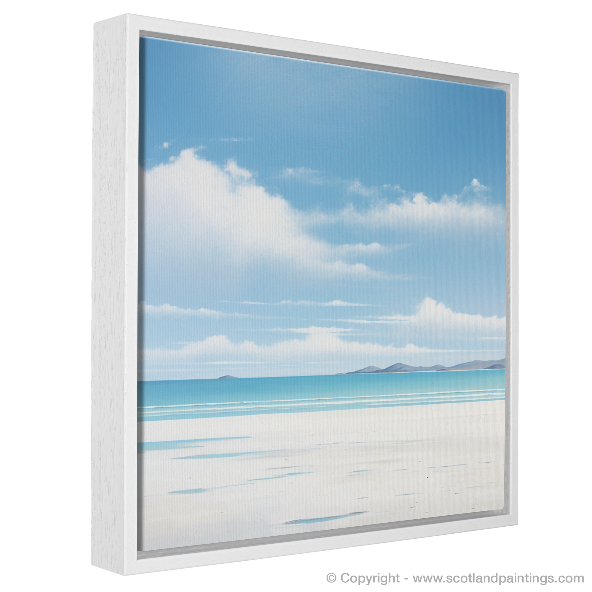 Allow the serene beauty of the Scottish shores to grace your living space with this captivating representation of Luskentyre Beach, located on the Isle of Harris. The artwork's minimalist approach strips away the complexities of busy life, presenting the essence of calm with a harmonious blend of colours and simple forms.