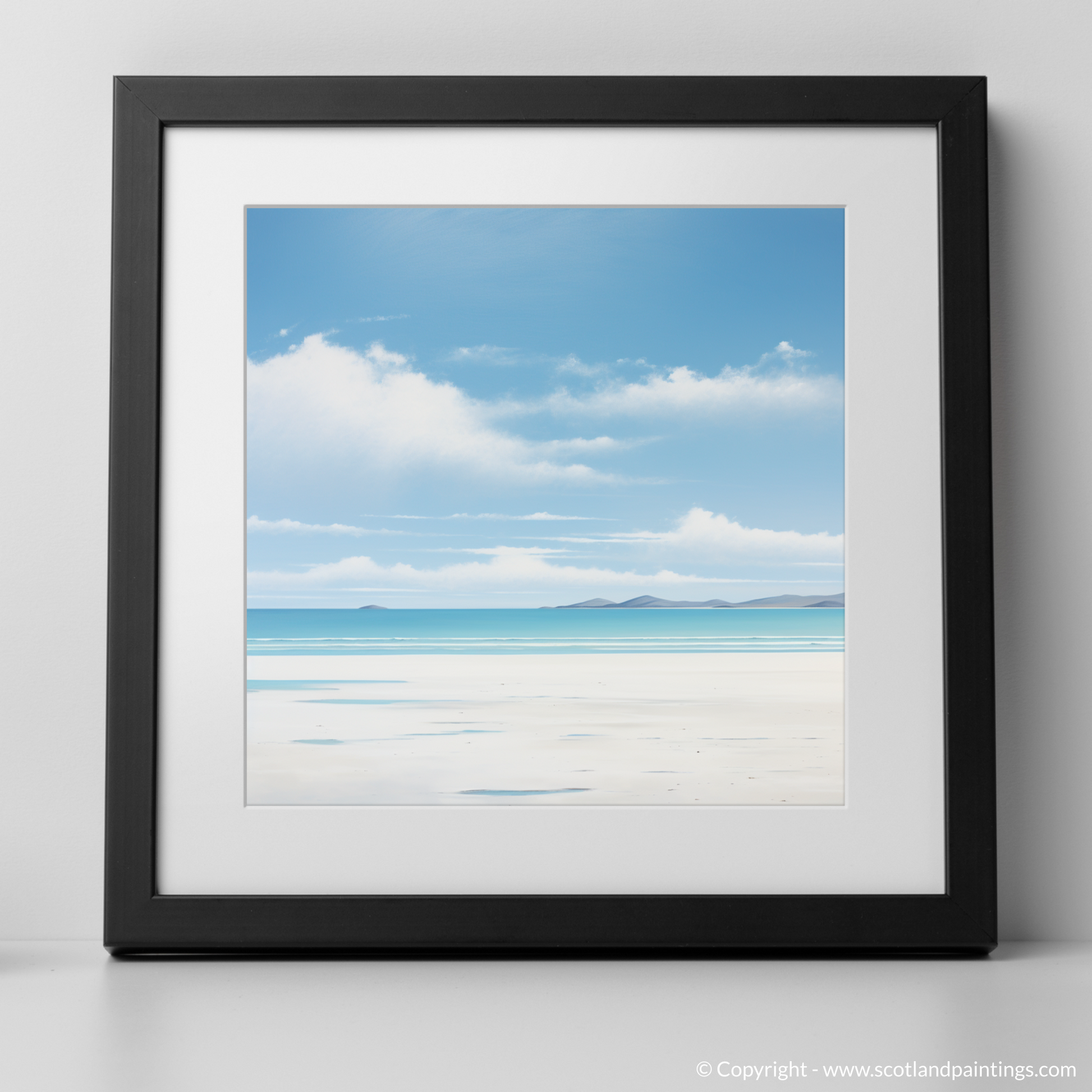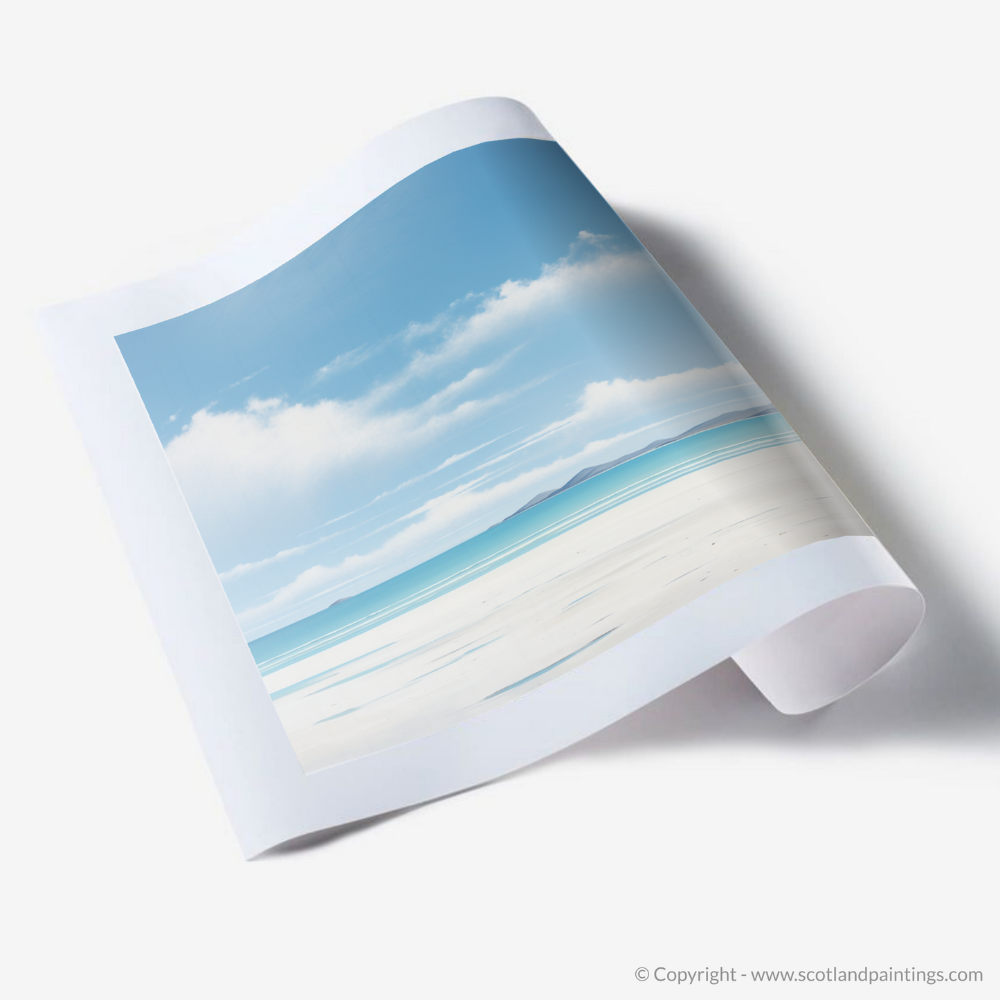 The purity of the composition is further enhanced by the unblemished stretch of sand, rendered with the faintest hints of shadow, invoking the beach's smooth and untouched nature. This soothing palette imbues the print with a dream-like quality, inviting contemplation and a momentary escape to the tranquil shores of Scotland.