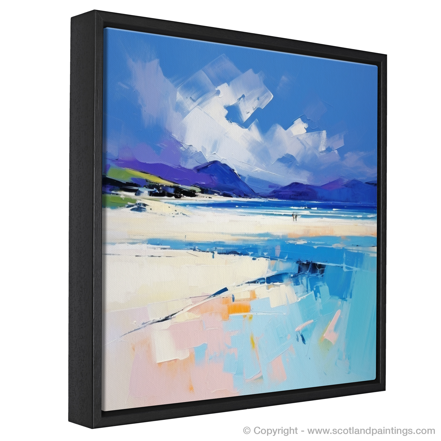 Experience the dramatic beauty of the Scottish coast with this vibrant print, inspired by the mesmerising expanse of Luskentyre Beach, situated on the Isle of Harris. Bold and emotive brushstrokes capture the essence of the rugged landscape, with its spectrum of blues reflecting the dynamic interface between the sea and sky. Hues of cool cerulean and turquoise blend with soft creams and whites, evoking the pristine sands that stretch invitingly beneath a canopy of expansive, cloud-strewn heavens.