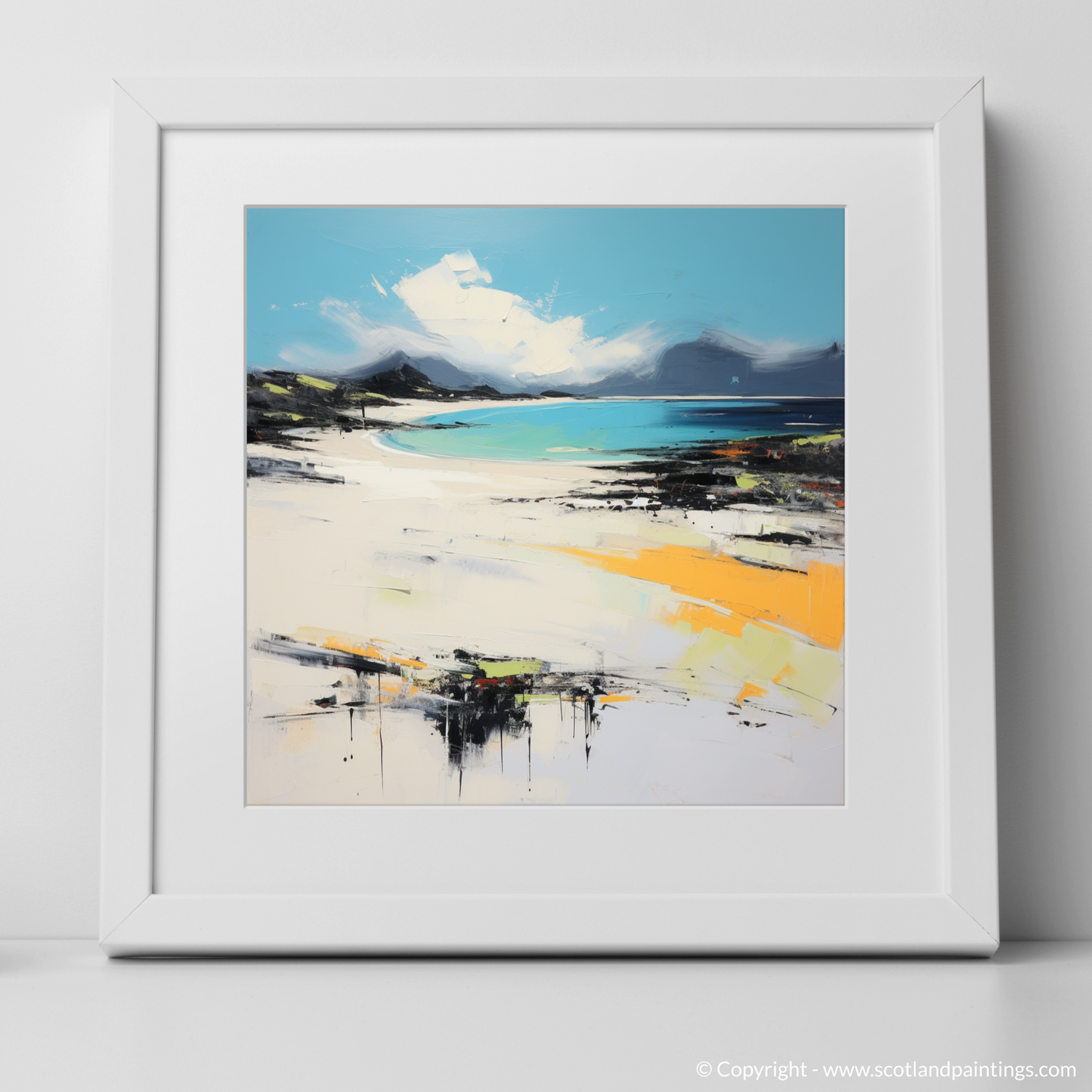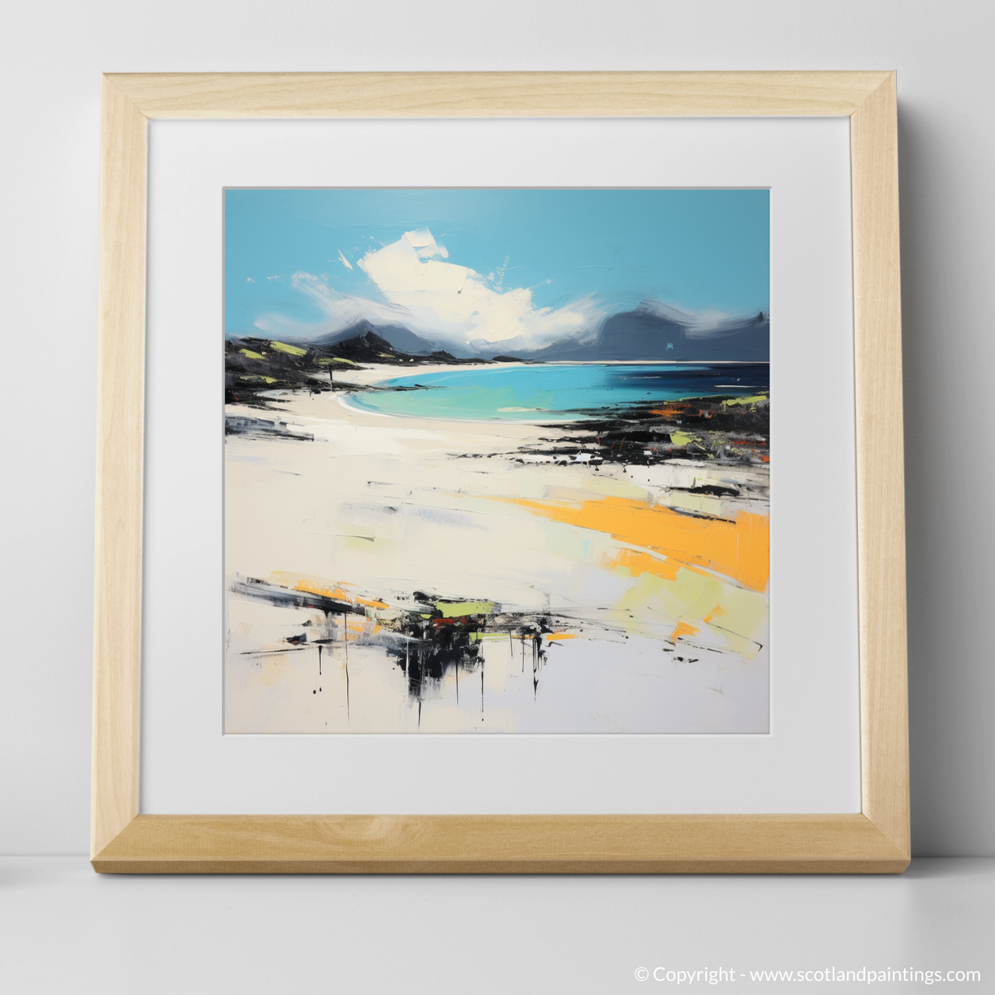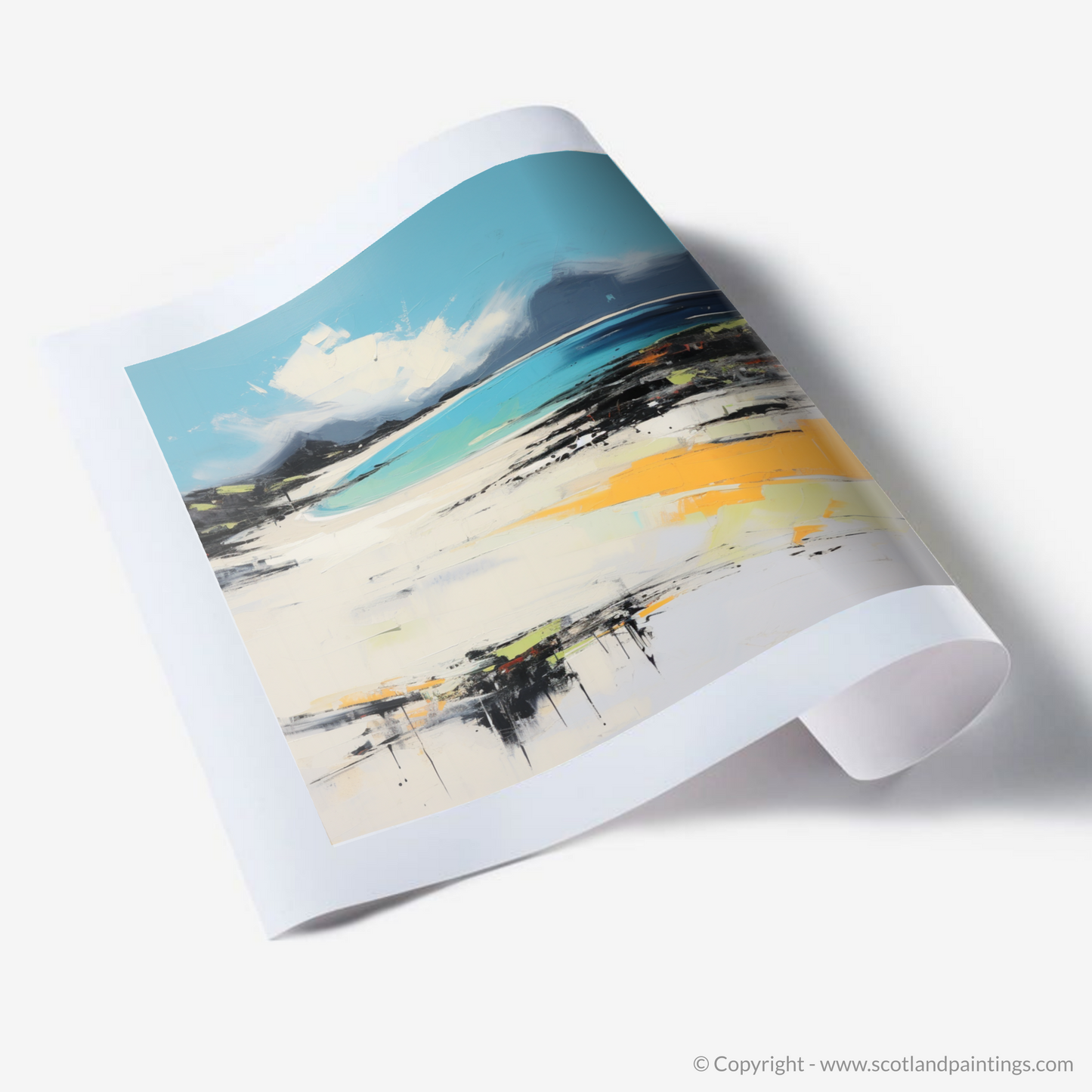 Capturing the essence of Camusdarach Beach in Arisaig, this striking abstract print is a mesmerizing representation of one of Scotland's most picturesque coastal landscapes. The artwork utilises a bold palette of colours, where strokes of cerulean and turquoise blend to evoke the crystal clear waters that wash upon the sandy shores. Hues of ivory and sandy yellows dominate the foreground, reminiscent of the sun-kissed, pristine beach that the area is renowned for.