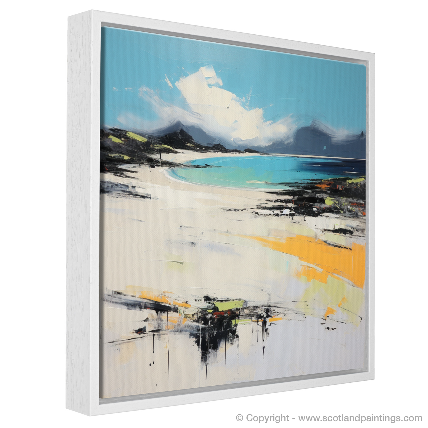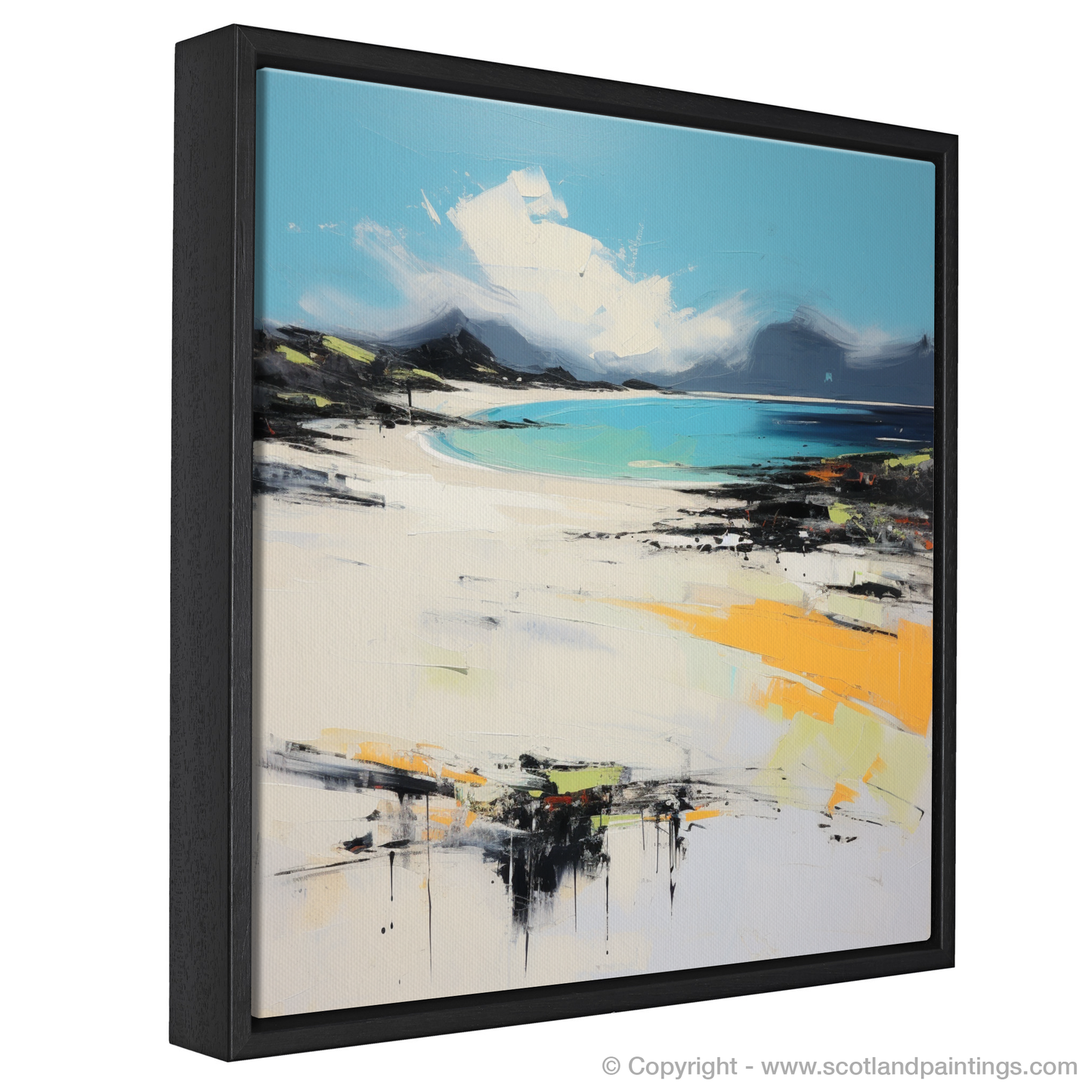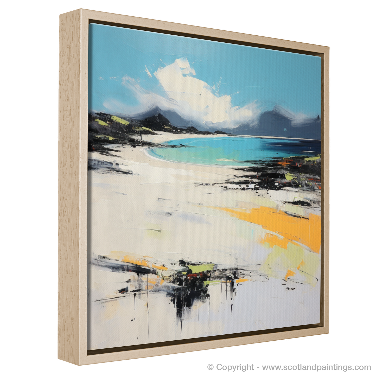 Capturing the essence of Camusdarach Beach in Arisaig, this striking abstract print is a mesmerizing representation of one of Scotland's most picturesque coastal landscapes. The artwork utilises a bold palette of colours, where strokes of cerulean and turquoise blend to evoke the crystal clear waters that wash upon the sandy shores. Hues of ivory and sandy yellows dominate the foreground, reminiscent of the sun-kissed, pristine beach that the area is renowned for.