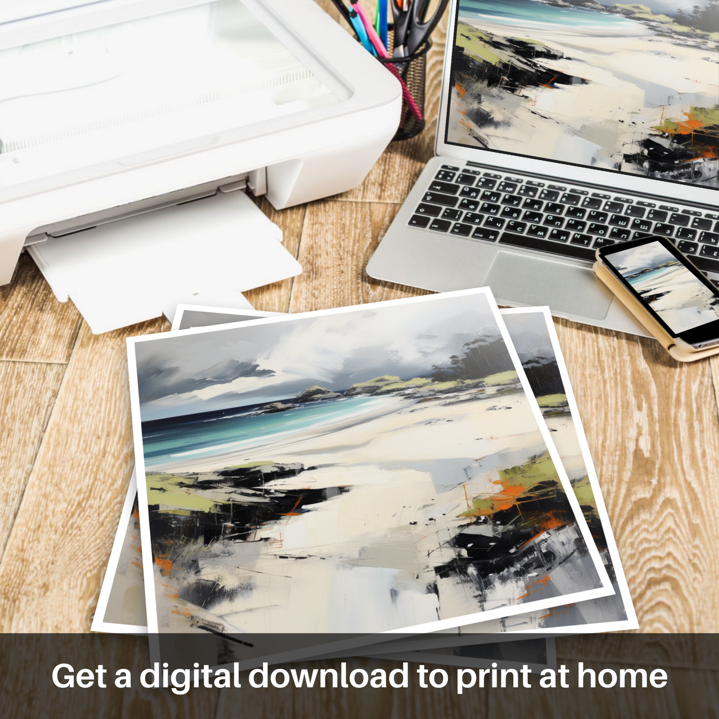 Capture a slice of the serene Scottish coastline with this evocative abstract print, inspired by the majestic Camusdarach Beach in Arisaig. With its sweeping blend of textures and colours, the artwork conveys the rugged beauty of this cherished shoreline.