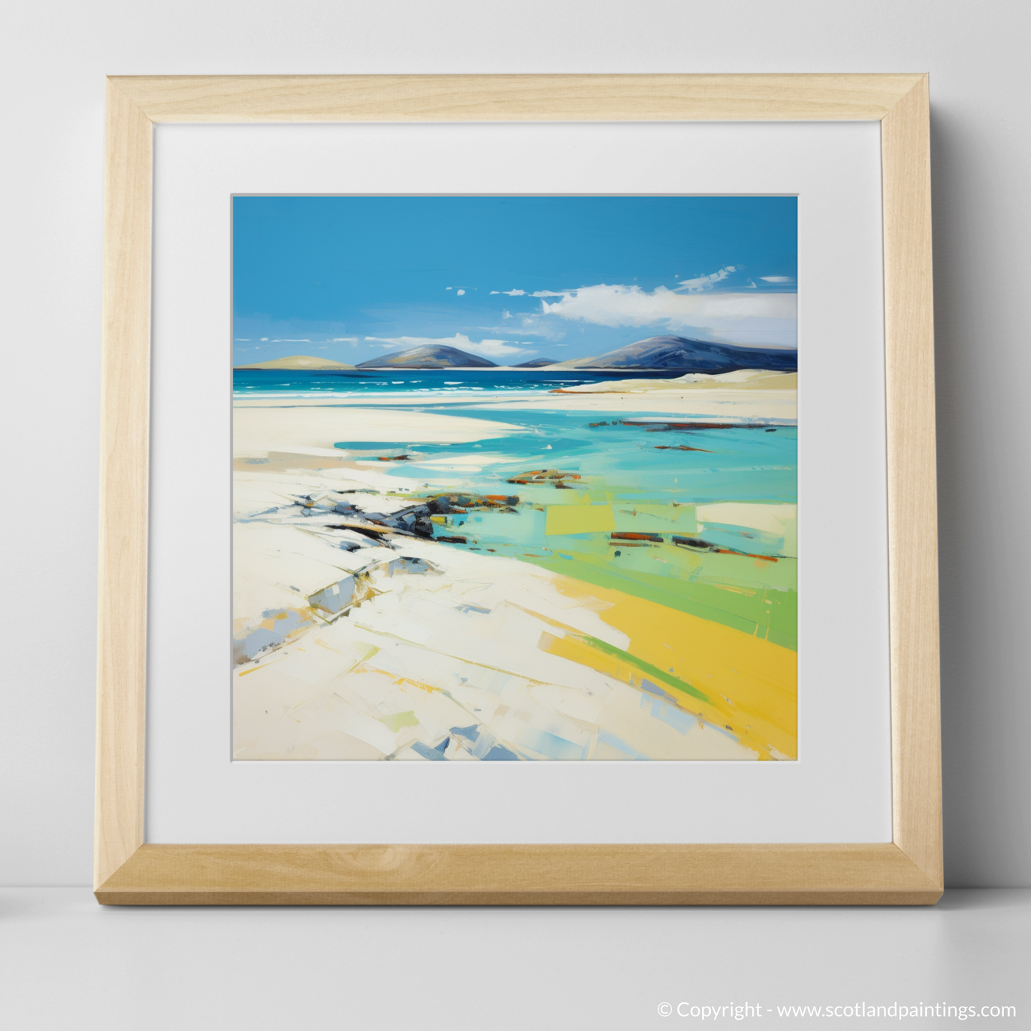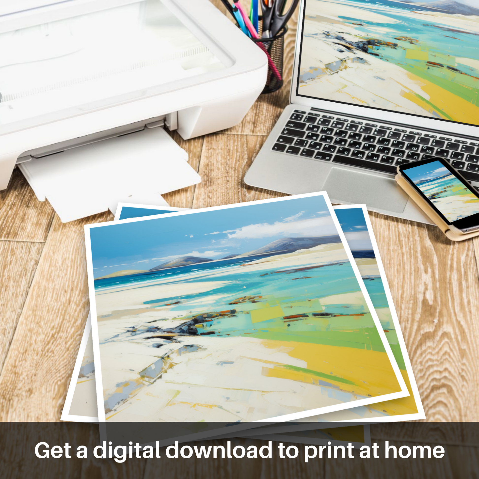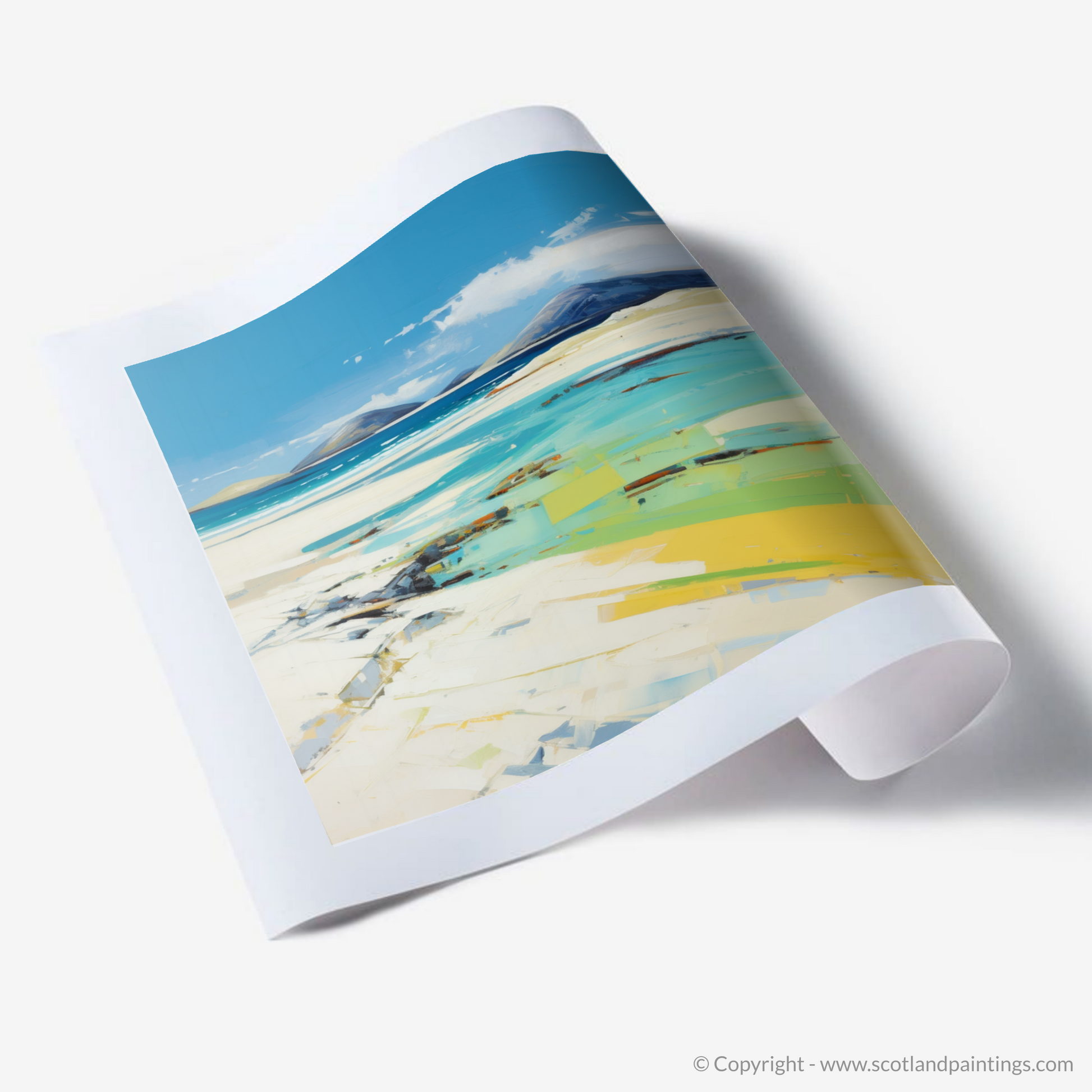 Capture the essence of the rugged natural beauty of Scotland with this captivating print, inspired by the breathtaking Luskentyre Beach on the Isle of Harris. The artwork showcases a stunning contemporary interpretation of the pristine white sands and clear turquoise waters that make this location one of the most picturesque beaches in Scotland.