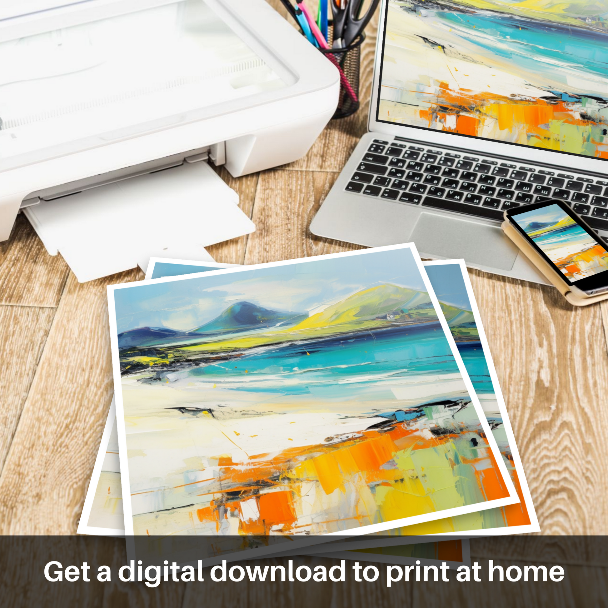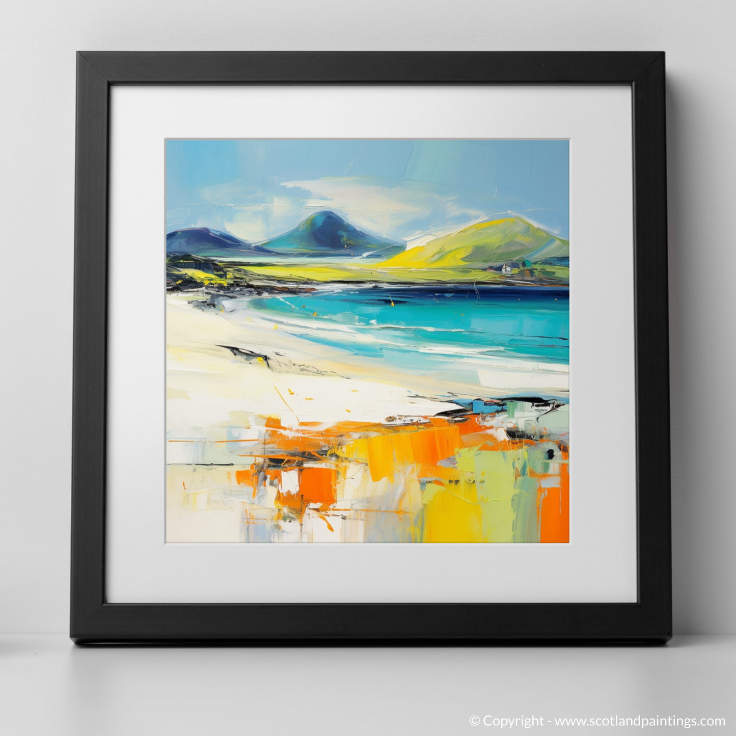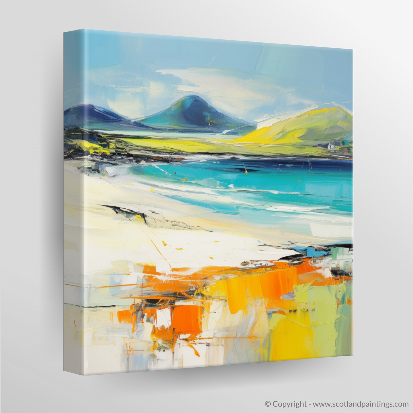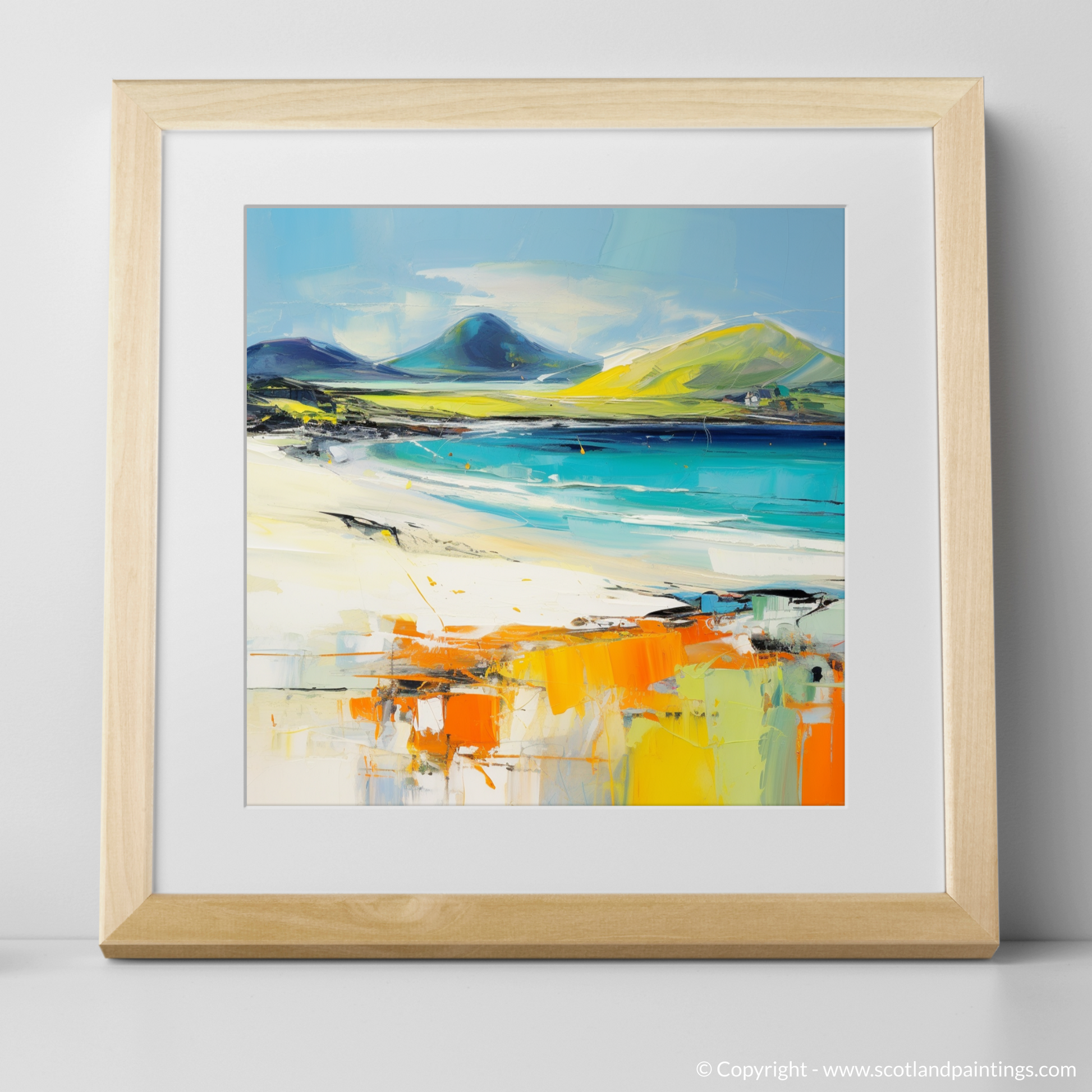 Capturing the untamed spirit of Luskentyre Beach on the Isle of Harris, this expressive piece evokes the raw beauty of the Scottish coastline through a dynamic abstract expressionist lens. The composition is a symphony of vivid colour and energetic brushstrokes that merge to form a visual ode to this beloved beach.