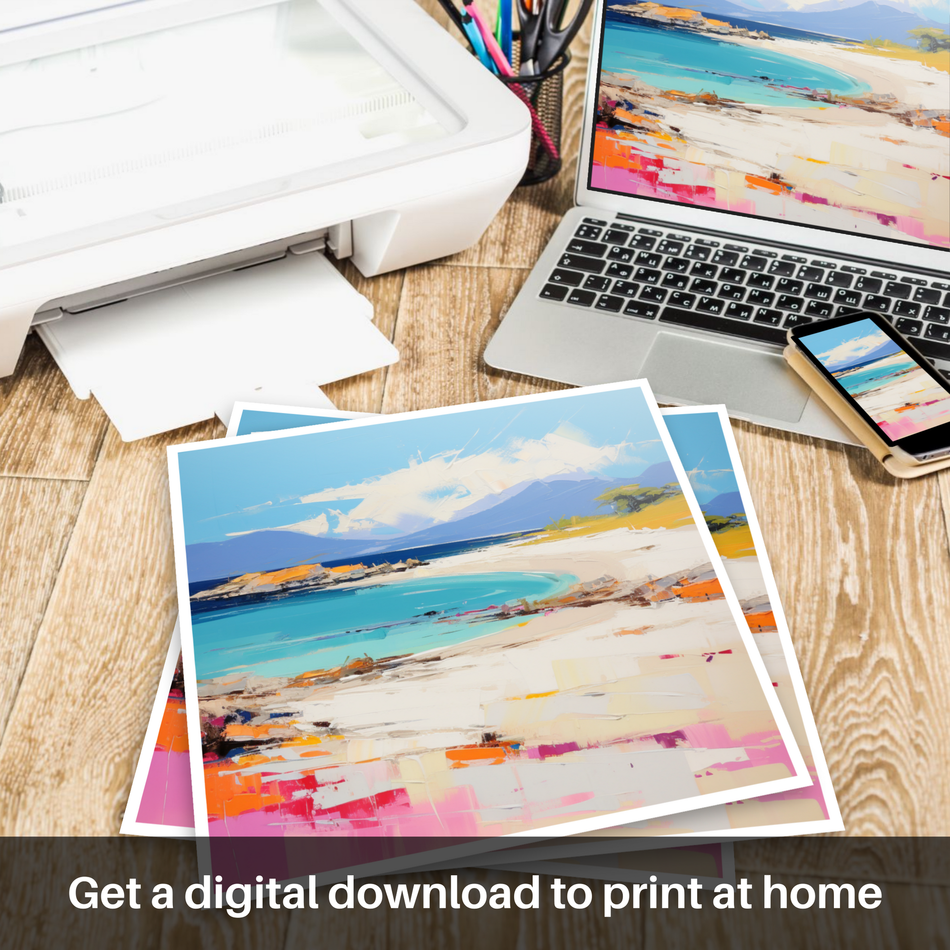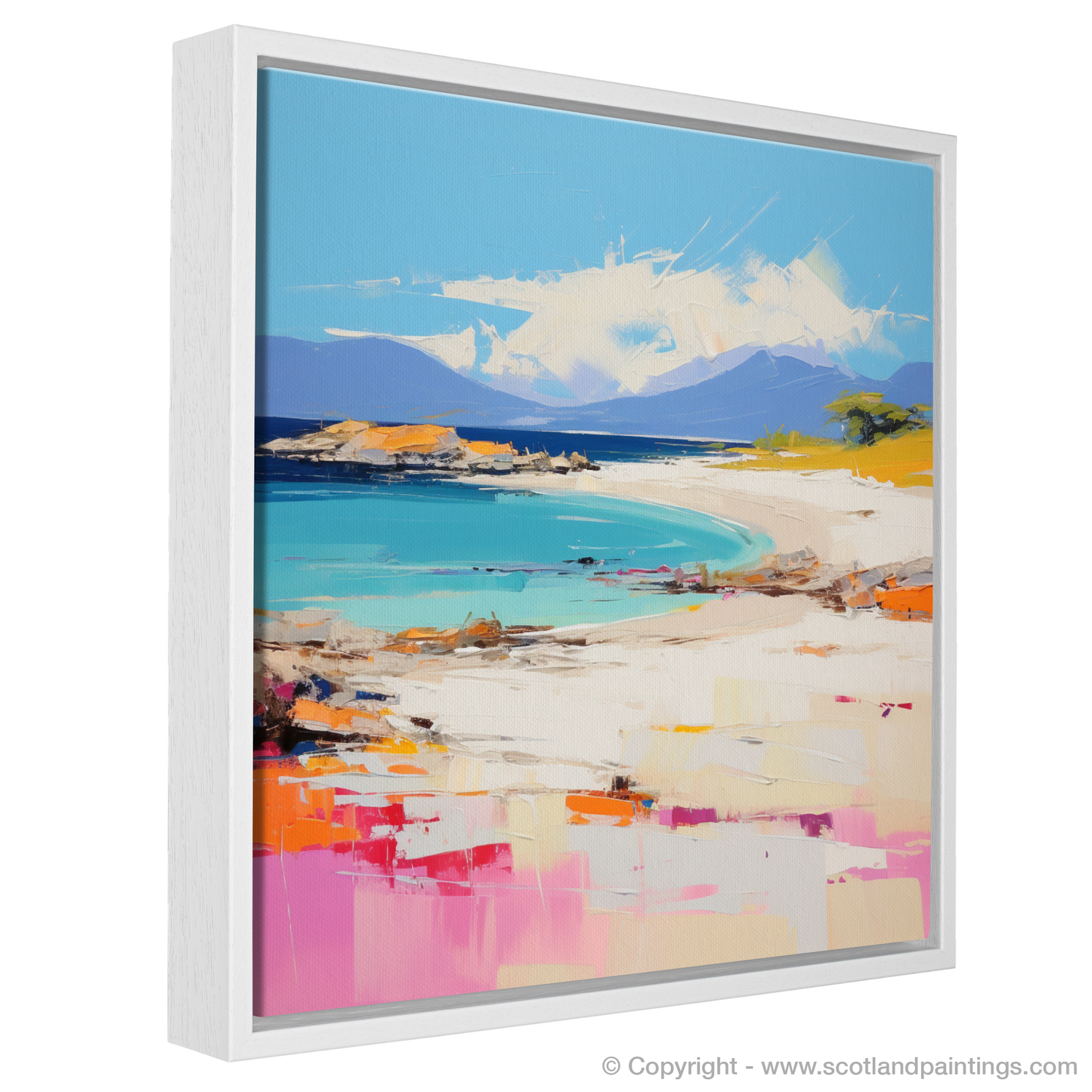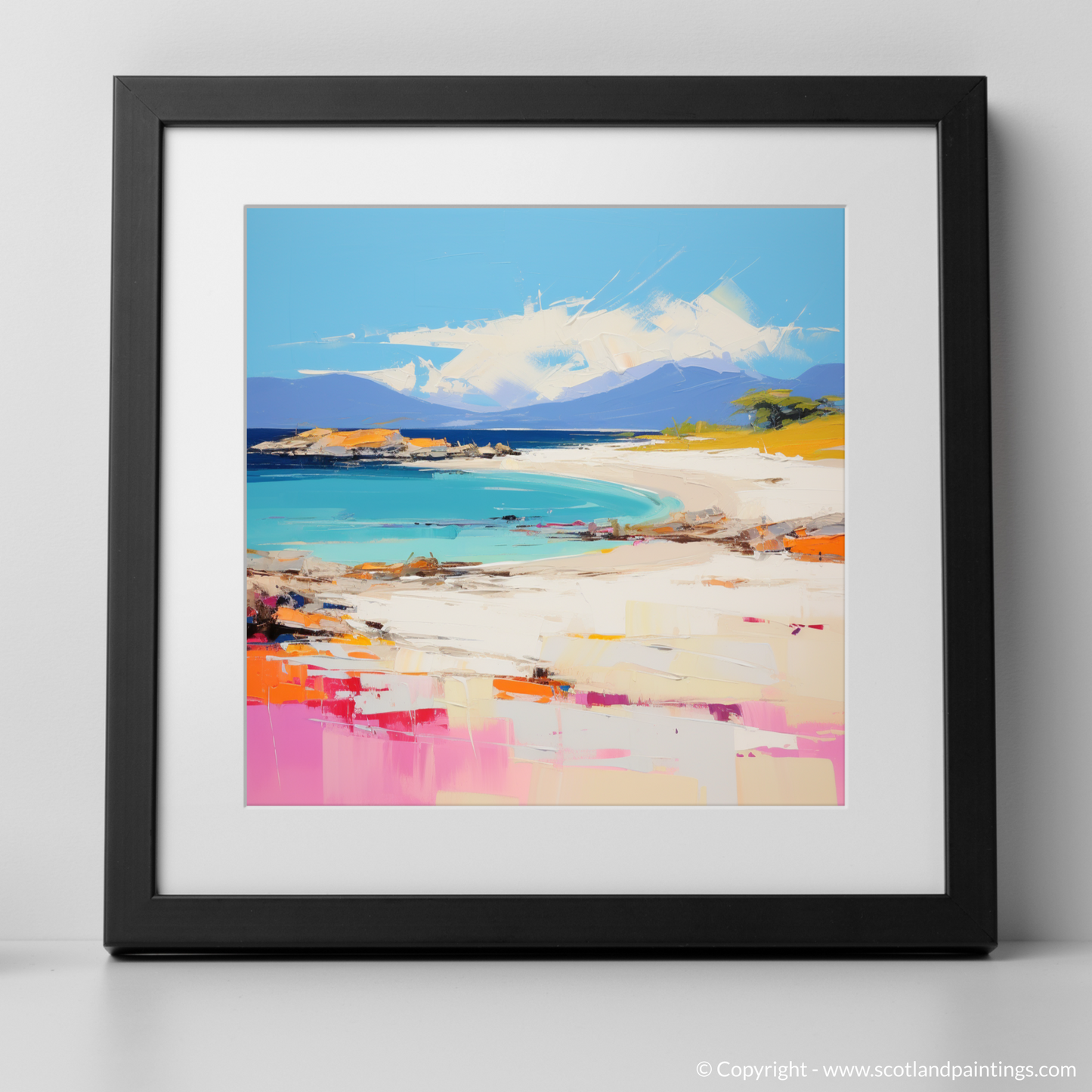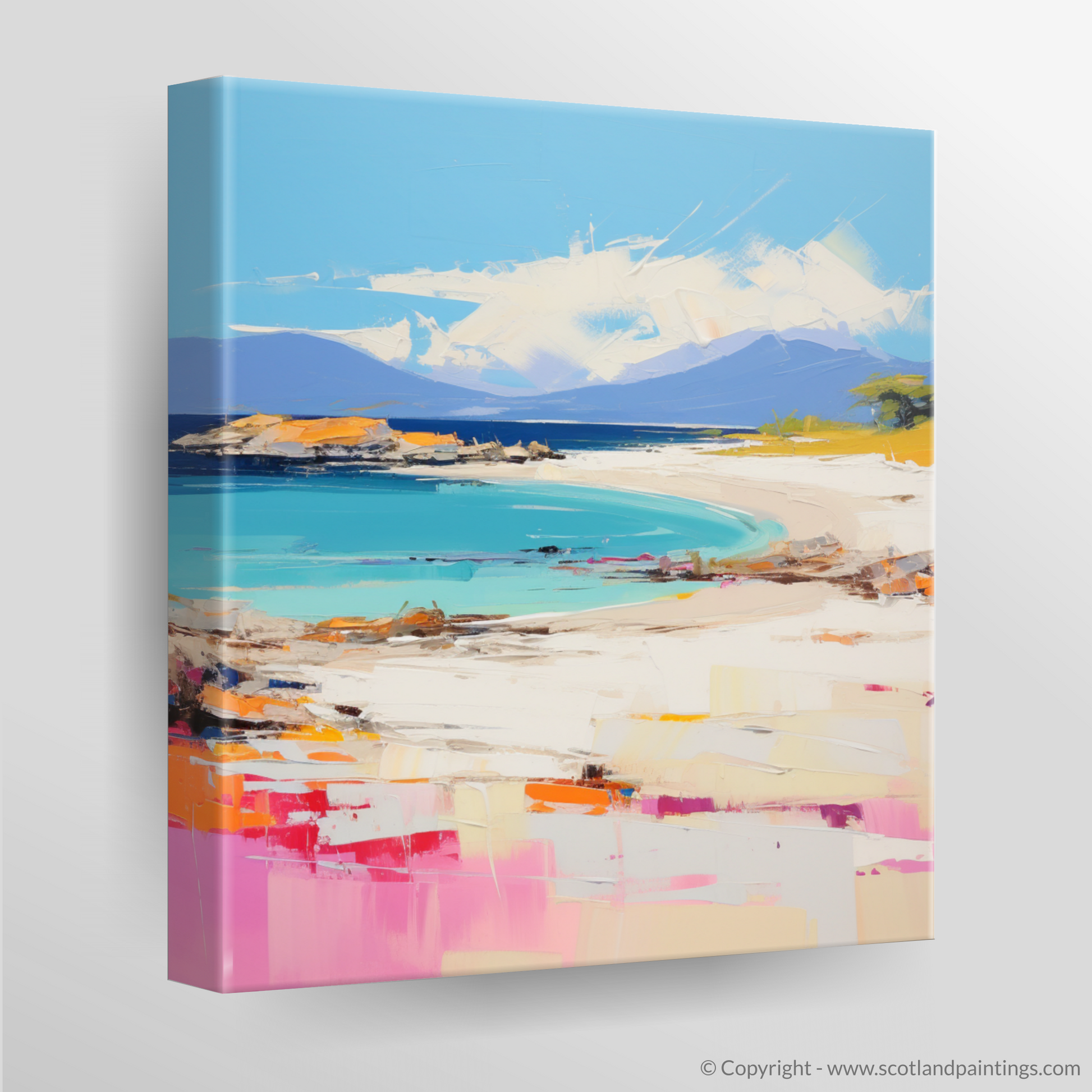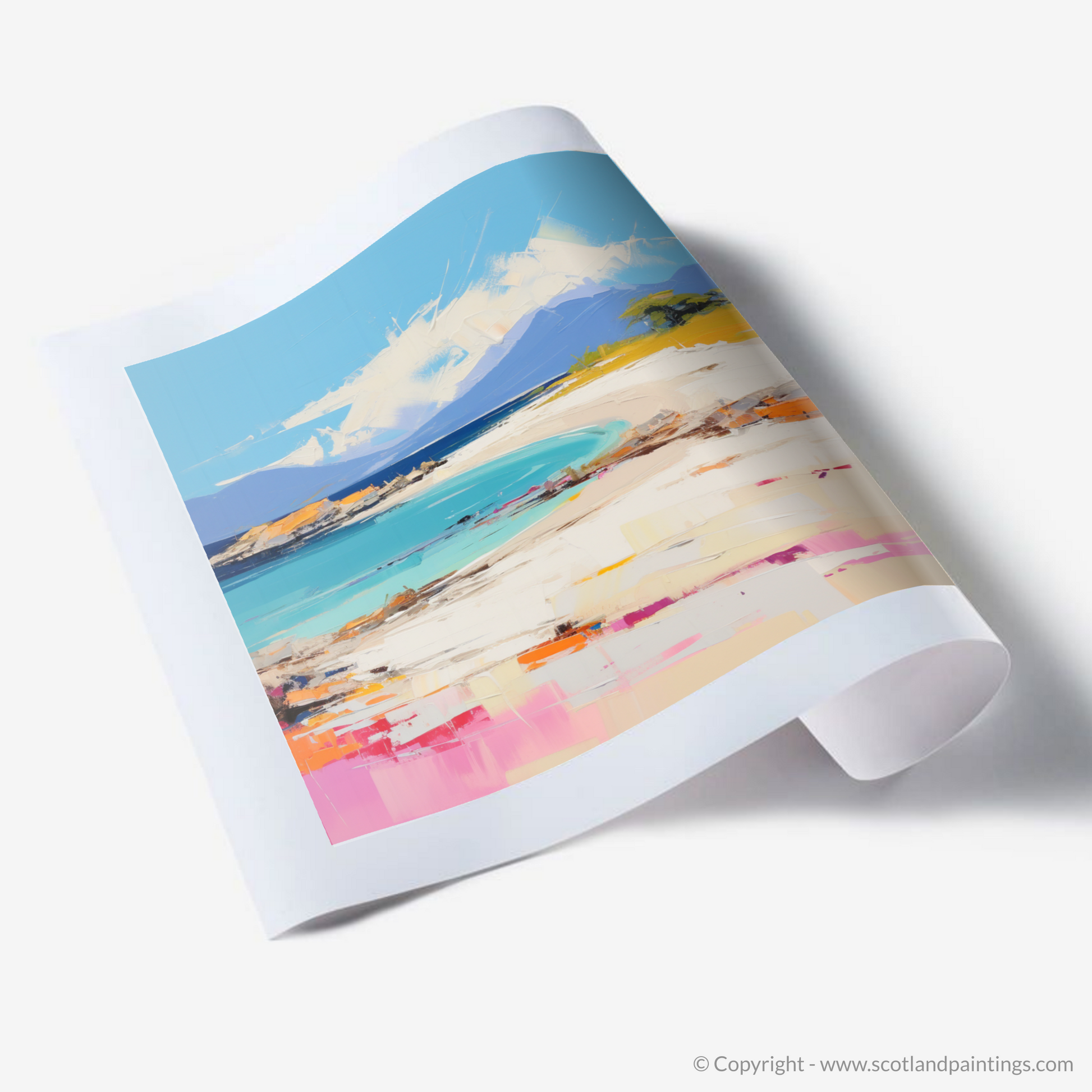 This captivating print captures the essence of Camusdarach Beach in Arisaig with a vibrant contemporary twist. Brushstrokes in vivid hues of turquoise, azure, and pastel blues create an inviting expanse of sea that seamlessly blends into the horizon. The shoreline is a lively dance of textures, where the pale golden sands meet dabs of coral pink and splashes of tangerine warmth. Artful hints of emerald green foliage suggest coastal grasses whispering in the breeze.