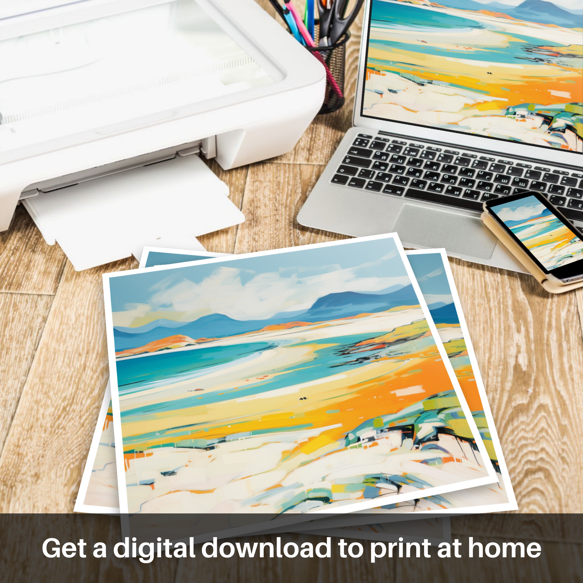 This print is a contemporary take on the classic beach scene, offering viewers an abstract journey through the colours and moods of Luskentyre Beach. It becomes a statement piece that can bring a touch of the Scottish coast's wild and unspoiled beauty into any space.
