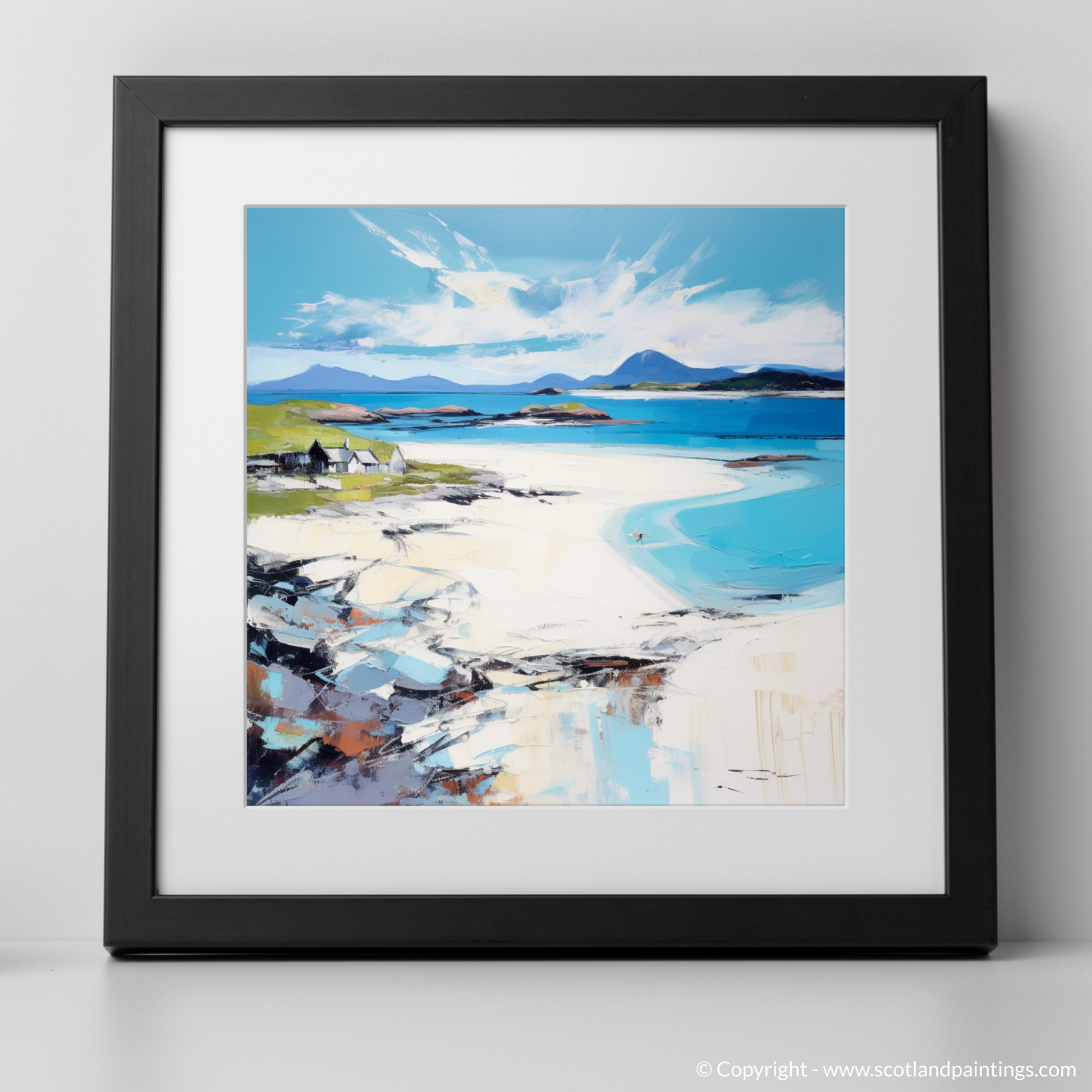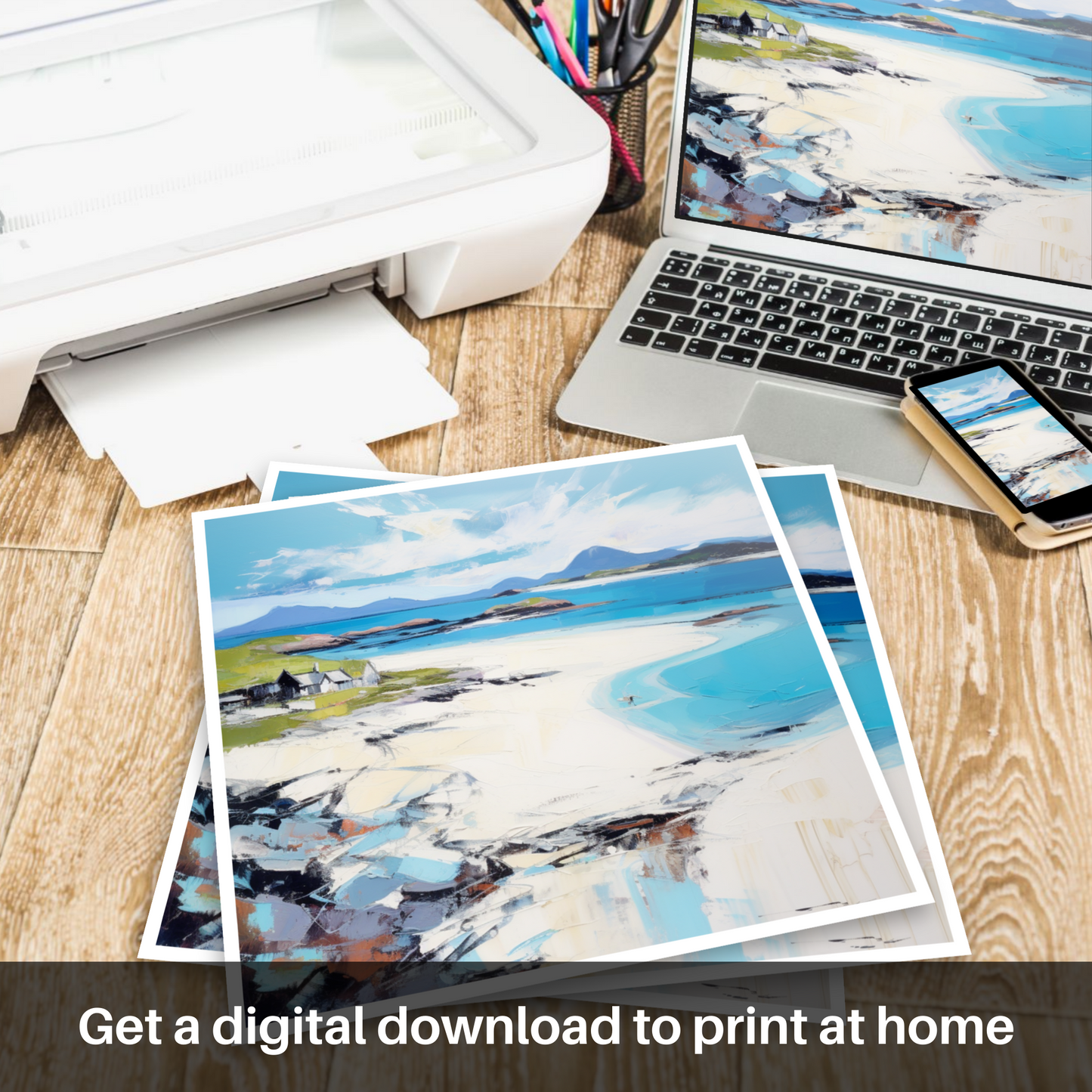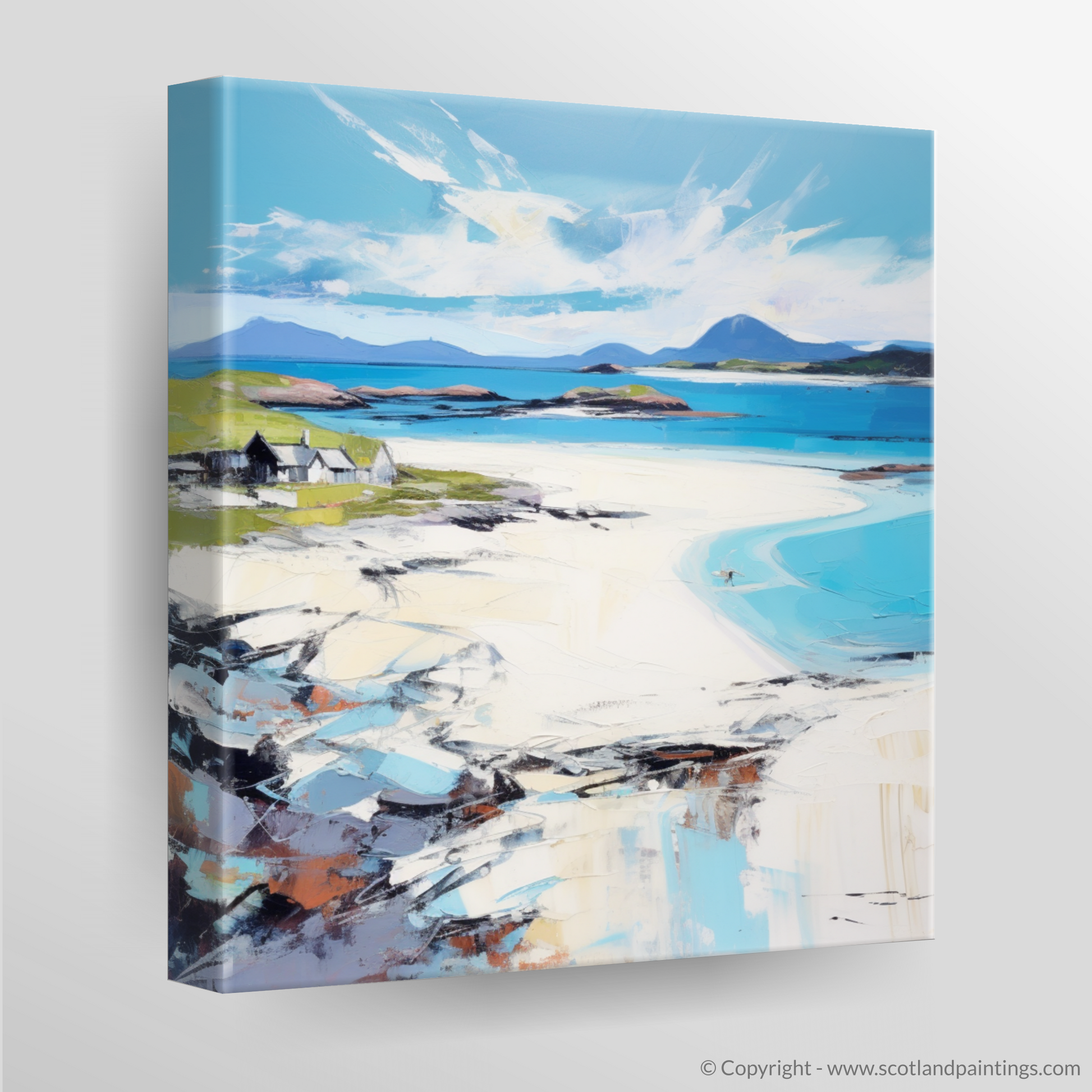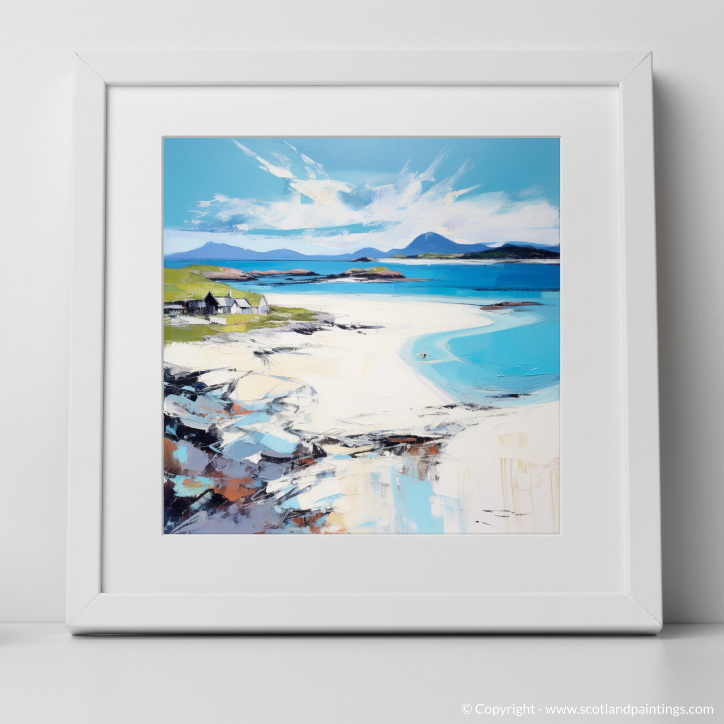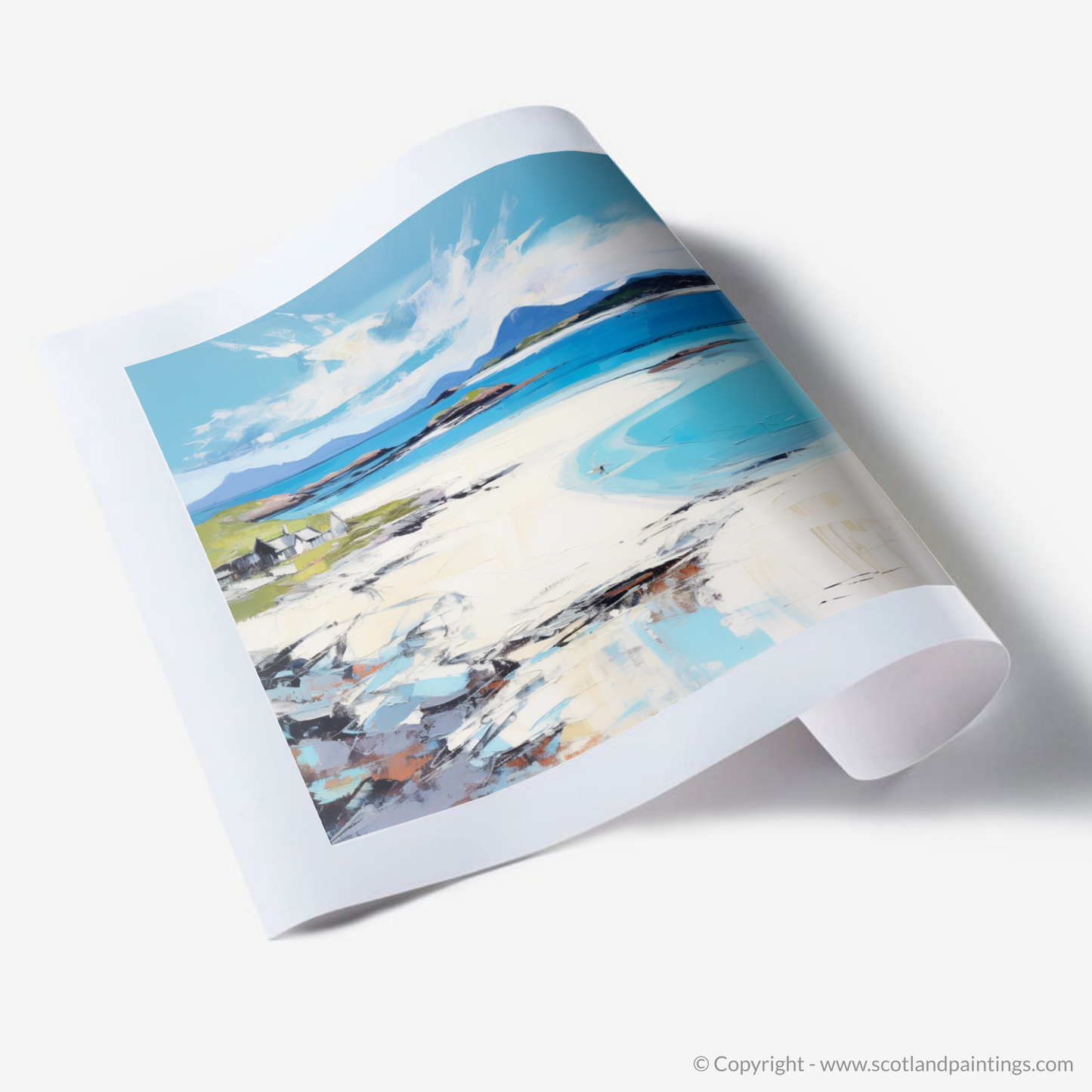 The artwork vividly presents a panoramic view of the beach, with azure waters meeting a sweeping shoreline that fades into the distance. The stark white sands form a striking contrast against the kaleidoscope of blues, capturing the interplay of light and shadow unique to the Scottish coast. In the distance, the majestic outlines of islands rise from the sea, their shapes softened into the horizon.