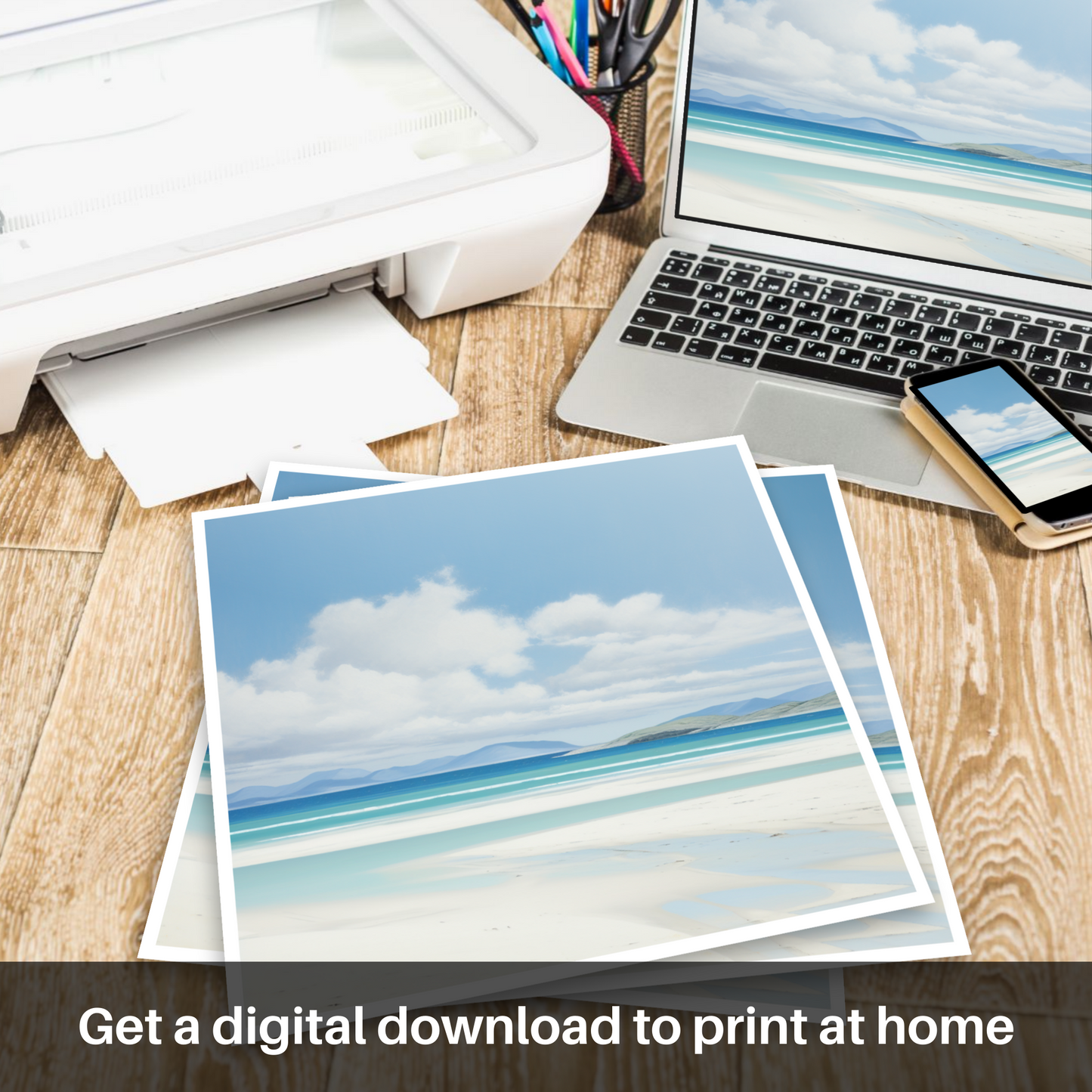 Each hue in the palette has been carefully selected to not only reflect the natural colours one would encounter at Luskentyre Beach but also to convey a minimalist aesthetic that evokes a sense of space and tranquillity. This print is perfect for anyone who cherishes the understated beauty of the Scottish shores and appreciates the purity of minimalist art. It serves as a gentle reminder of the calm and restorative powers of nature's landscapes.