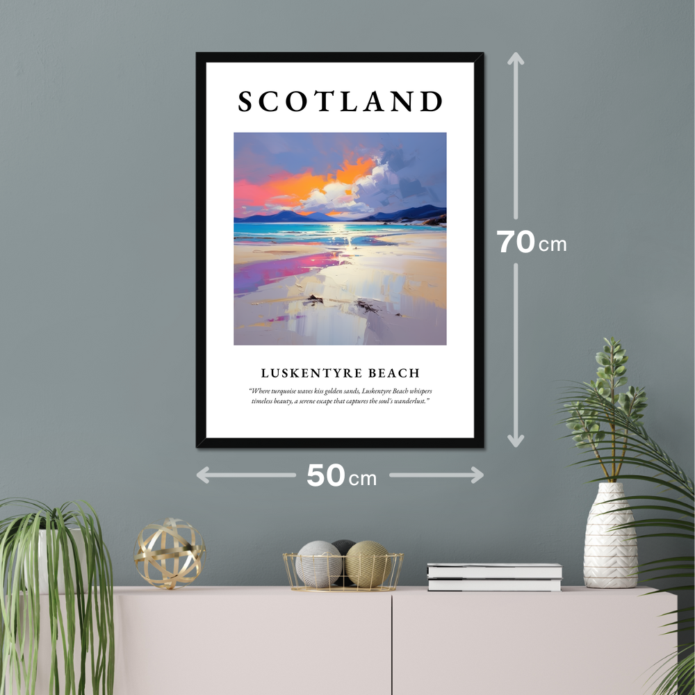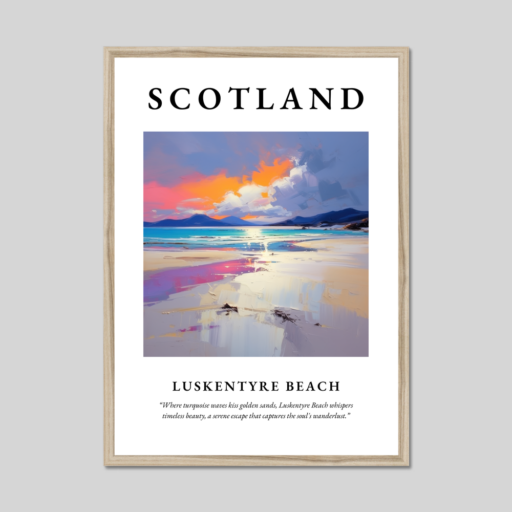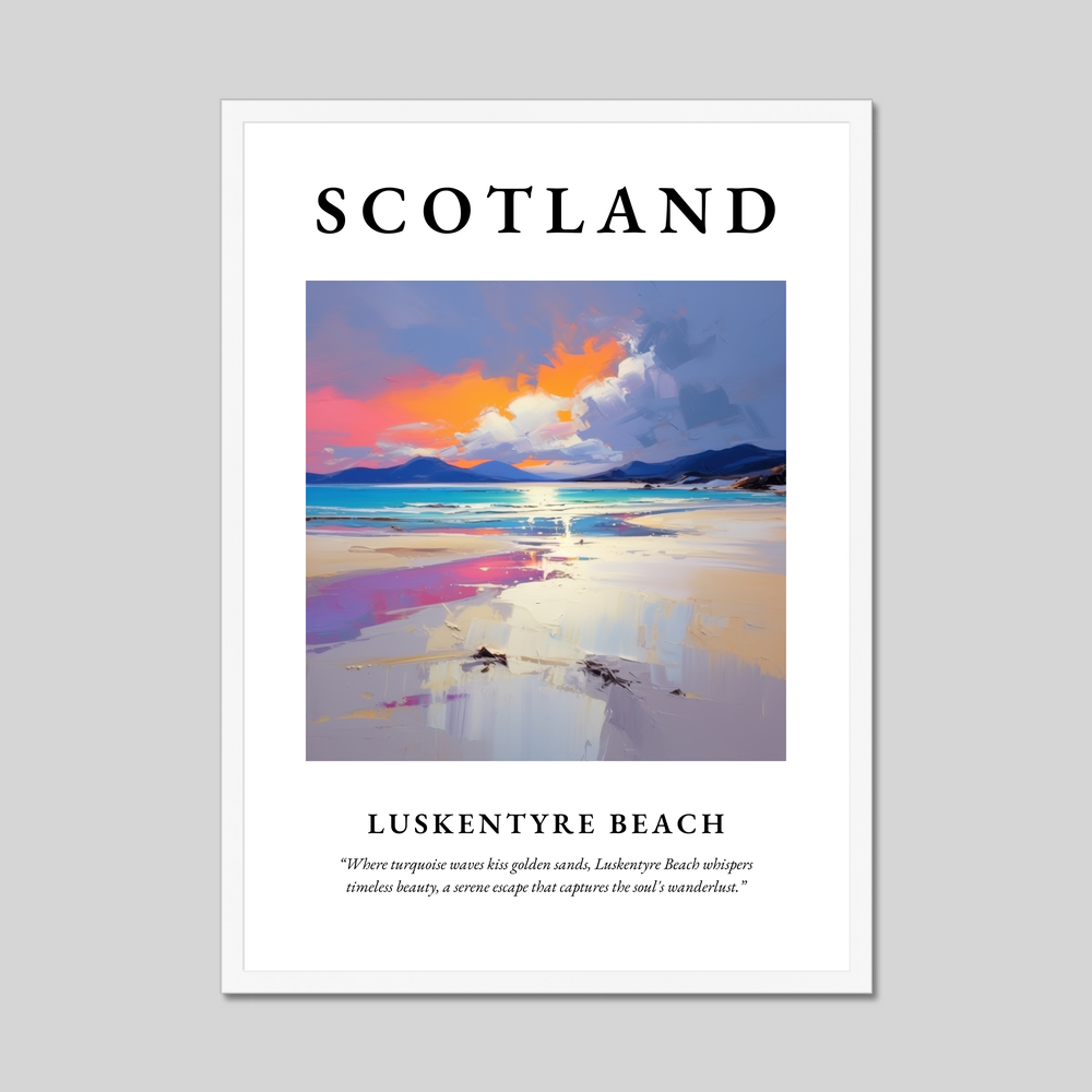 Available in a choice of black, white, or natural wood-effect frames, this poster complements any decor with its timeless aesthetic. The painting is a vibrant expression of Luskentyre Beach, where cool turquoise waves gently lap against golden sands. Strokes of orange and pink hues dance across the sky, evoking the serene beauty of a Scottish sunset. Beneath the painting, discover the inspiring quote: "Where turquoise waves kiss golden sands, Luskentyre Beach whispers timeless beauty, a serene escape that captures the soul's wanderlust."